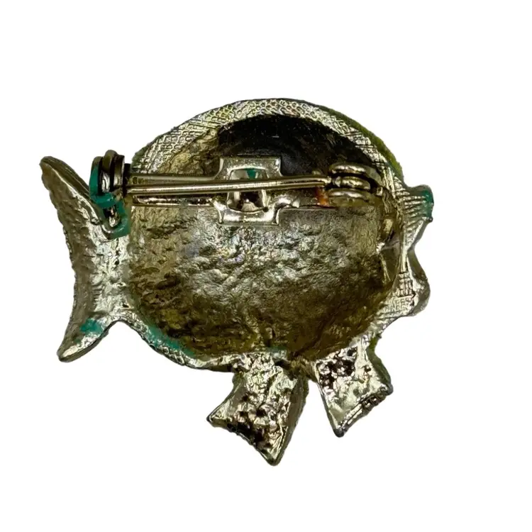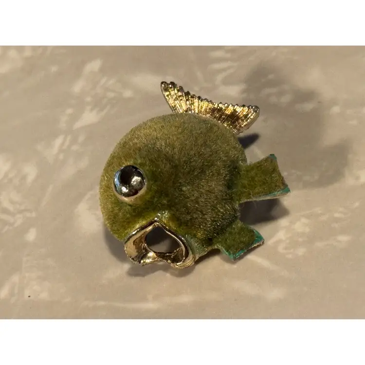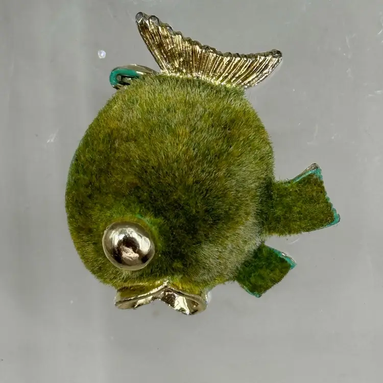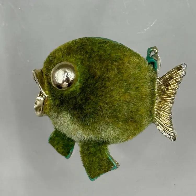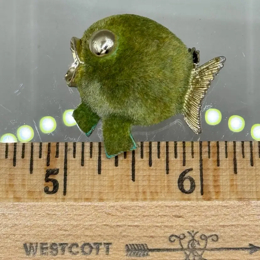 This special little brooch measures 1" but packs a lot of attention with the green color and the flocked body. In good condition other than some discoloration on parts of the edging of the brooch.
