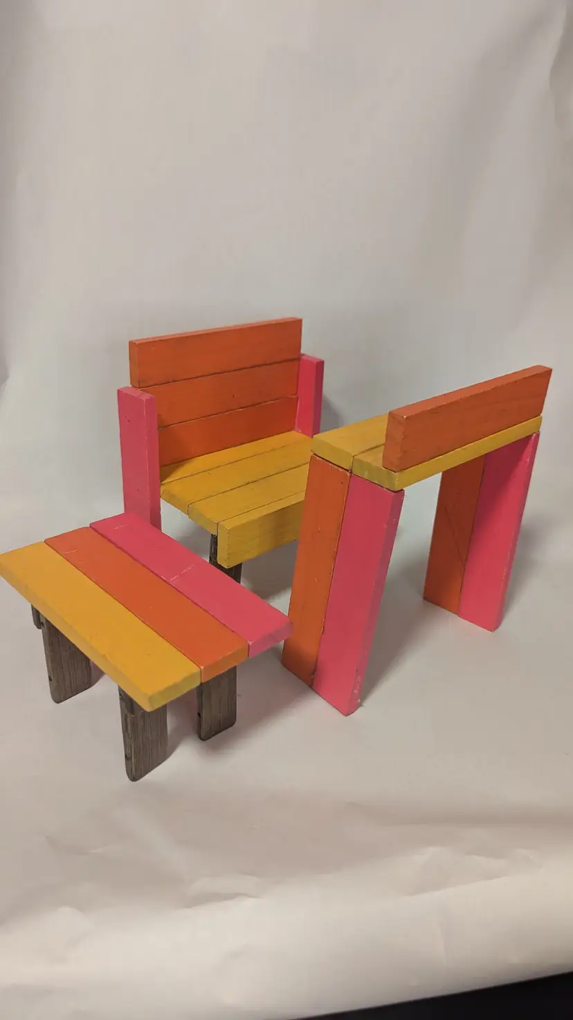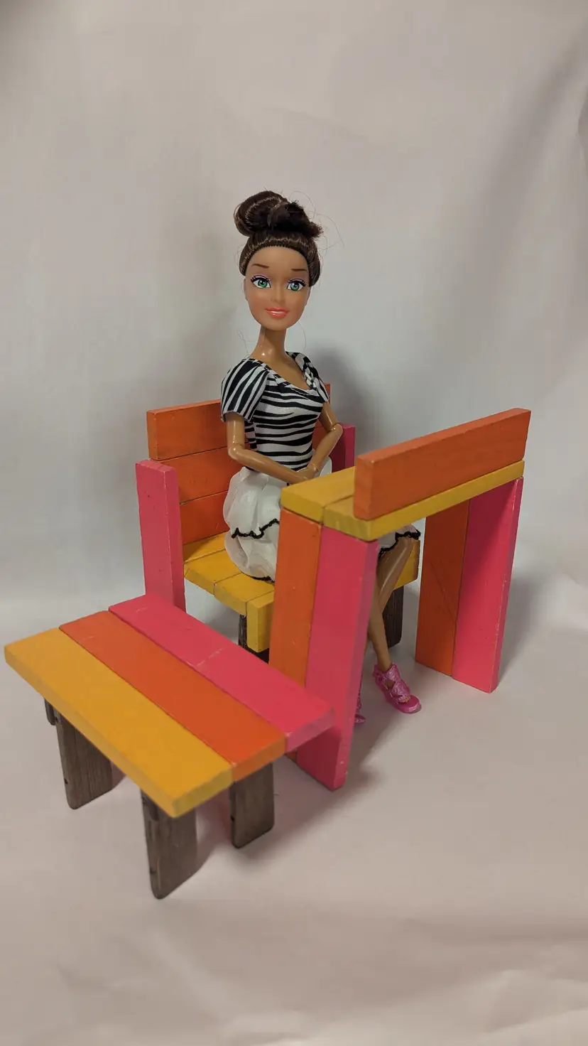 These handmade toy doll furniture pieces are made from recycled blocks. You get coordinated wooden pieces that are suitable for 11.5" dolls. The blocks are used and irregular. The bright colors are cute and fun!