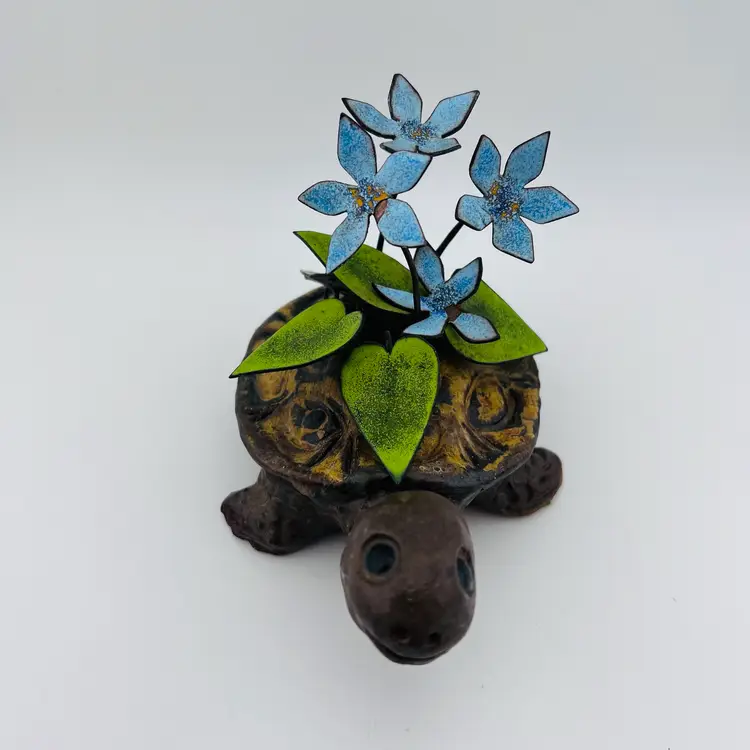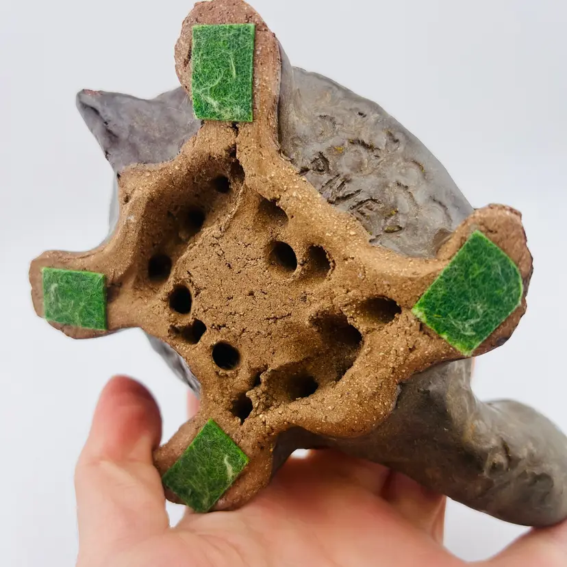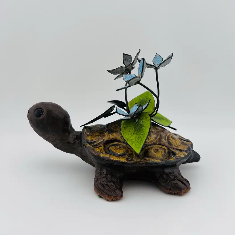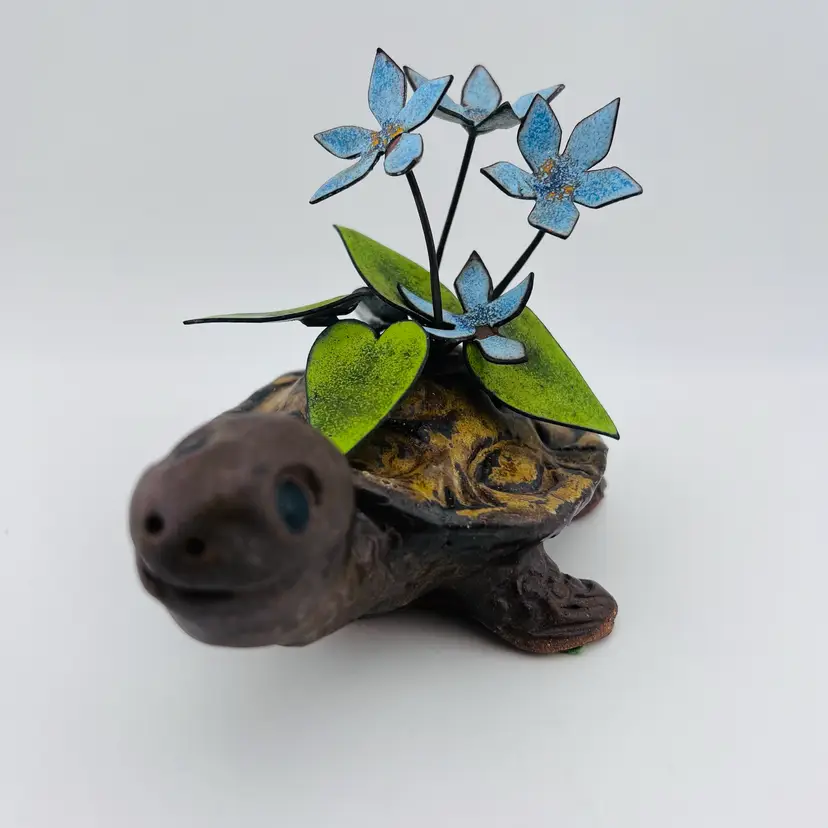 This might be my favorite thing I’ve ever found!! handmade and signed “Spivey”. Not in perfect condition, one foot looks a little like his toes got swiped off and he has a little bit of blue paint on his face. There is also some wear to the metal enamel flowers in a few spots. The flaws add character in my opinion and are not that noticeable to me but definitely wanted to point it out. 🩷