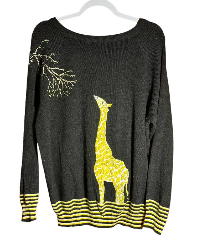 Super cute acrylic sweater featuring an embroidered giraffe and tree. Has some piling/fuzz. In GVUC. Measurements- P2P and width throughout :24” Length: 27.5”