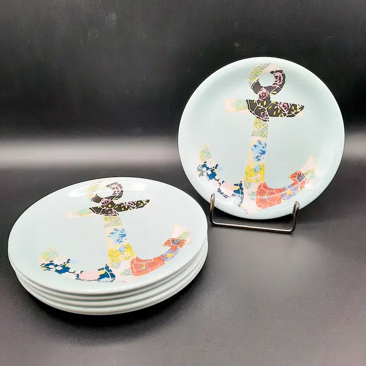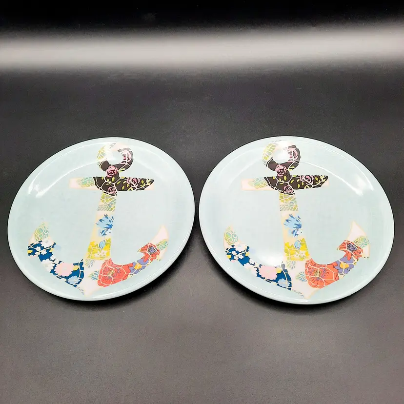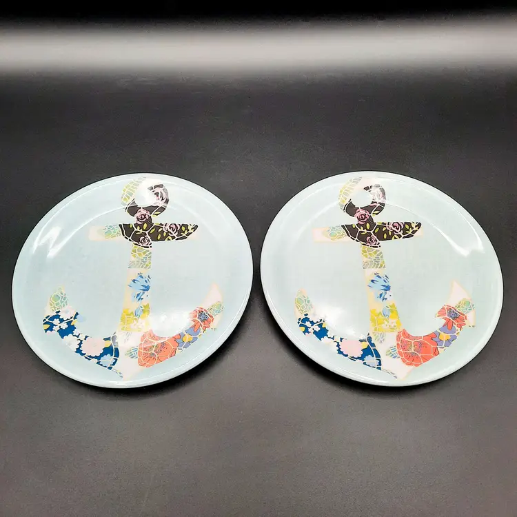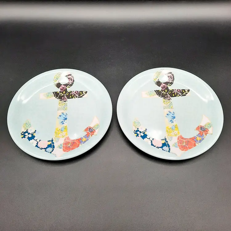 Fun set of 6 melamine plates are 6 3/4"W in great condition with light wear/utensil marks.