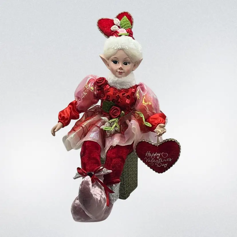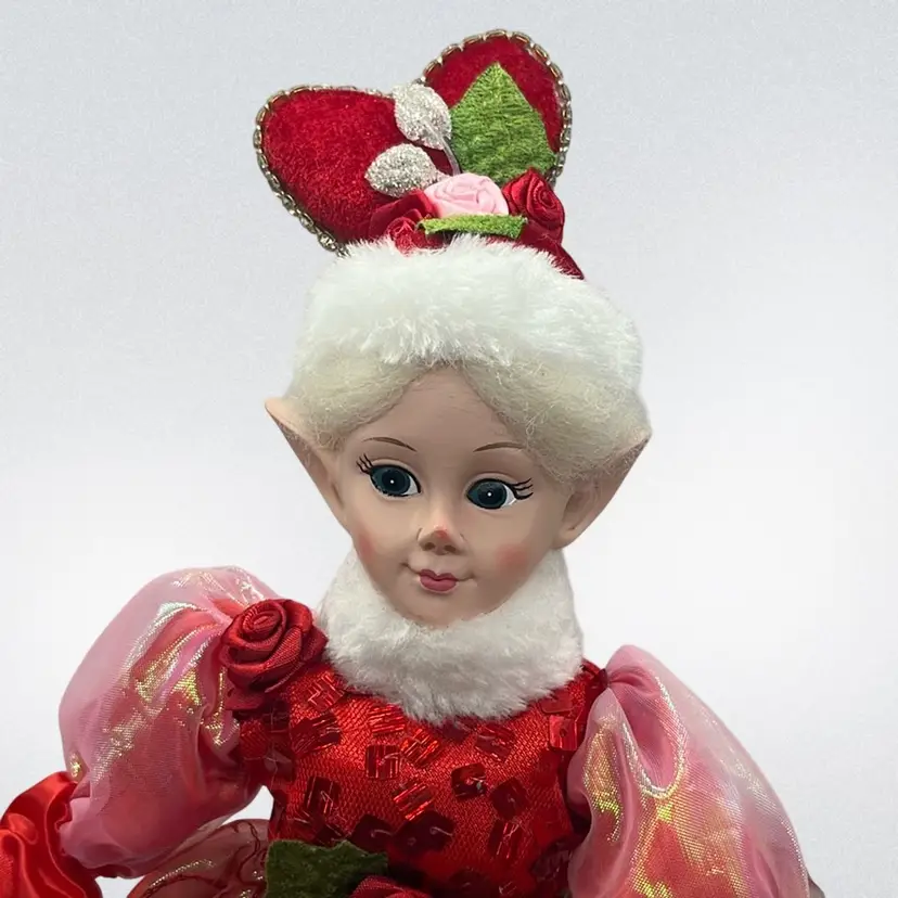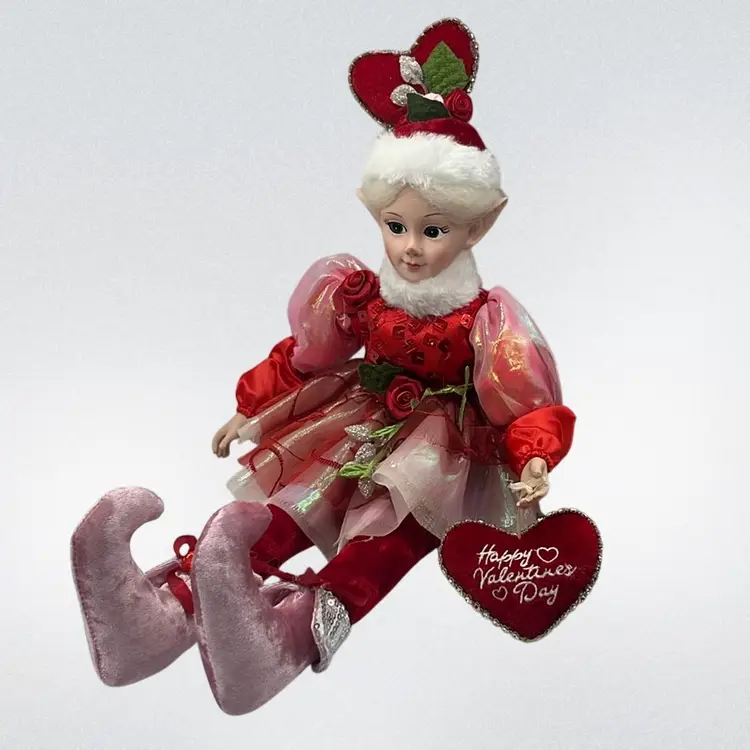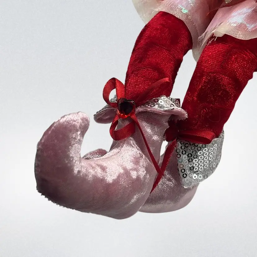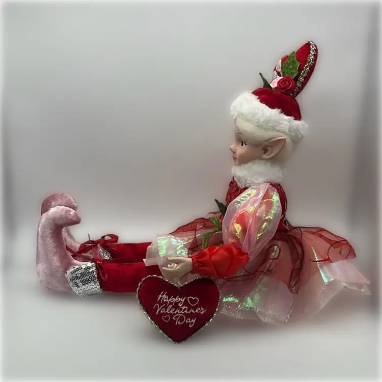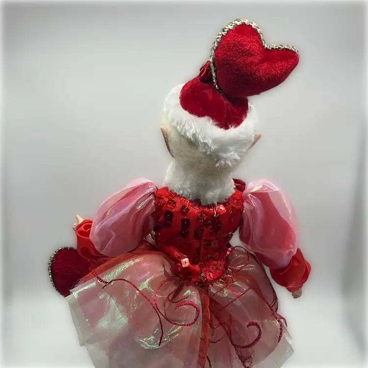 Fancy fairy pixie elf in her fabulous pink and red dress! Red velvet and pink fancy sequin boots with so much detail throughout! She’s in great vintage condition, holding a heart saying Happy Valentines Day! Approx: 16-17” h x 8.5” w (hand to hand) bottom 4” for shelf