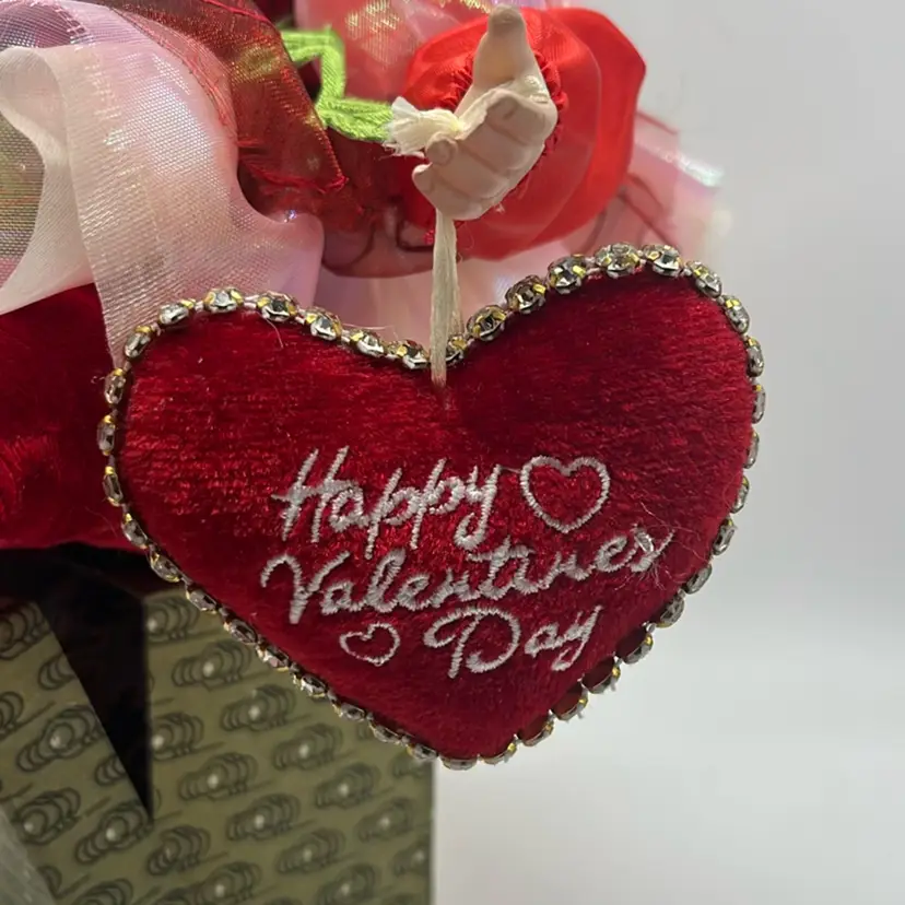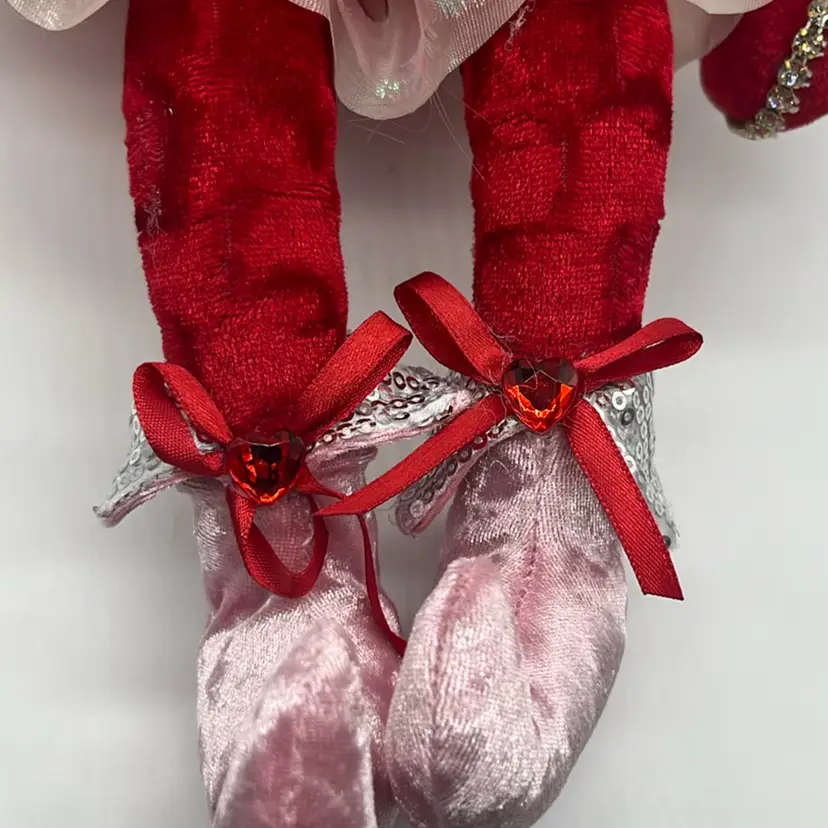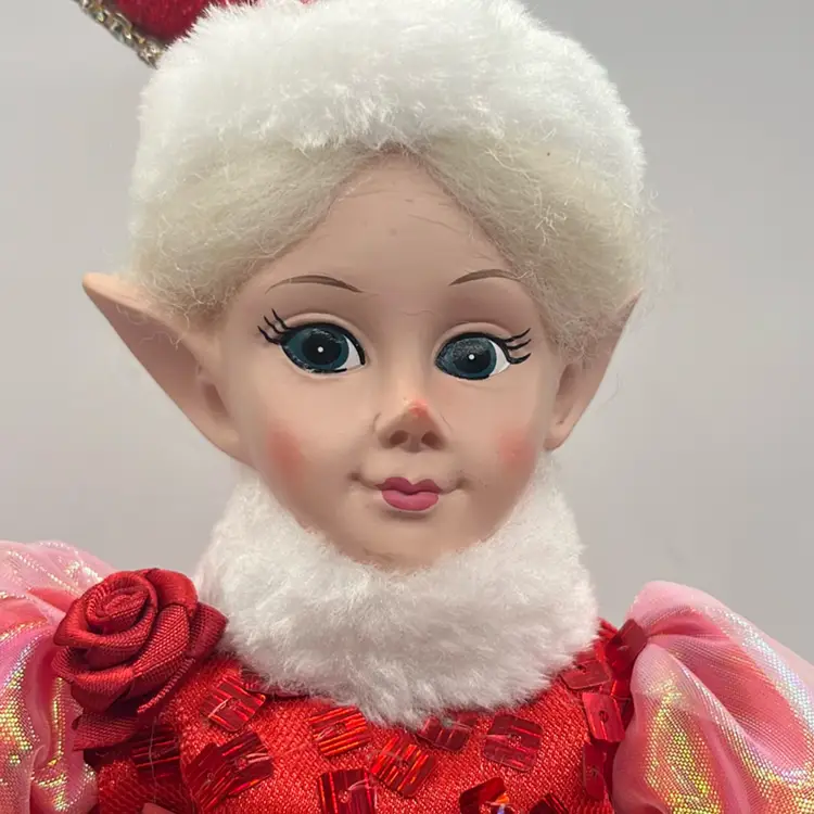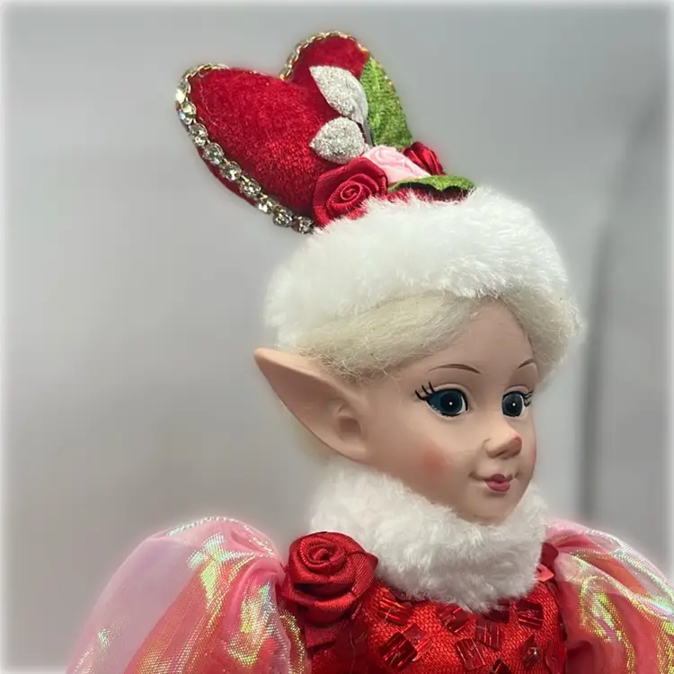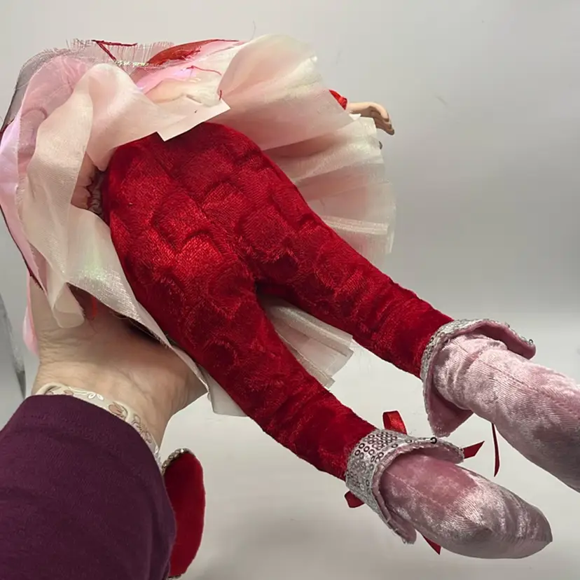Fancy fairy pixie elf in her fabulous pink and red dress! Red velvet and pink fancy sequin boots with so much detail throughout! She’s in great vintage condition, holding a heart saying Happy Valentines Day! Approx: 16-17” h x 8.5” w (hand to hand) bottom 4” for shelf