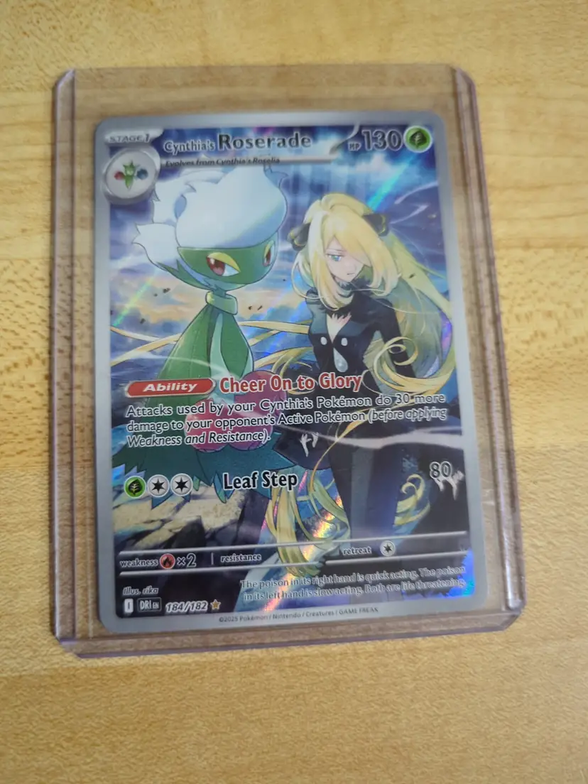 Cynthia's Roserade card in a protective sleeve. Perfect for Pokémon collectors and fans of the Sinnoh Champion!
