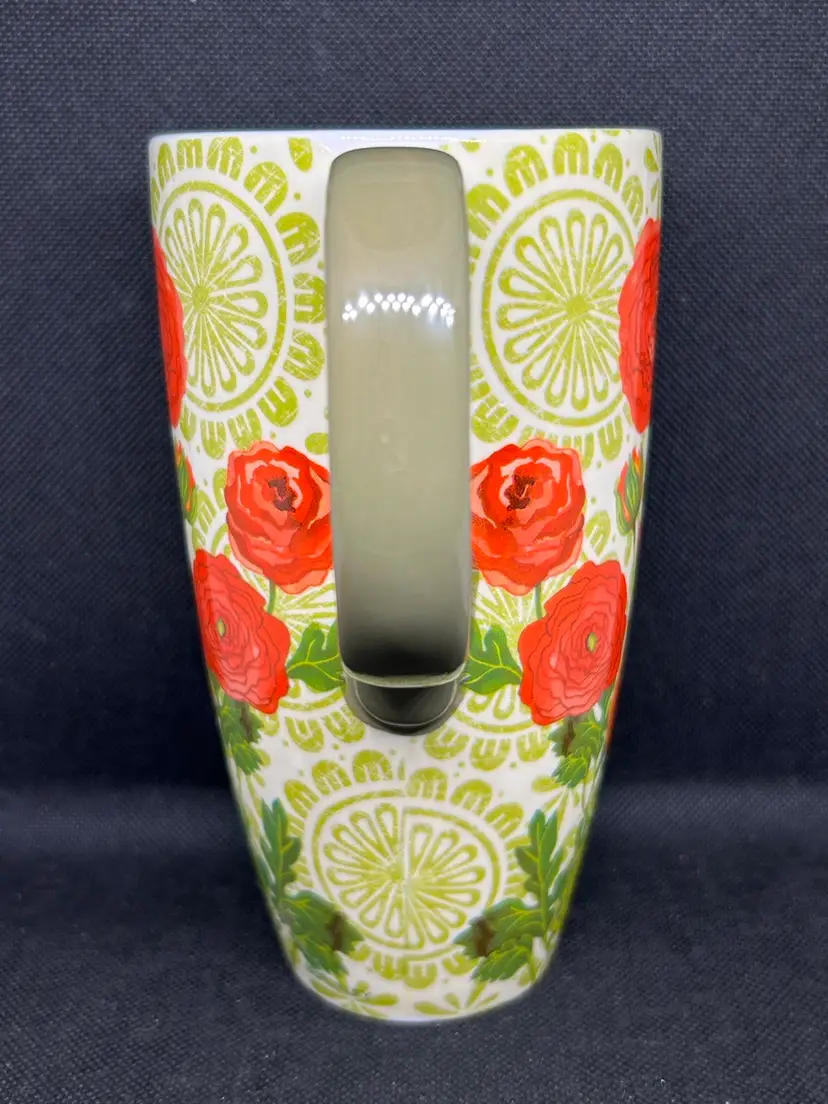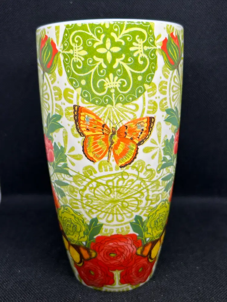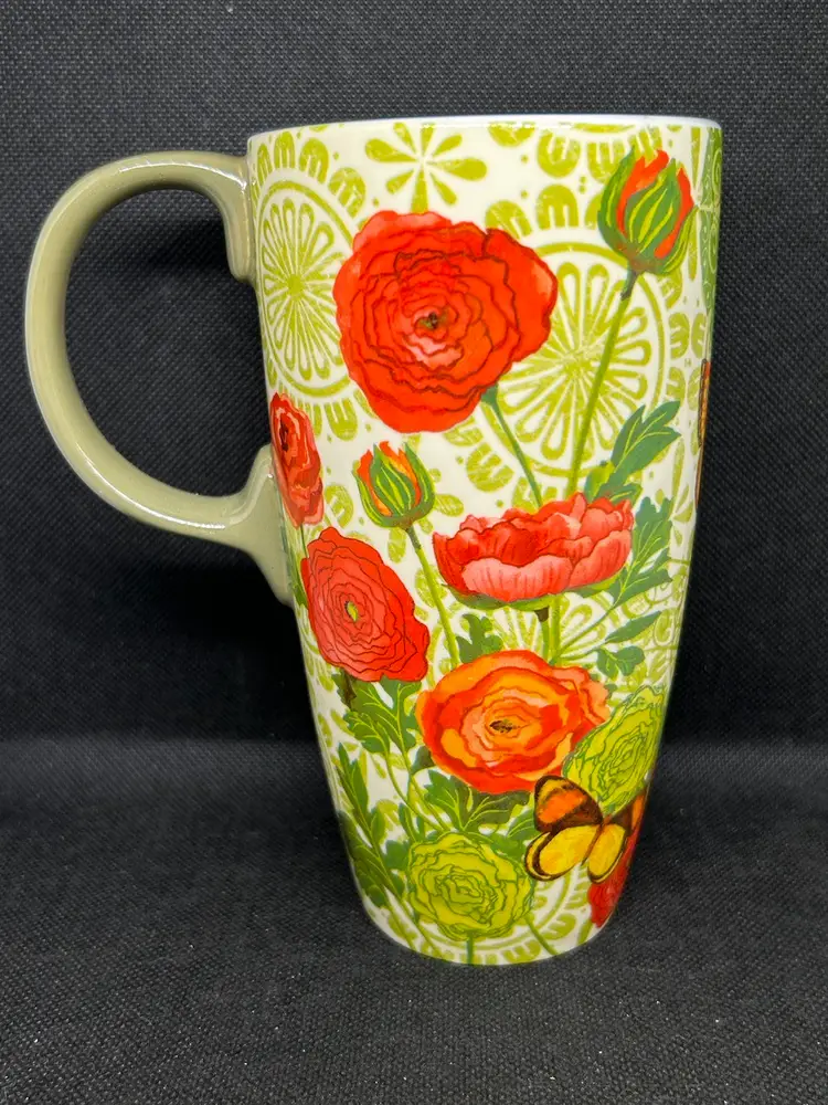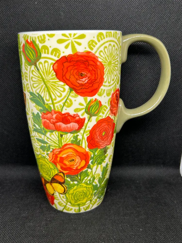 Great Cypress Home Botanica Ceramic Mug 17 oz Green And Red Coffee Cup with butterflies. 6""H x 5.25""W x 3.5""D