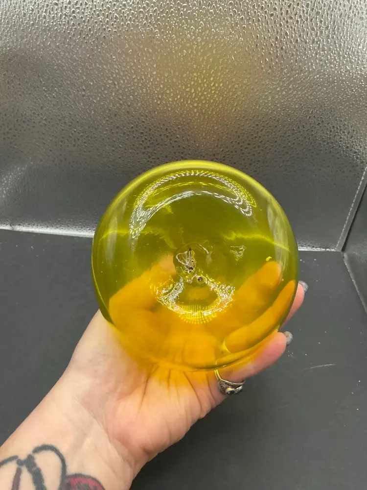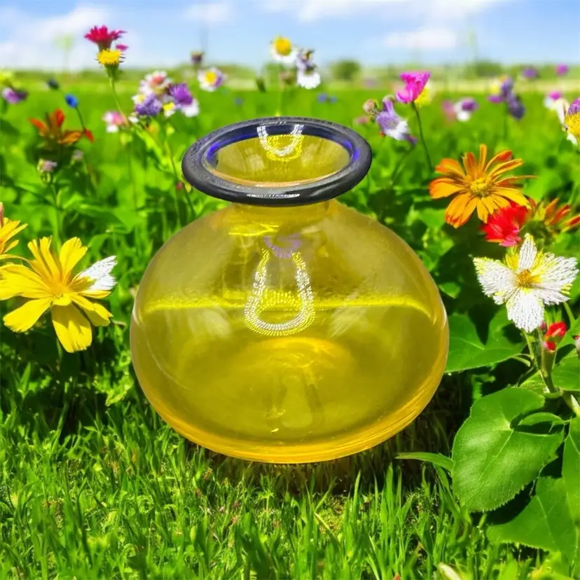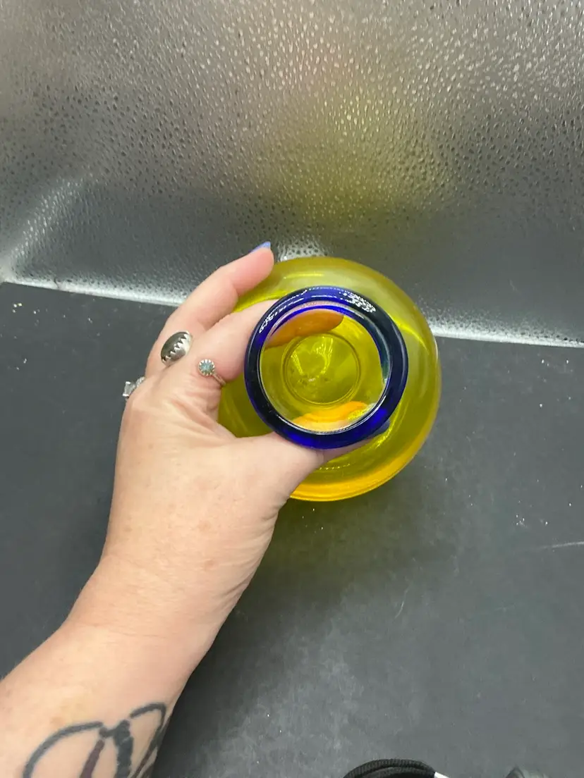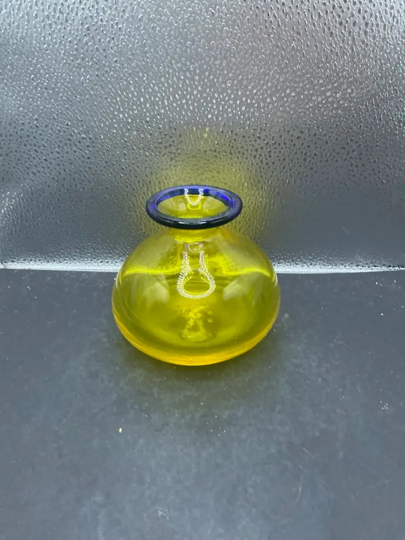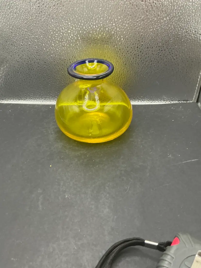 Czech Bohemian Blown Glass Yellow Vase Cobalt Blue Rim 4” Tall. No chips or cracks.