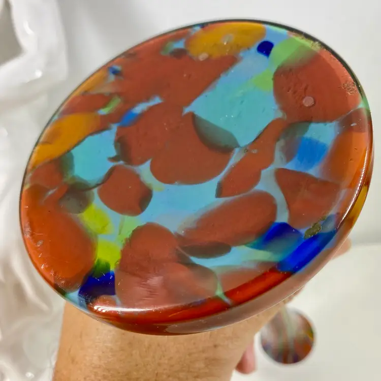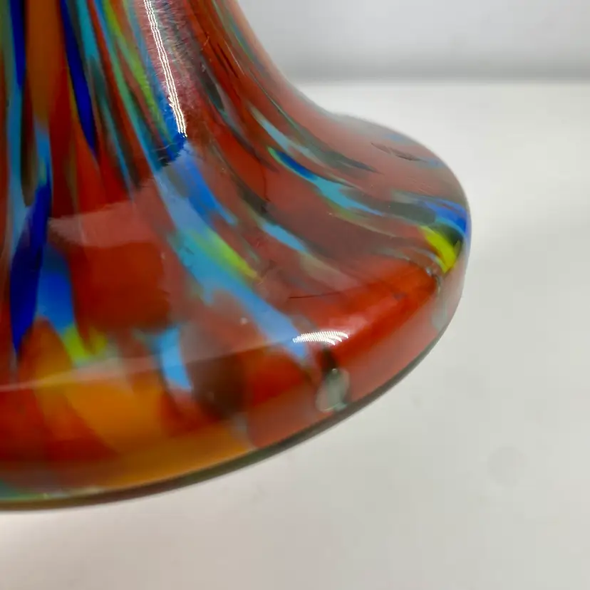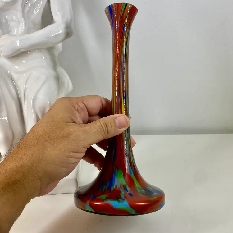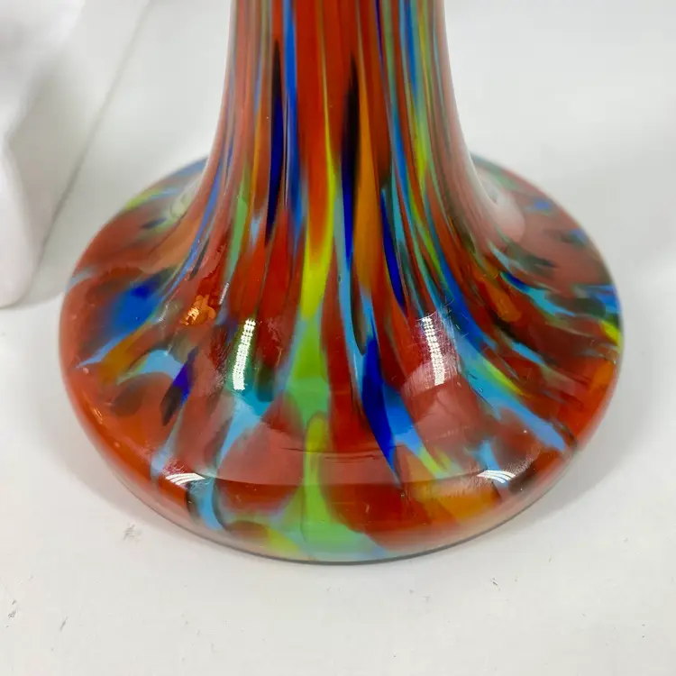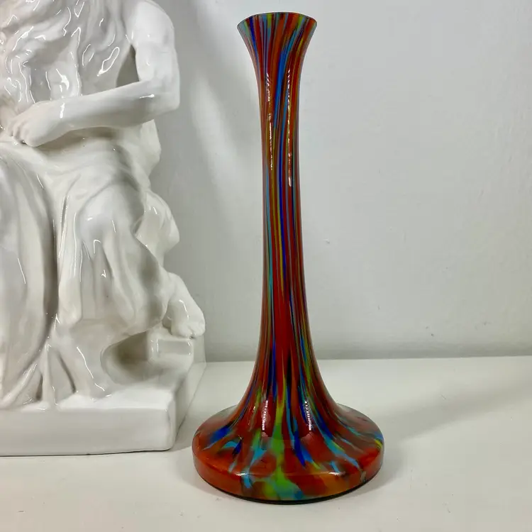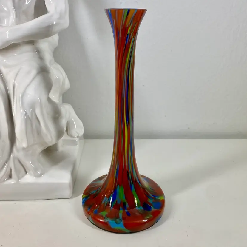 Hi... This exquisite Czech vase by Wilhelm Kralik Sohne is a stunning piece of art glass that will add a touch of elegance to any space or collection. The hand-blown glass features a beautiful Bohemian spatter pattern in red, orange, blue, green, and yellow, with a high gloss finish that makes it a perfect decorative piece. The vase stands at 8.5 inches tall and has a diameter of 3.5 inches, making it the perfect size for displaying a single flower or as a standalone decorative item. This original early 20th-century vase is a masterpiece of the Art Deco style and is sure to be a conversation starter. Don't miss out on the opportunity to add this glamorous piece to your decor or collection.