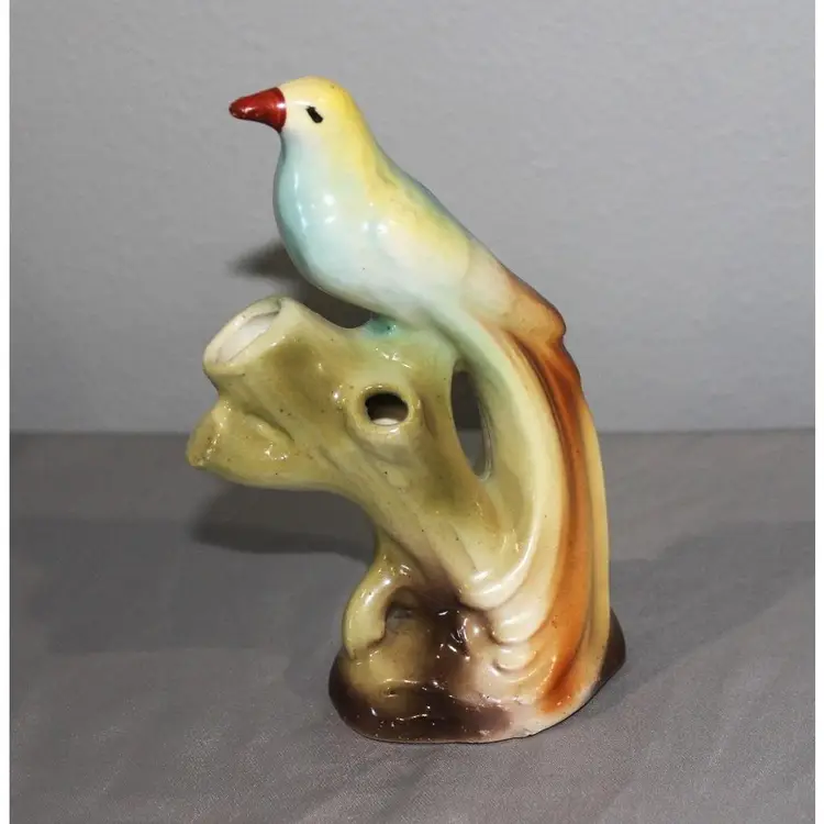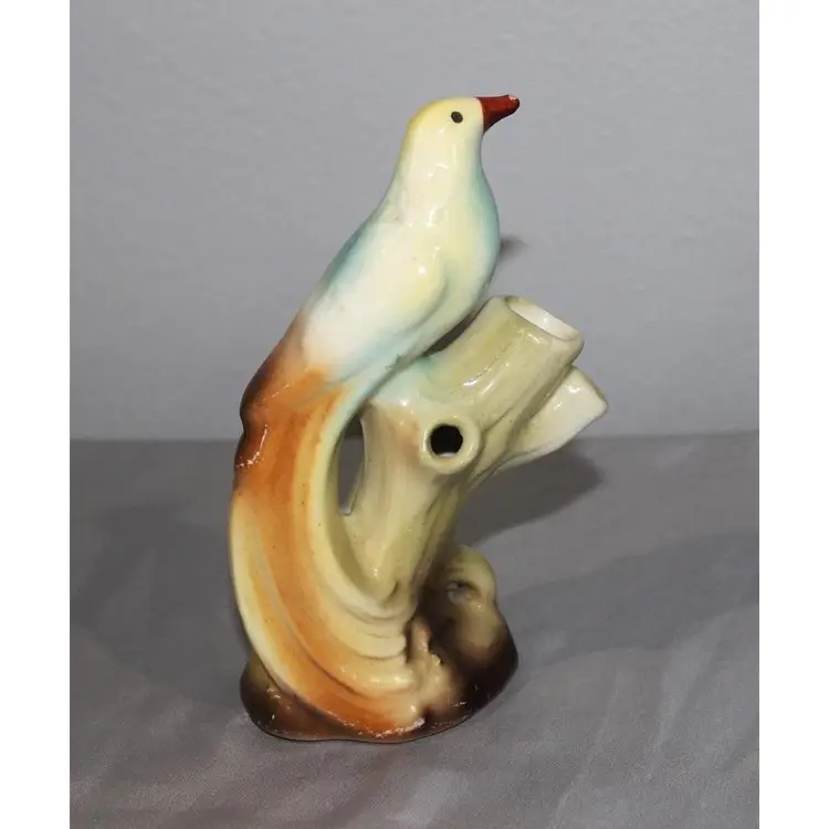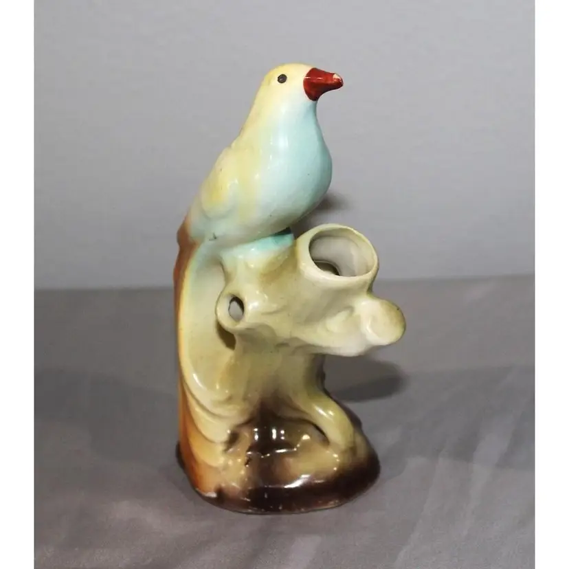 For sale is a very nice bird vase with three holes made in Czechoslovakia. It stands about 5 1/2 inches tall and has no chips or cracks. it does have a small paint scrape on his beak that could easily be touched up.