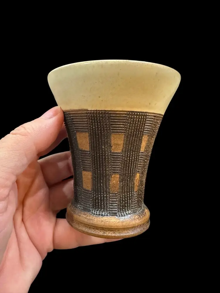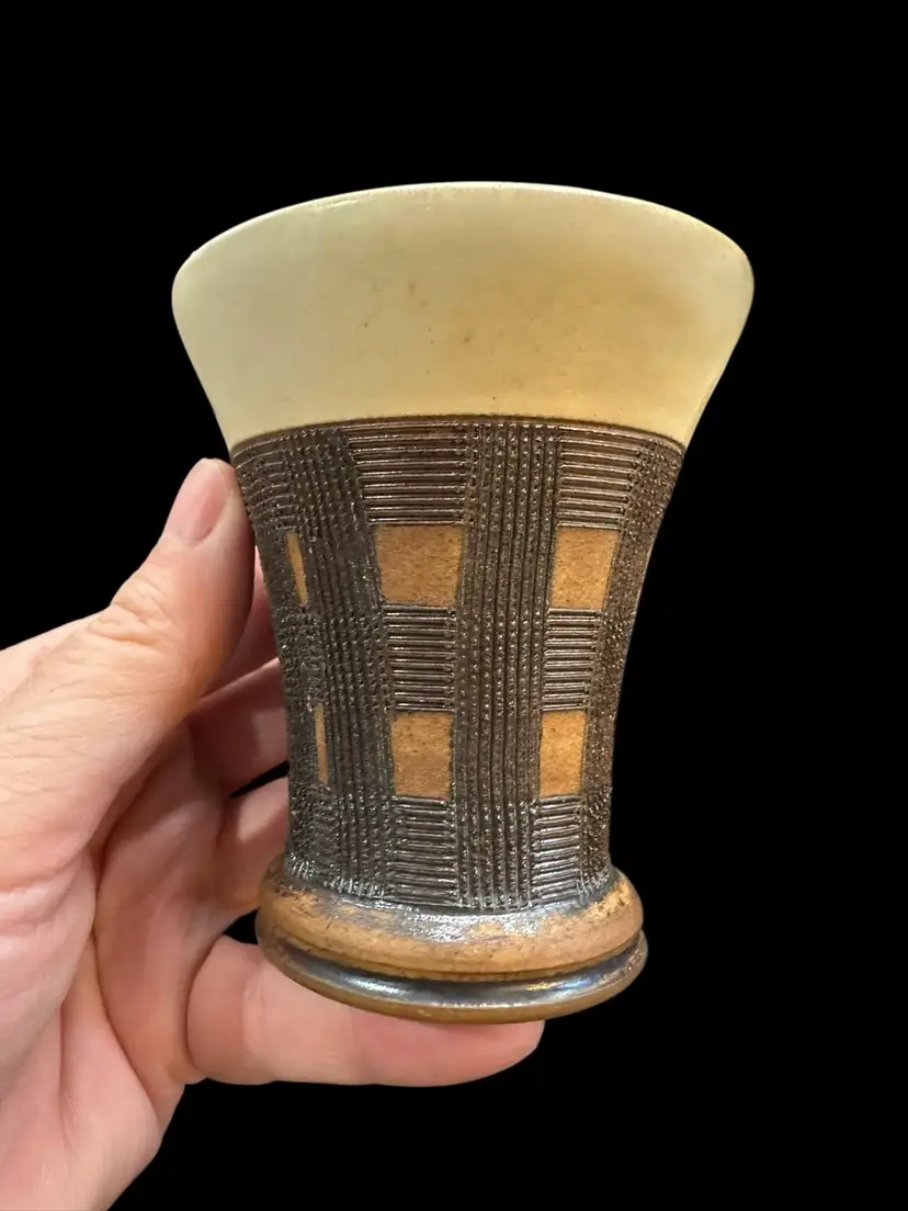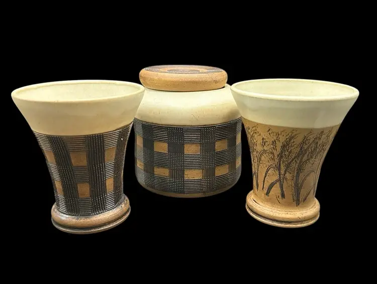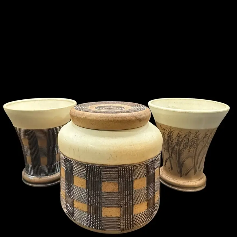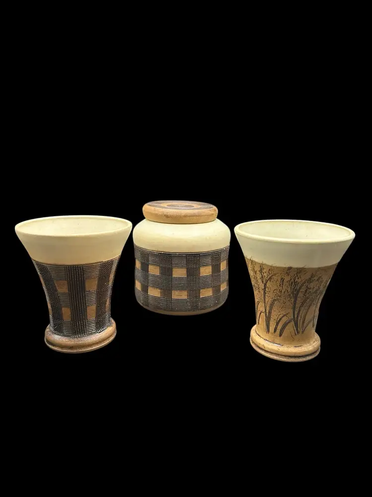 Really nice set of a lidded jar and two dice cups - handmade Czechoslovakian pottery. No chips or cracks. Jar measures 3.5” tall with lid, cups measure 3.25” tall.