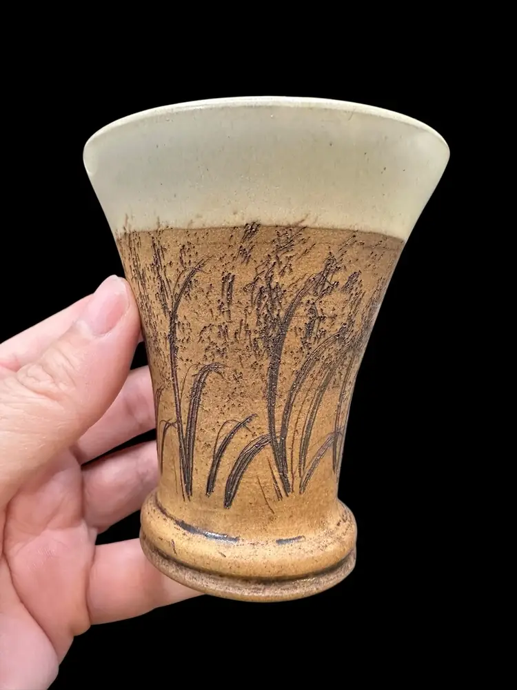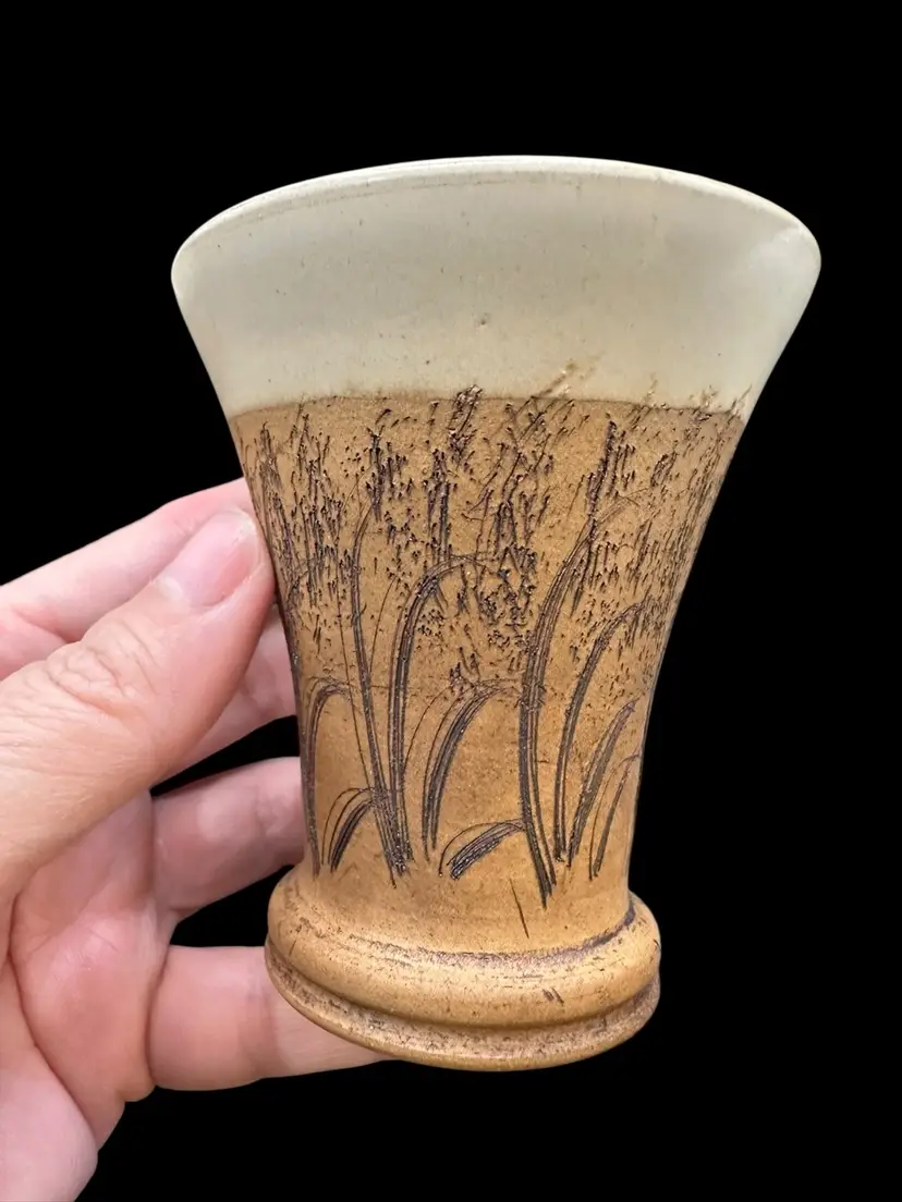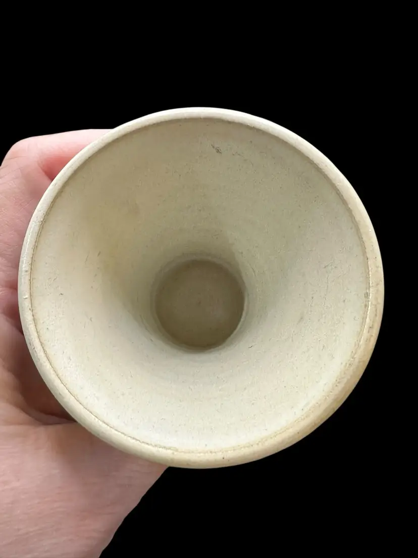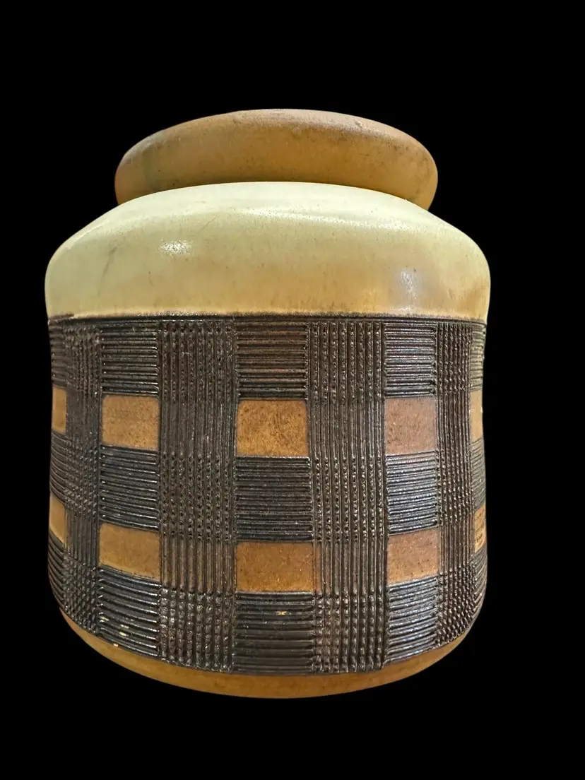 Really nice set of a lidded jar and two dice cups - handmade Czechoslovakian pottery. No chips or cracks. Jar measures 3.5” tall with lid, cups measure 3.25” tall.