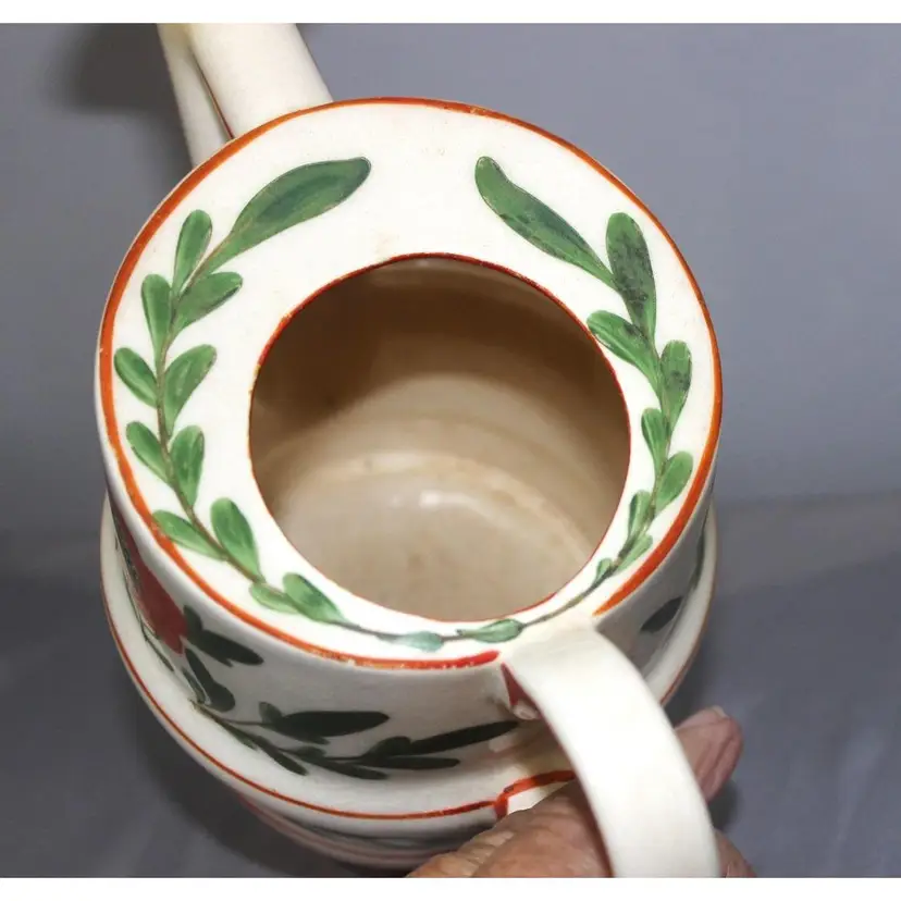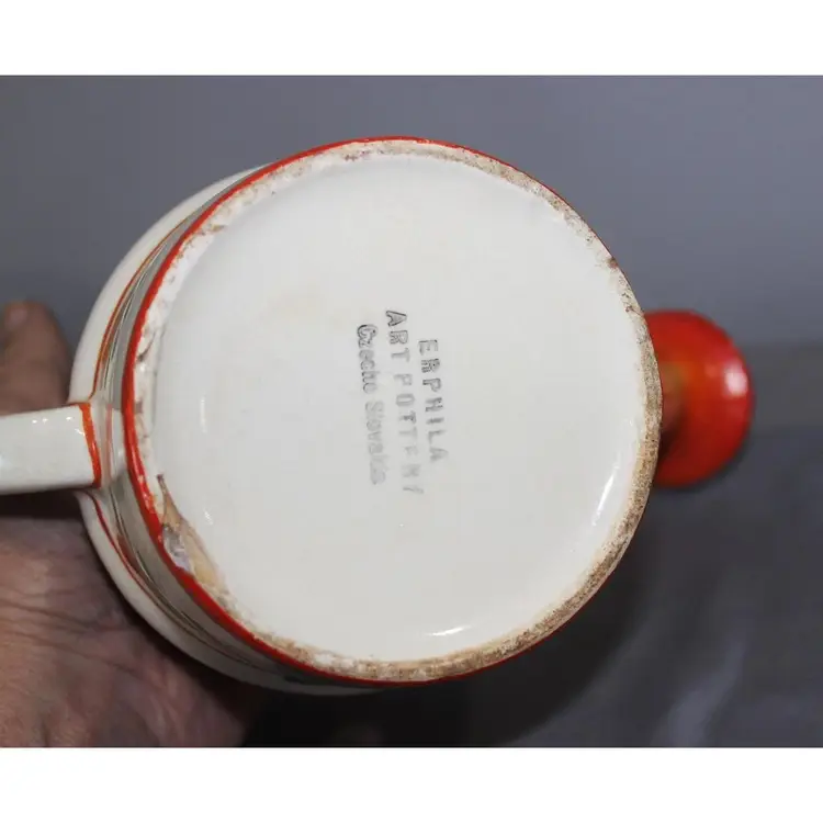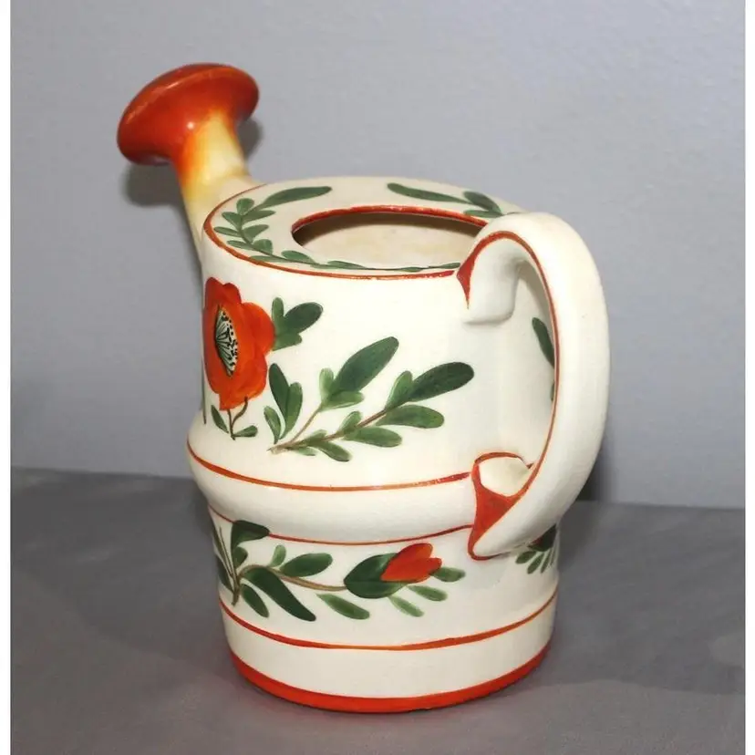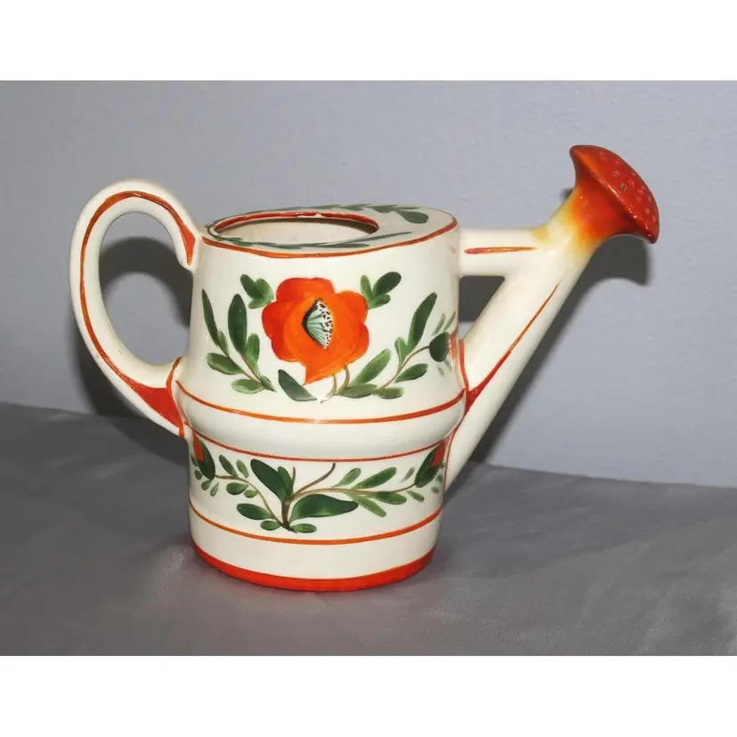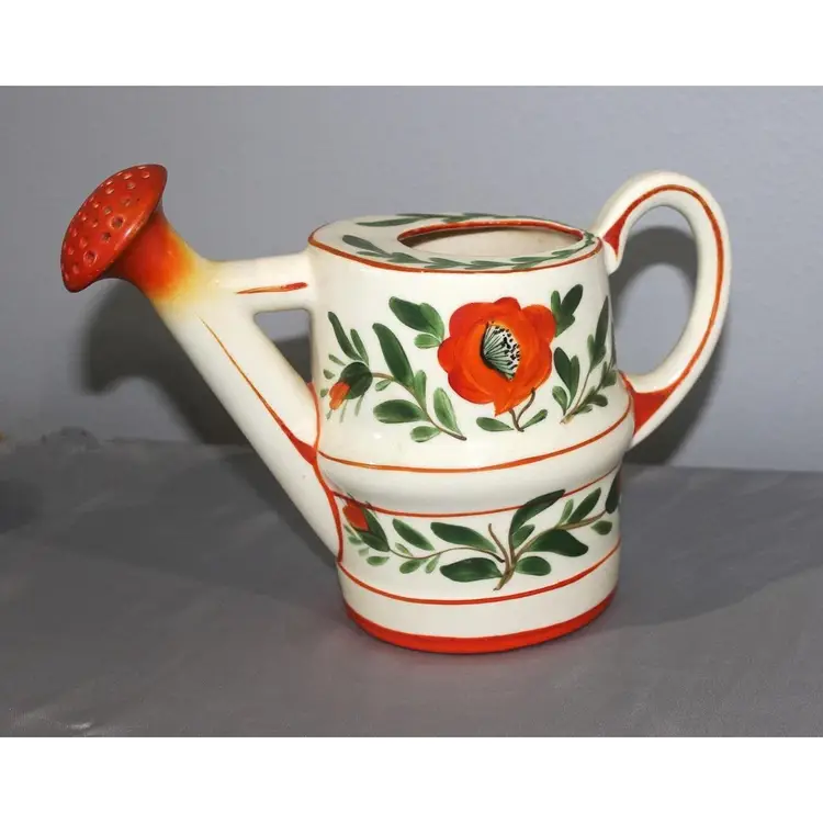 For sale is this very vibrant pottery watering can made in Czechoslovakia. It stands about 7 inches tall and is about 7 inches wide. Great color. There is a chip on the bottom that is not really noticeable.