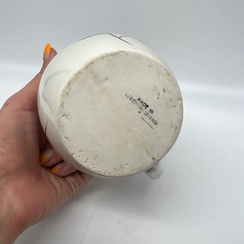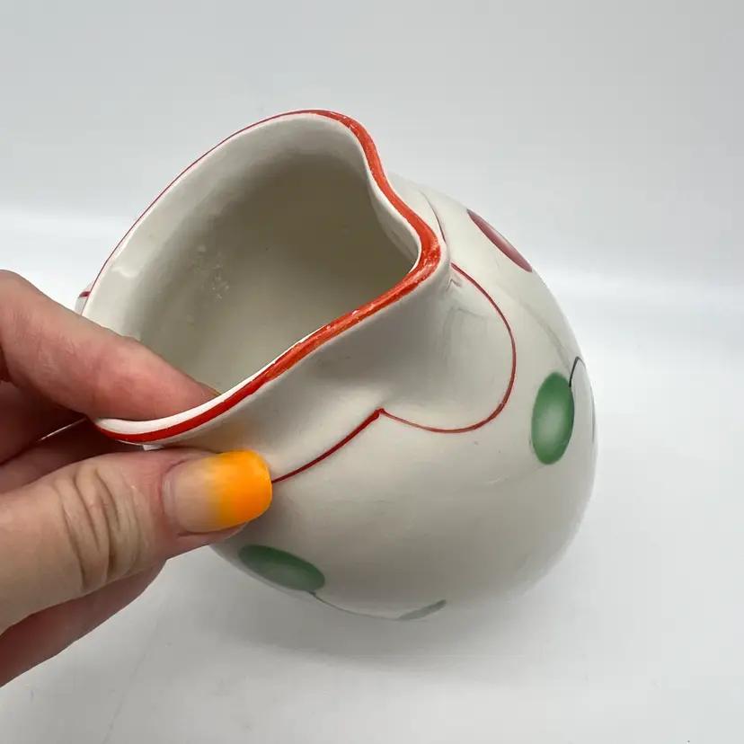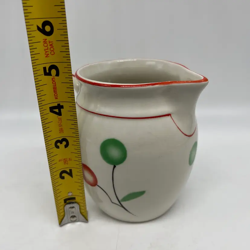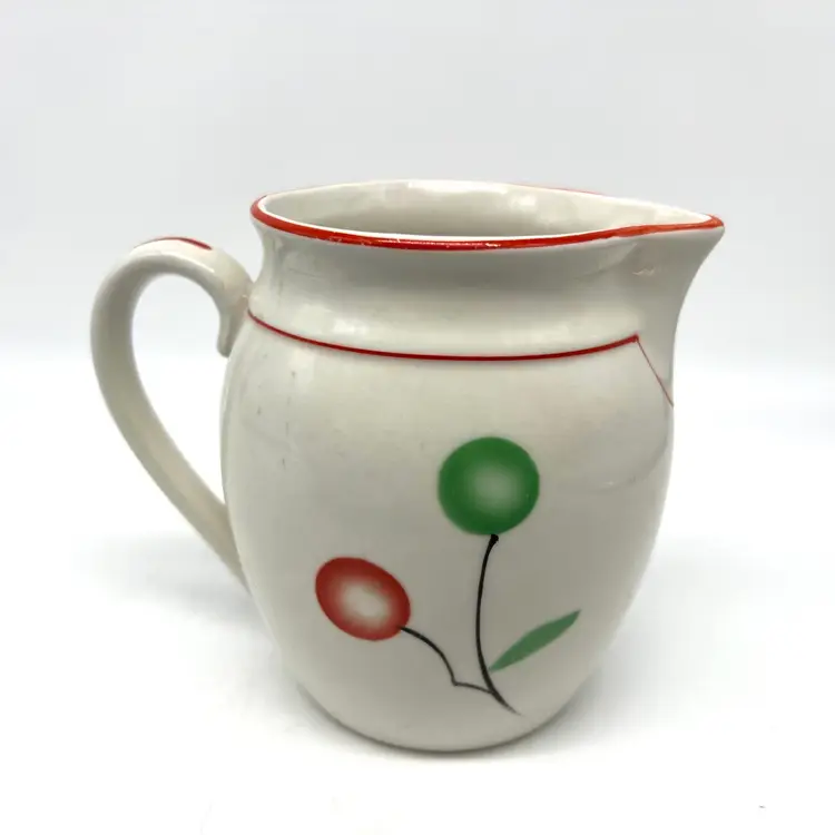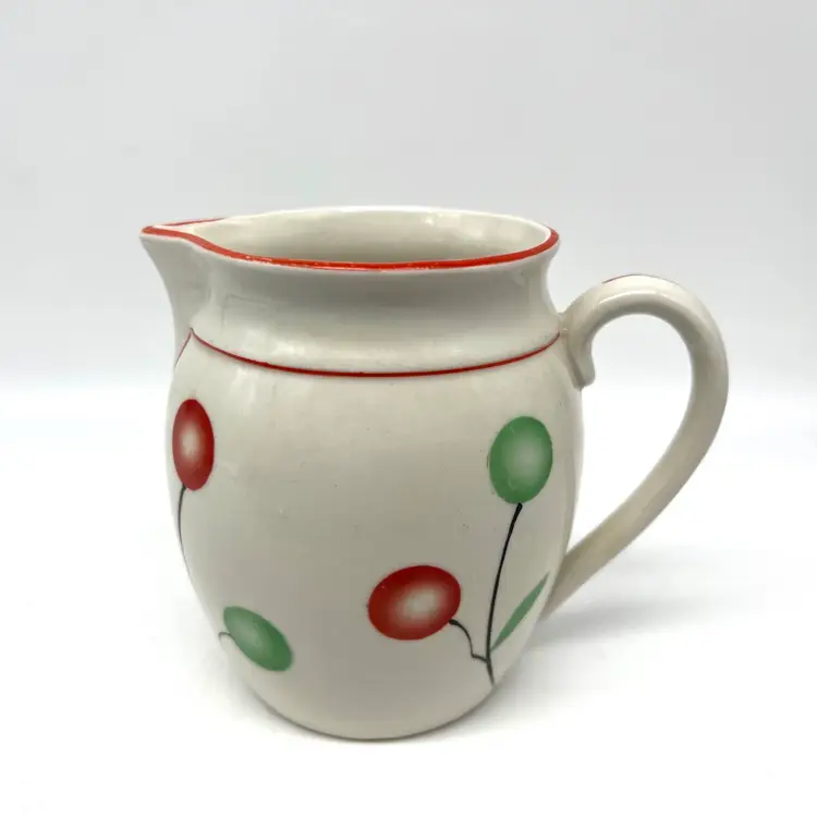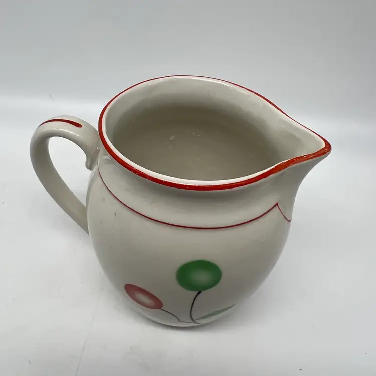 This czech pottery pitcher has red and green decor with a red border. It measures approx 4.75" tall. There are no chips or cracks.