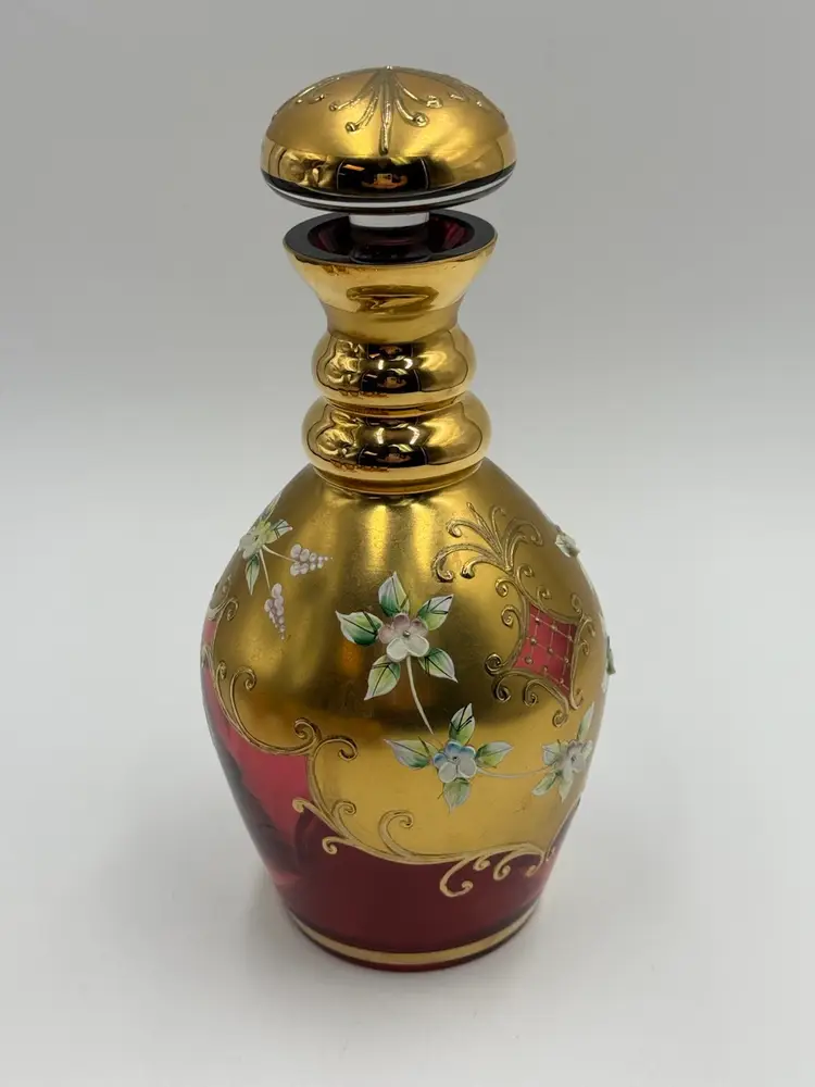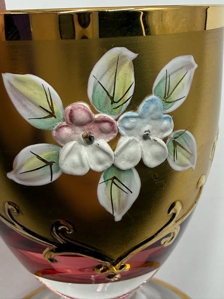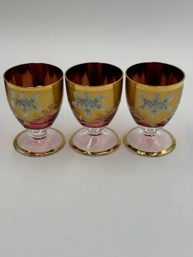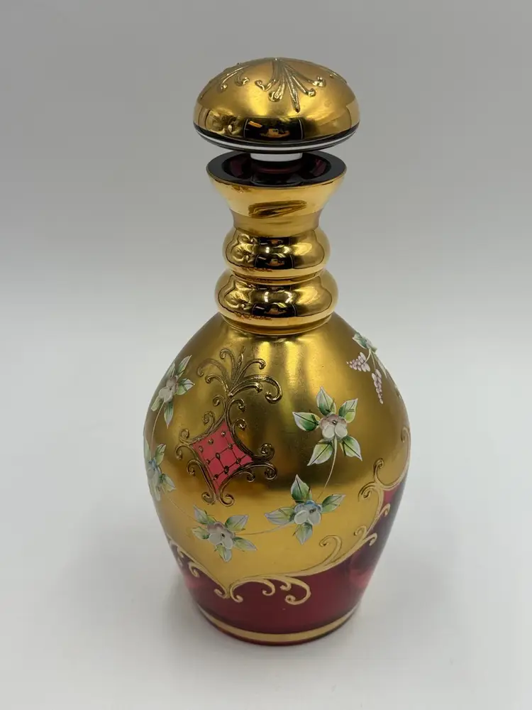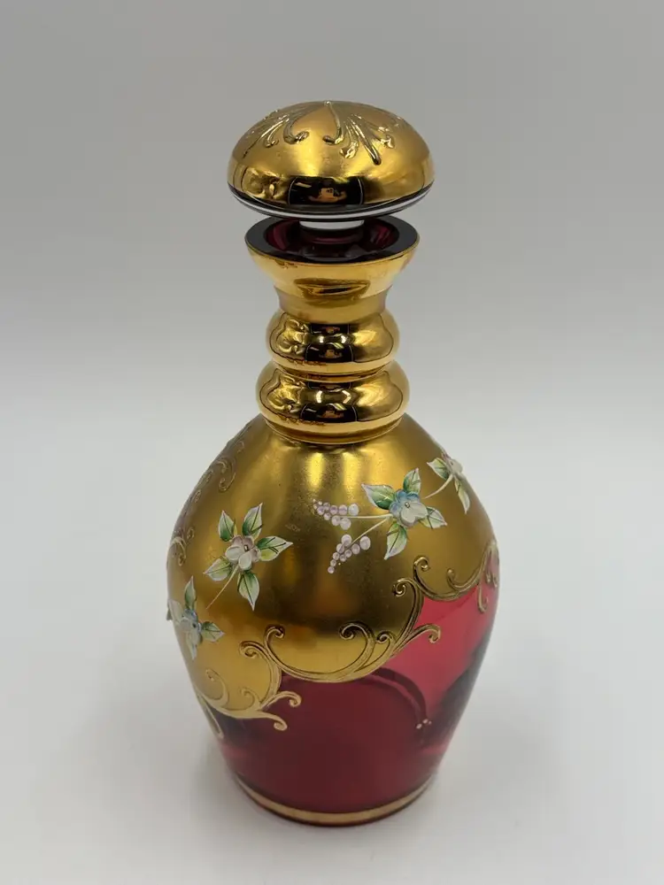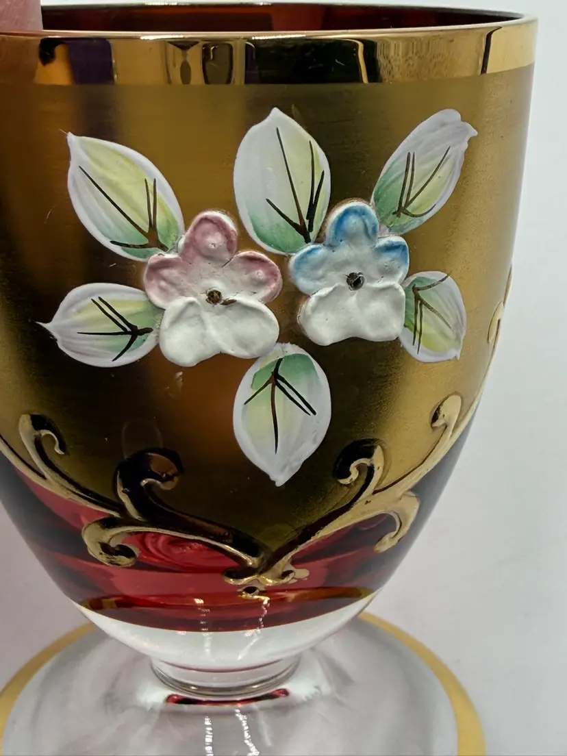 In good condition. Does not have any chips or cracks on the decanter or glasses. The hand painted enamel is in good condition. The gold overlay is in good condition and does not have any wear. The decanter measures 9 inches tall and 4 inches wide at the middle of the decanter. The glasses measure 3 1/2 inches tall and 2 1/2 inches in diameter at the top rim.