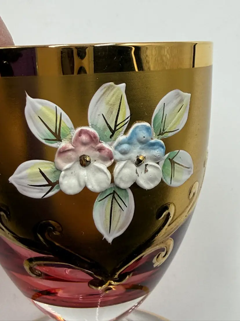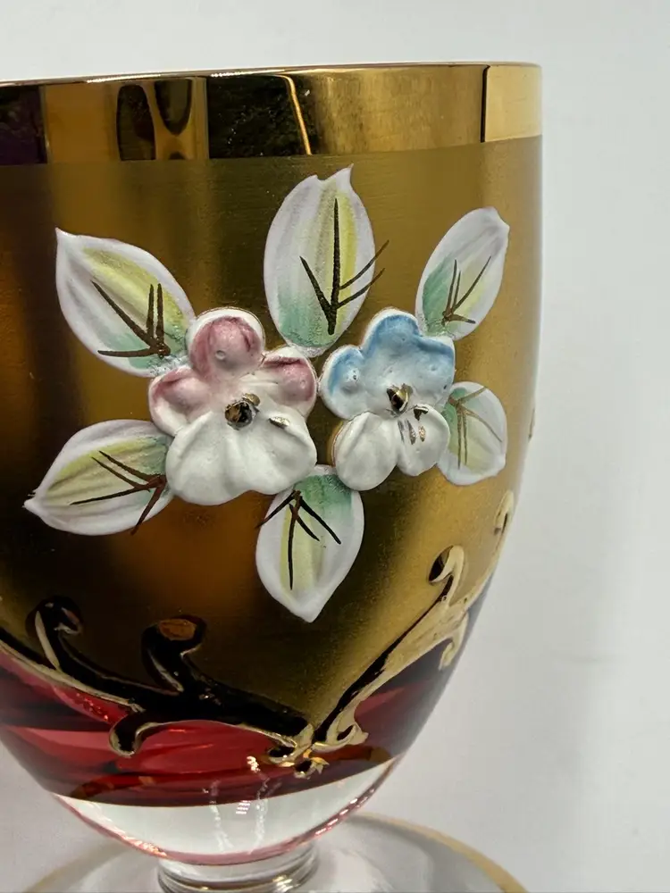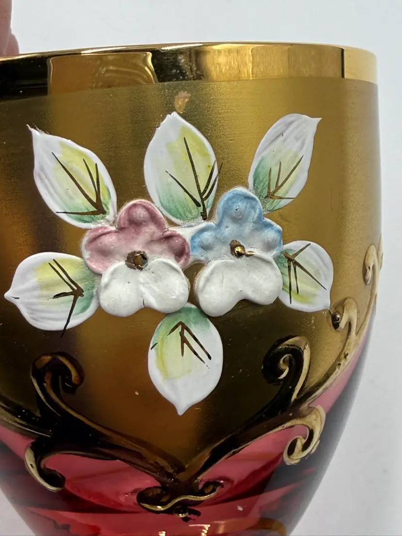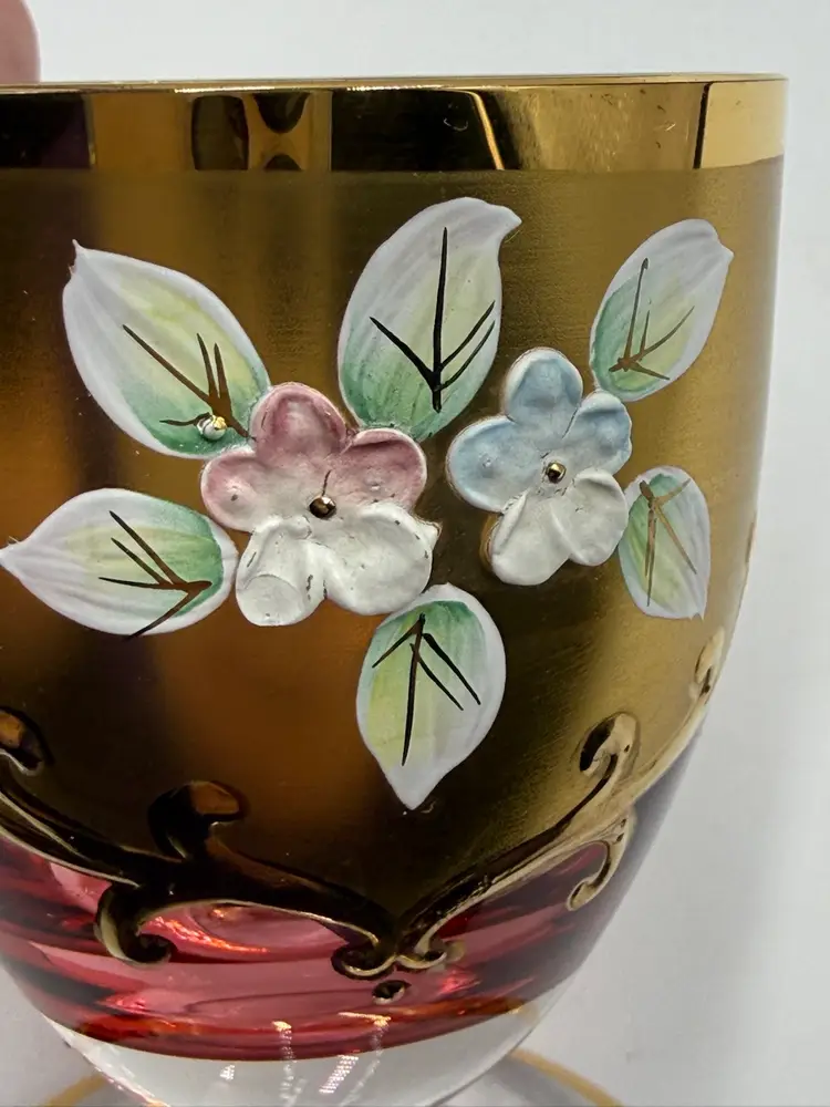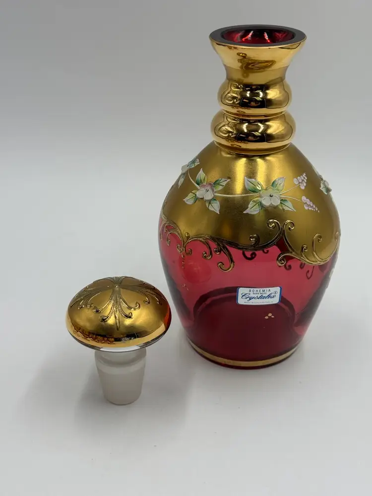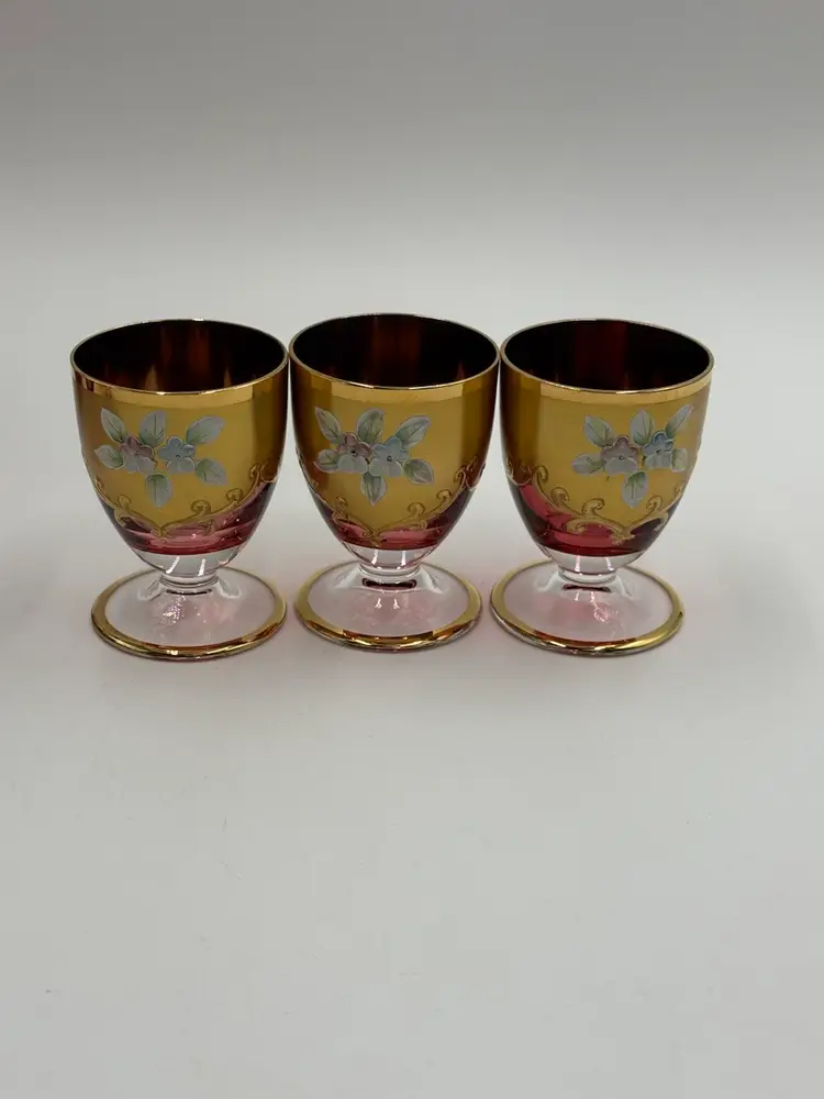 In good condition. Does not have any chips or cracks on the decanter or glasses. The hand painted enamel is in good condition. The gold overlay is in good condition and does not have any wear. The decanter measures 9 inches tall and 4 inches wide at the middle of the decanter. The glasses measure 3 1/2 inches tall and 2 1/2 inches in diameter at the top rim.