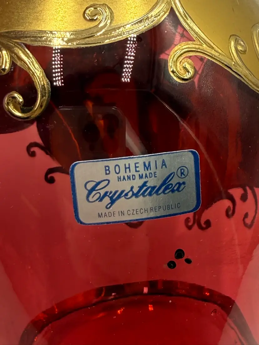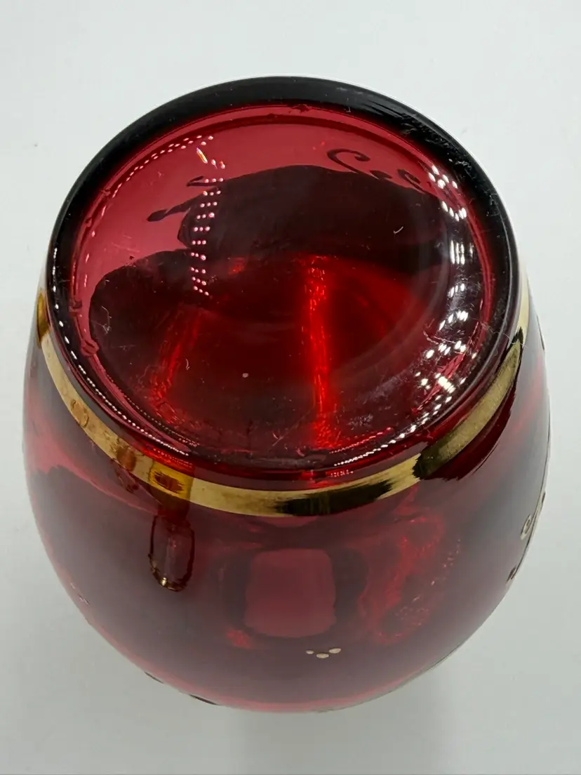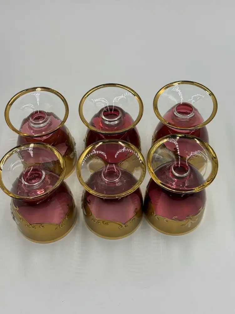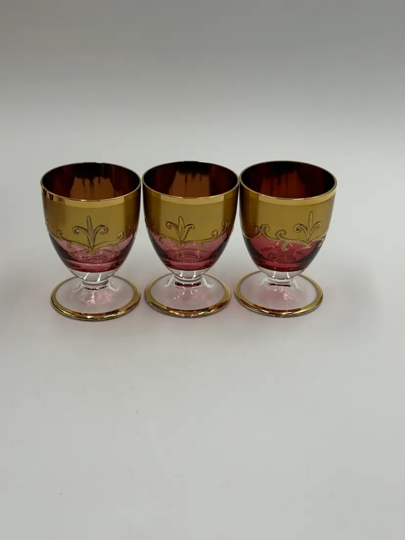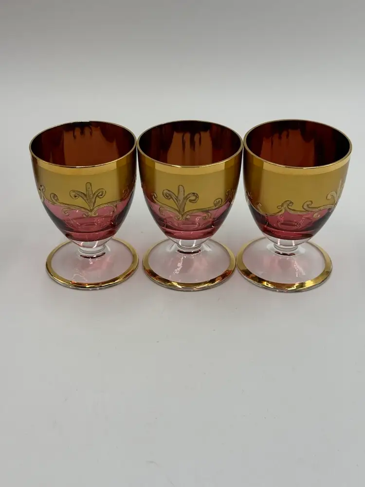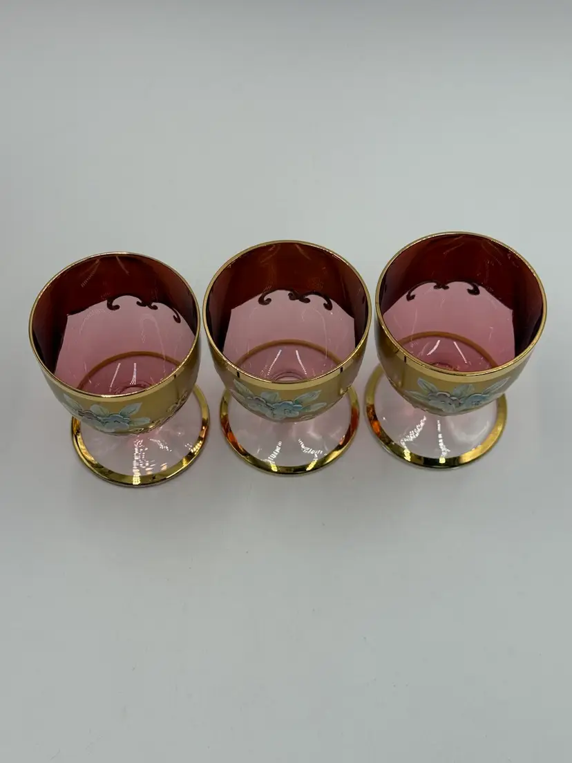 In good condition. Does not have any chips or cracks on the decanter or glasses. The hand painted enamel is in good condition. The gold overlay is in good condition and does not have any wear. The decanter measures 9 inches tall and 4 inches wide at the middle of the decanter. The glasses measure 3 1/2 inches tall and 2 1/2 inches in diameter at the top rim.