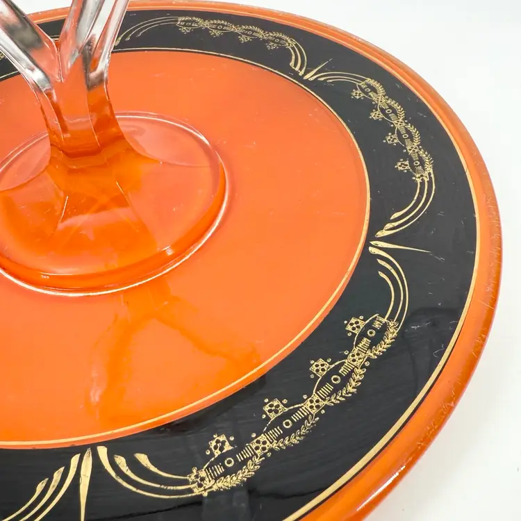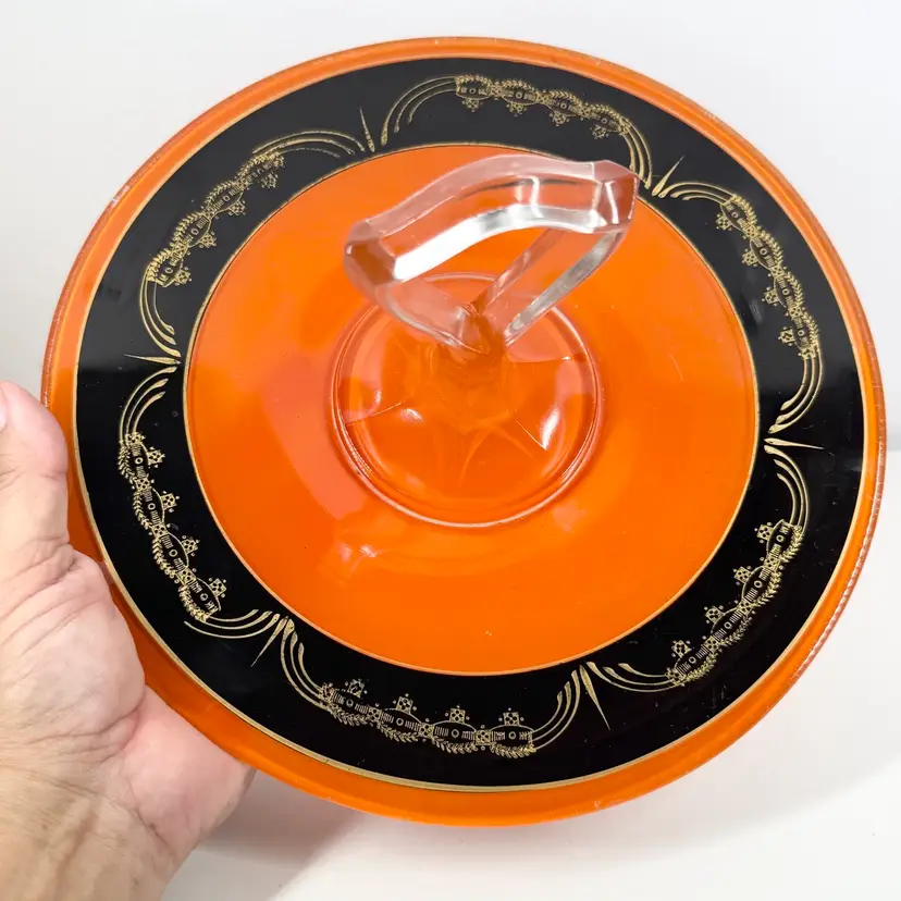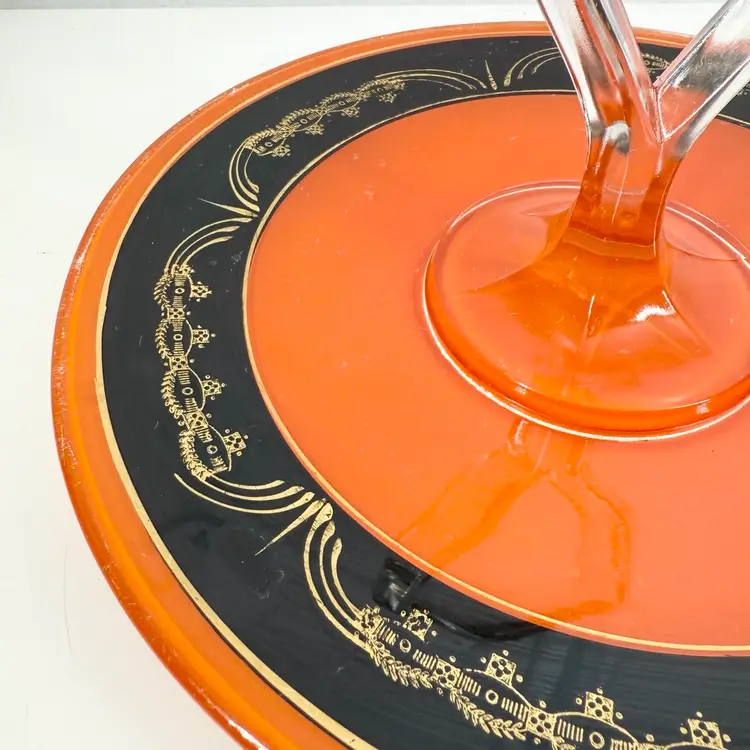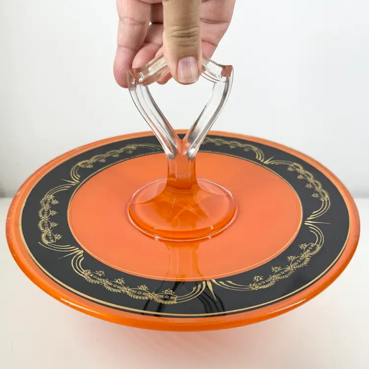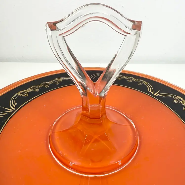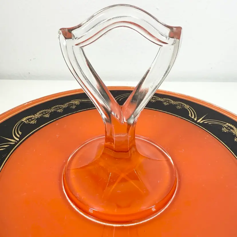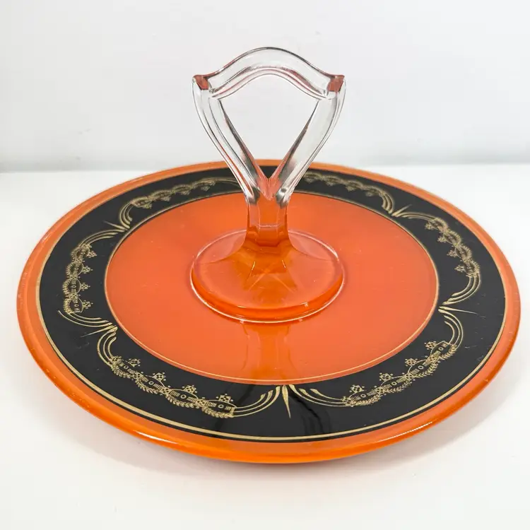 Hard to find reverse painted serving Tidbit Tray with Handle. Surface shows fine scratching and some loss of paint to the rear design.
