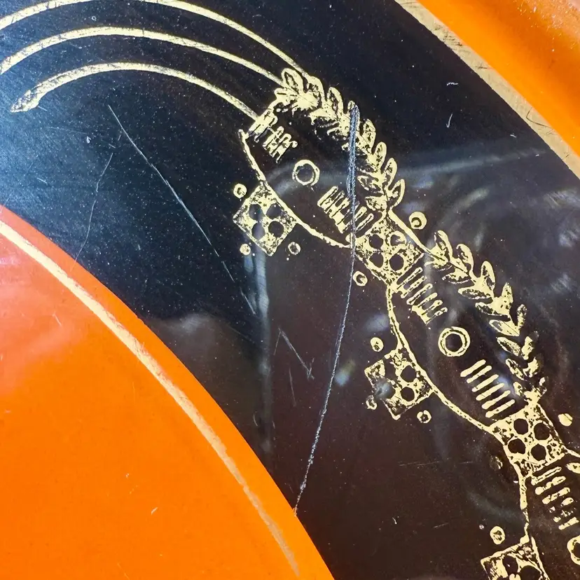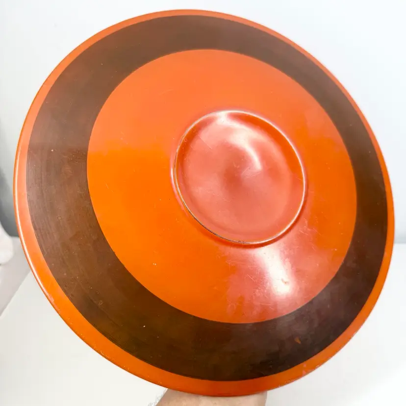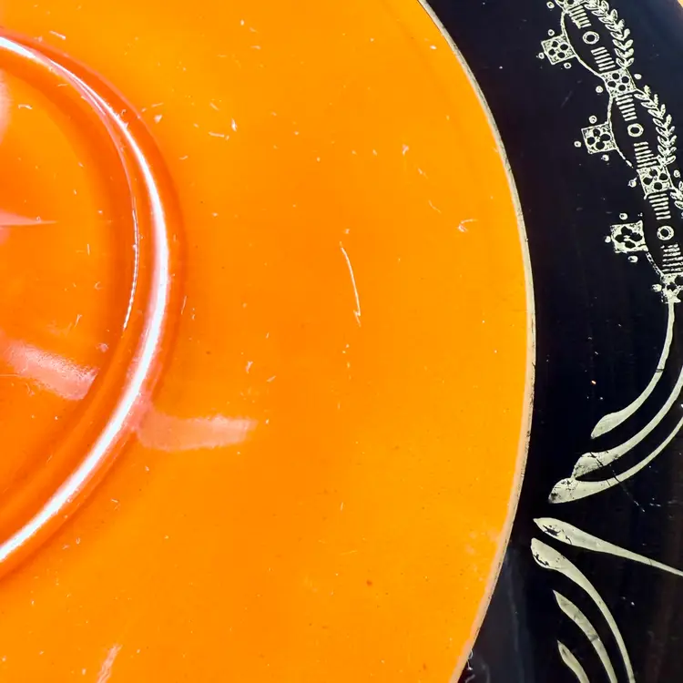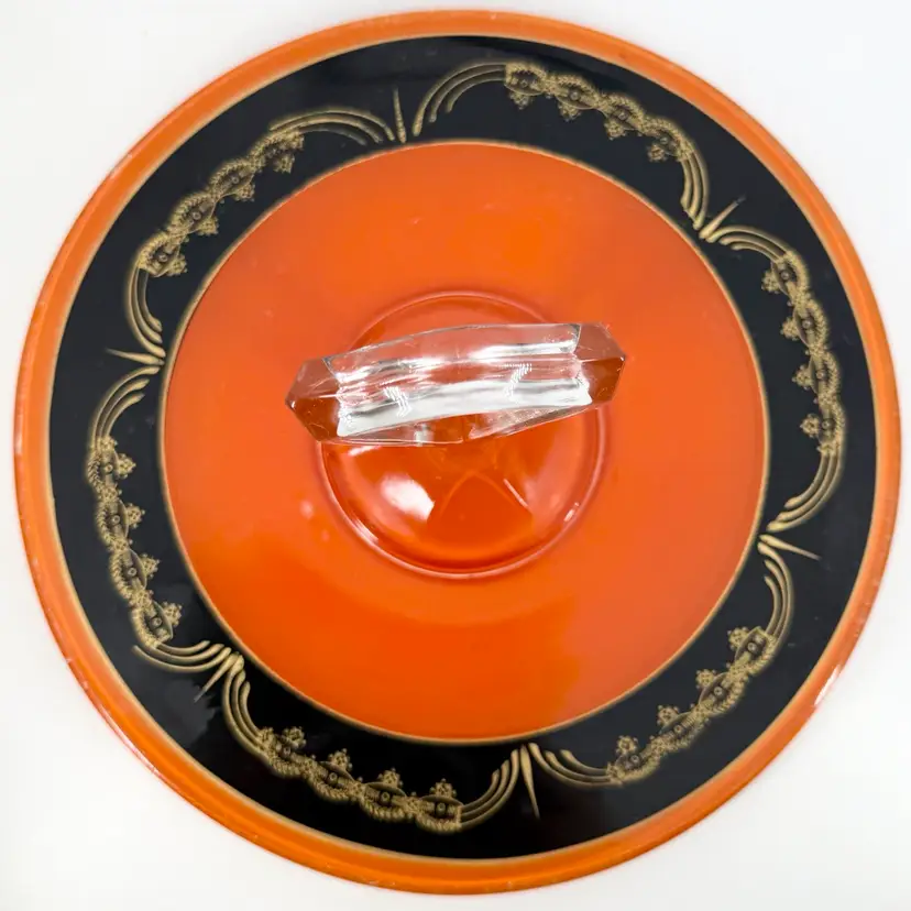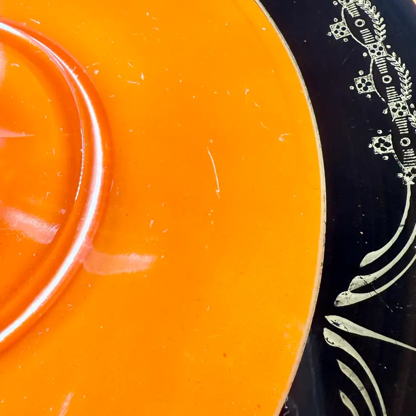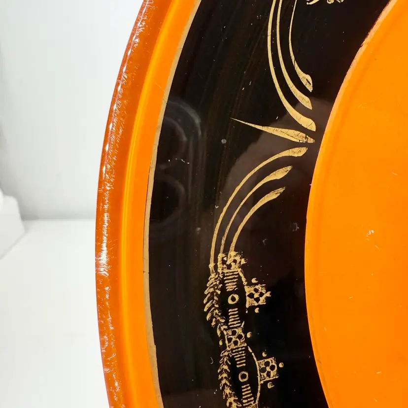 Hard to find reverse painted serving Tidbit Tray with Handle. Surface shows fine scratching and some loss of paint to the rear design.