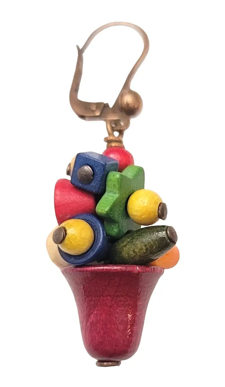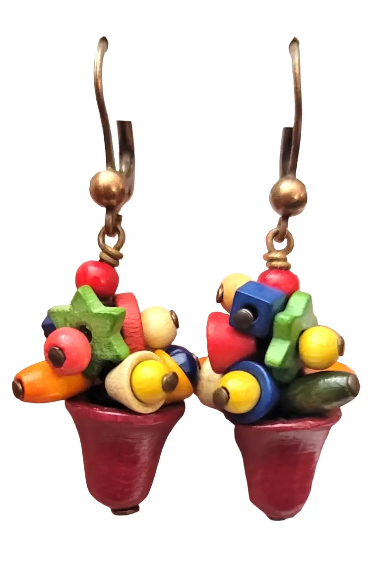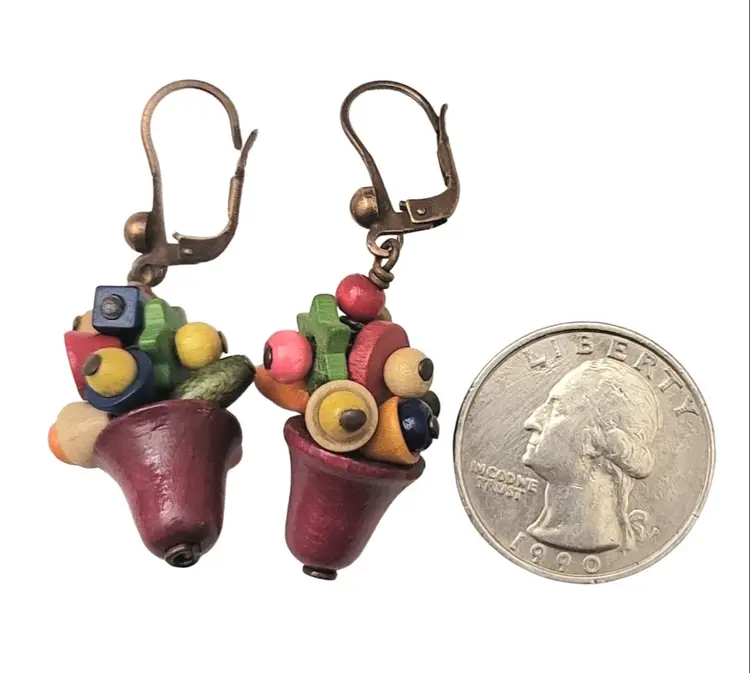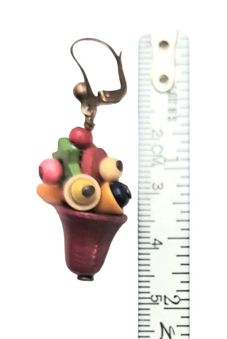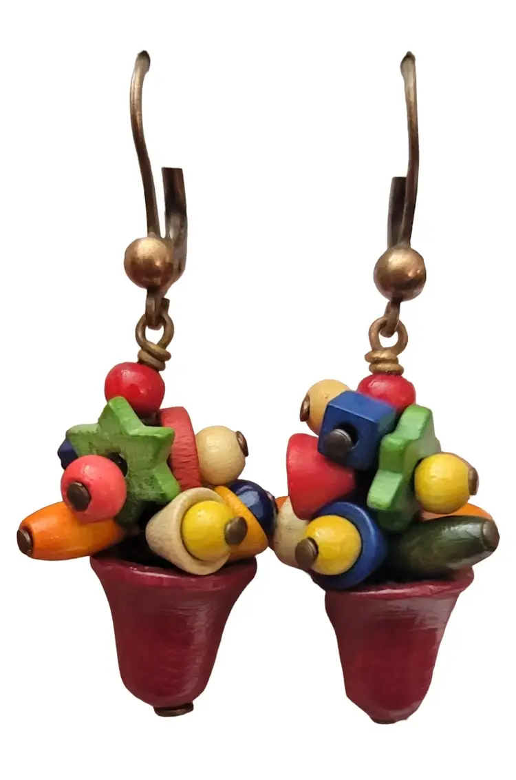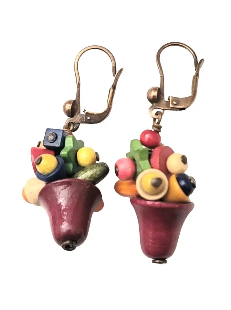 Czech Vintage Multicolored Wood Charm Beads Lever Back Ear Bell Dangle Earrings, M1002