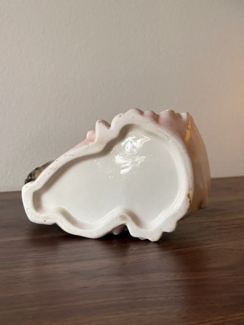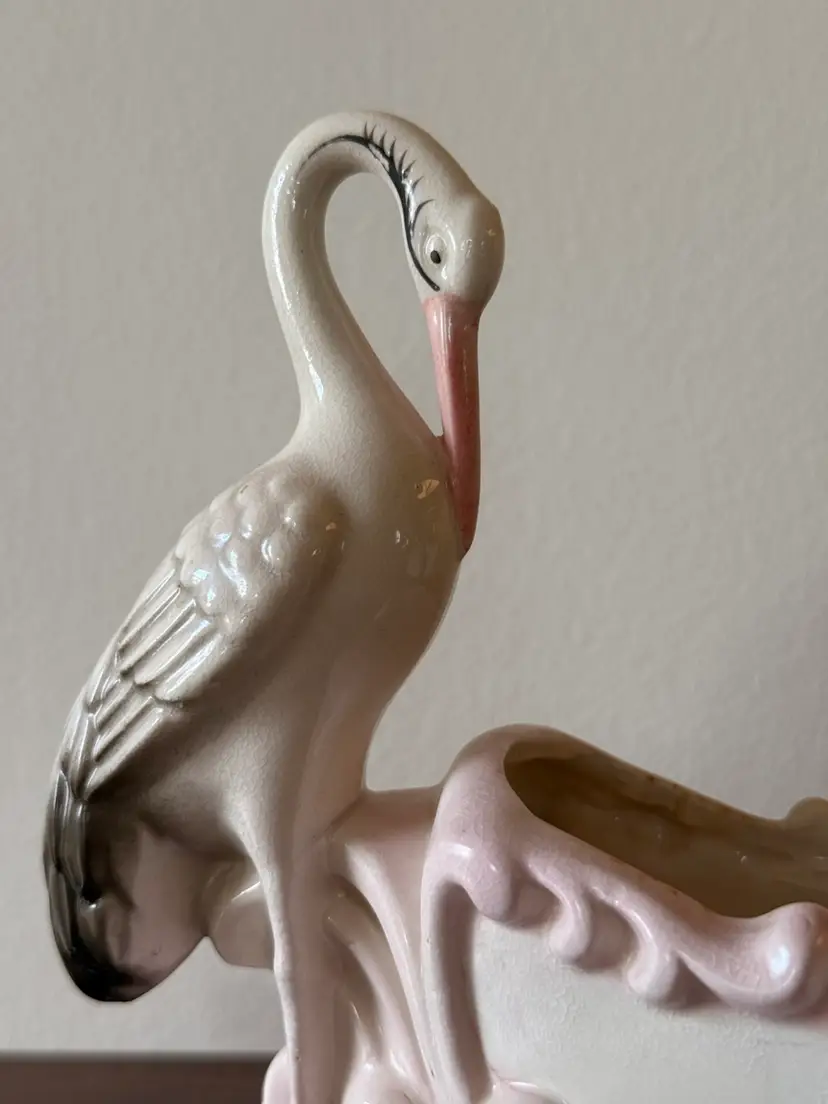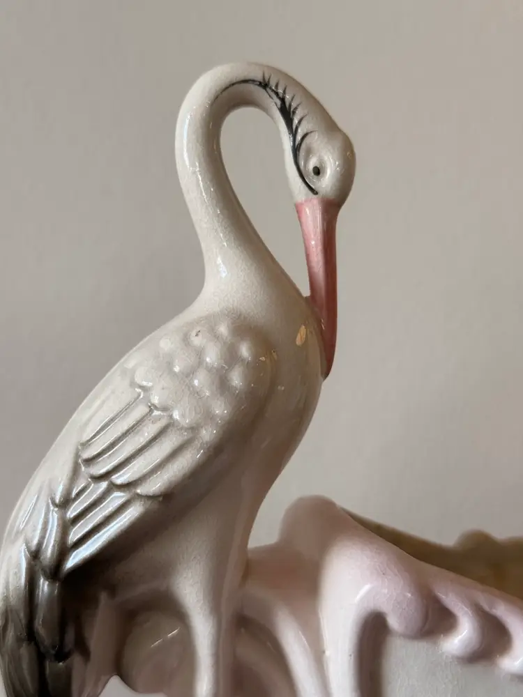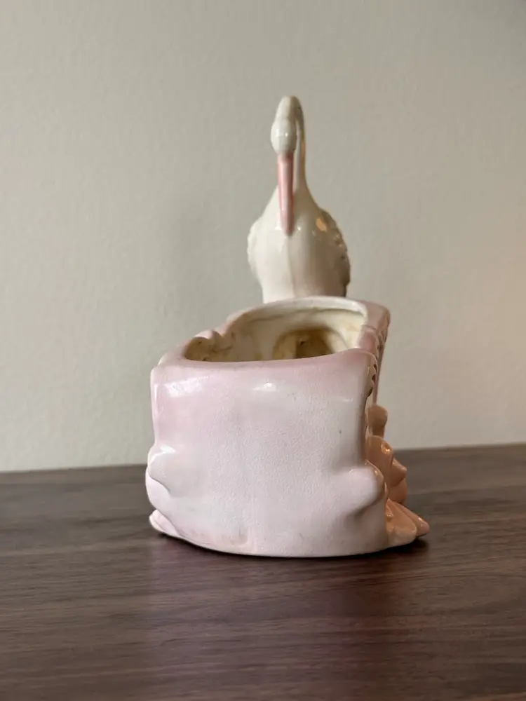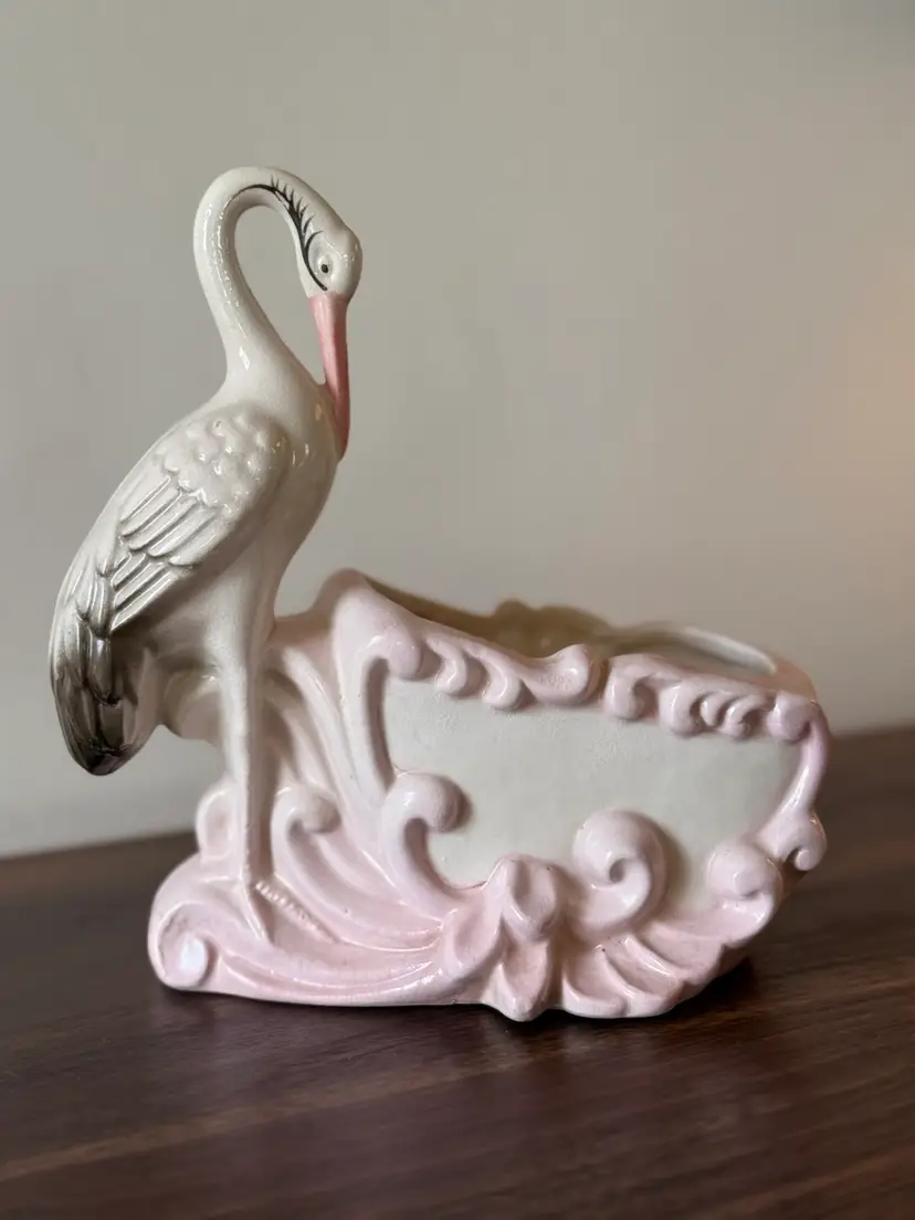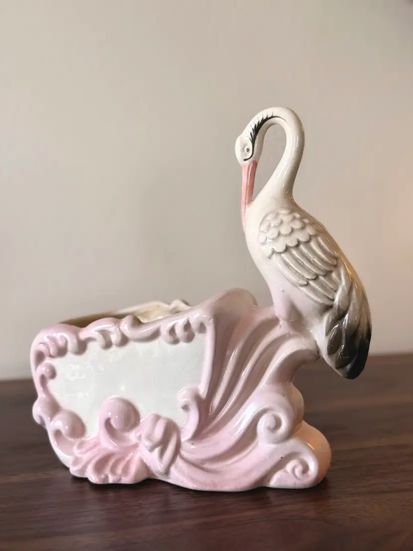 This is a precious mid-century vintage ceramic stork planter/cachepot with a soft blush-pink scrollwork base. Such a pretty, dainty piece—perfect for a small plant, dried florals, or as a shelf accent.