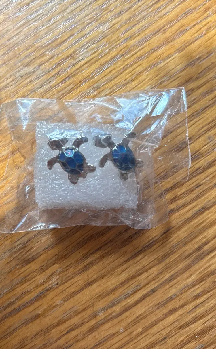 Pair of small sea turtle stud earrings. Blue opal shell. Silver tone metal.