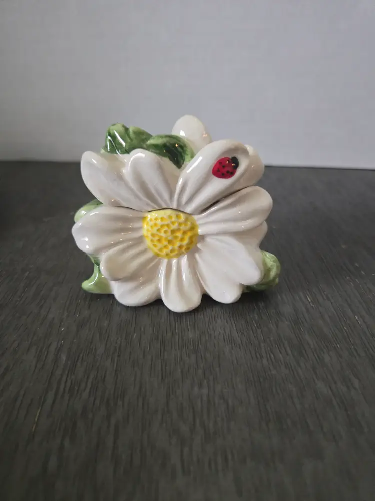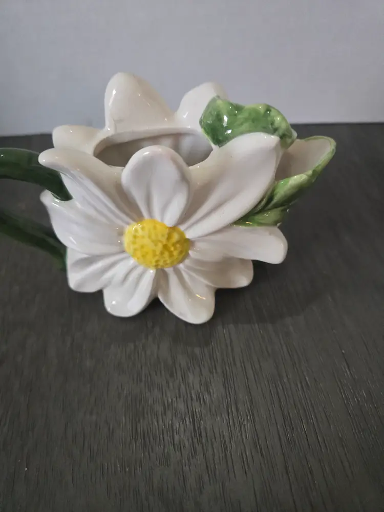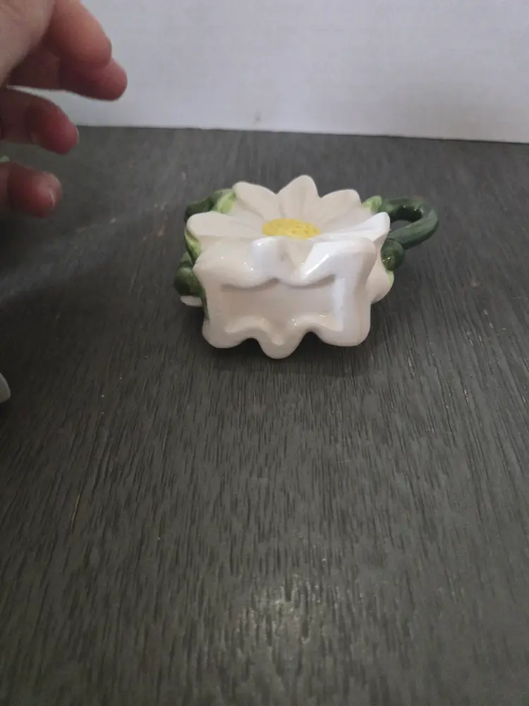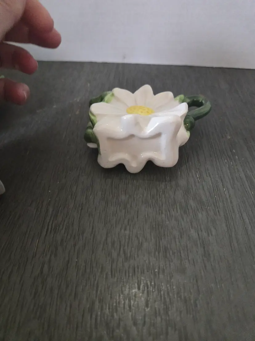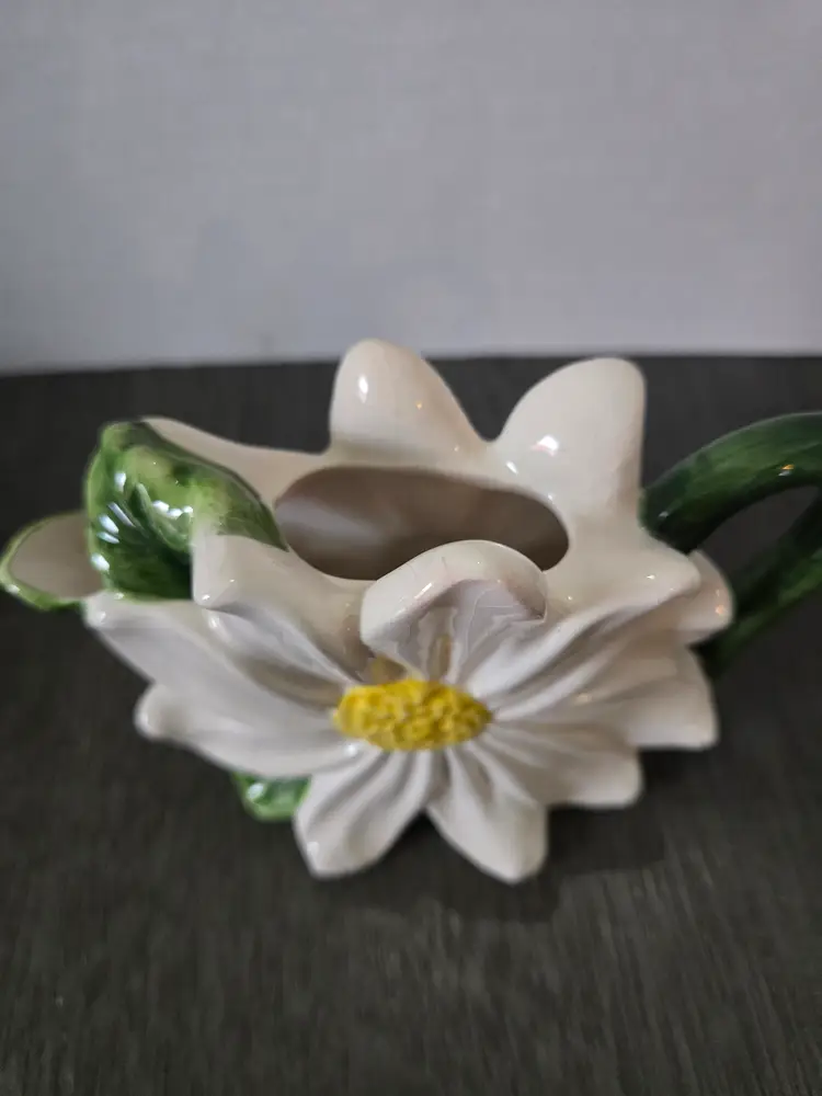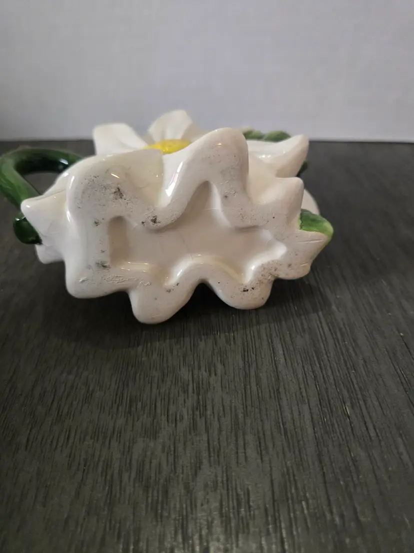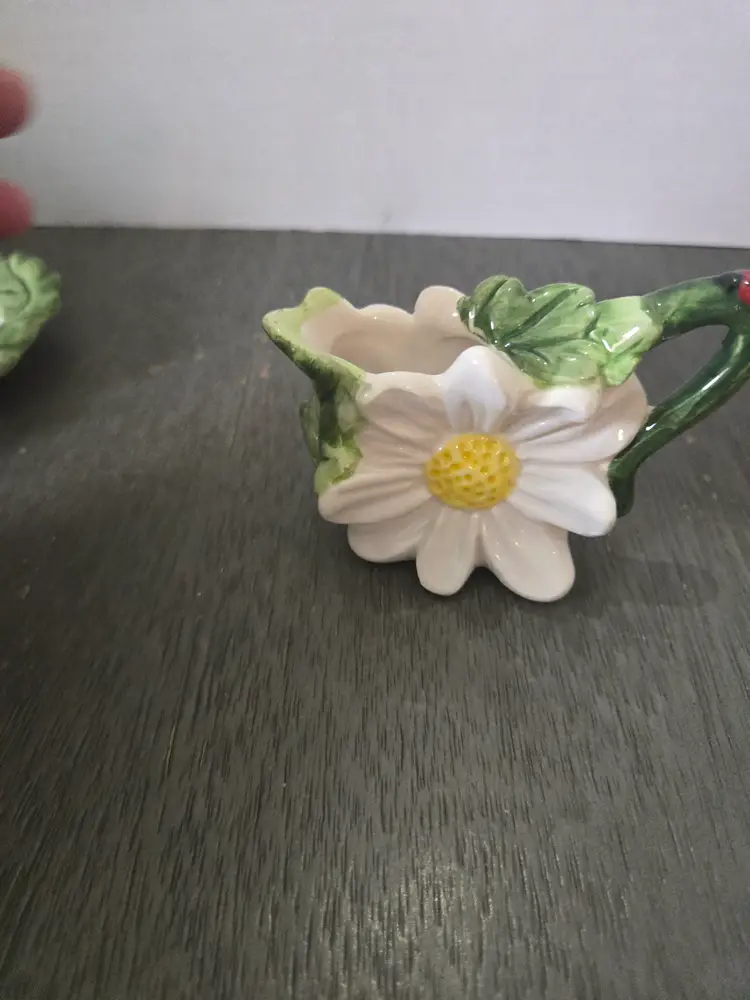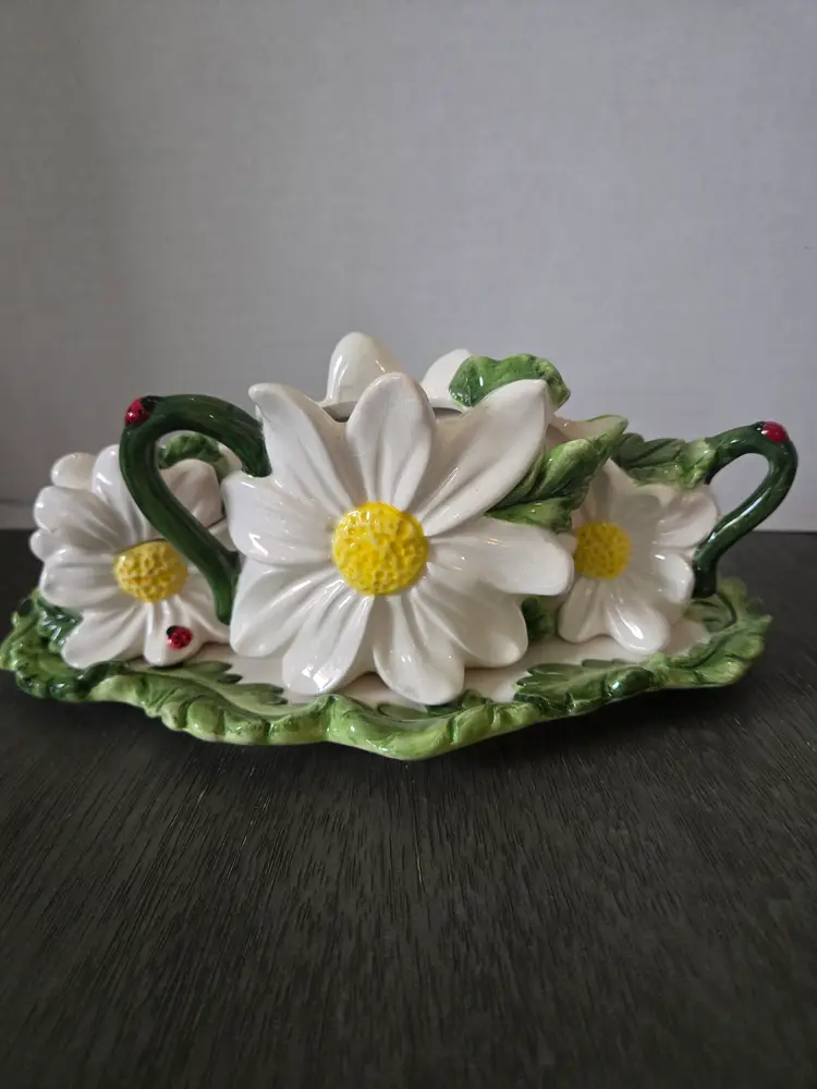 Ceramic Daisy Tea Set, 5 pc Set includes tray, Tea pot, creamer, sugar dish with lid, approximately 9" long, Teapot 5½" x 3½", creamer 3½" long x 2½" tall, Sugar dish 2½" tall x 2½" long, 2 small chips