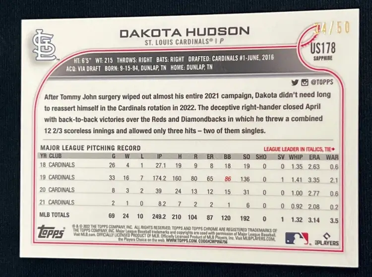 Dakota Hudson 2022 Topps Chrome Update Sapphire Edition Gold /50 #US178 St. Louis Cardinals