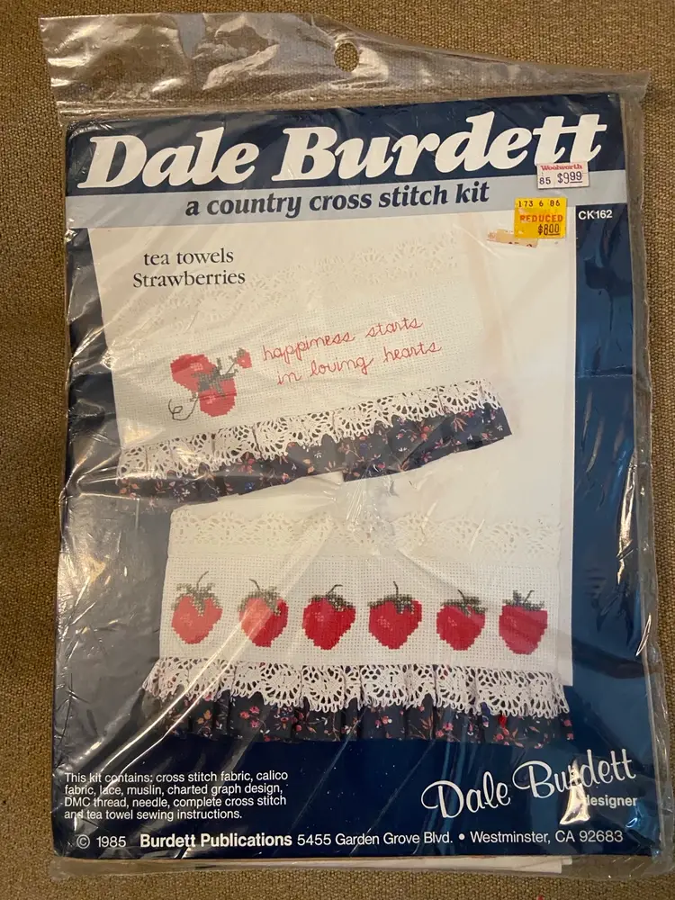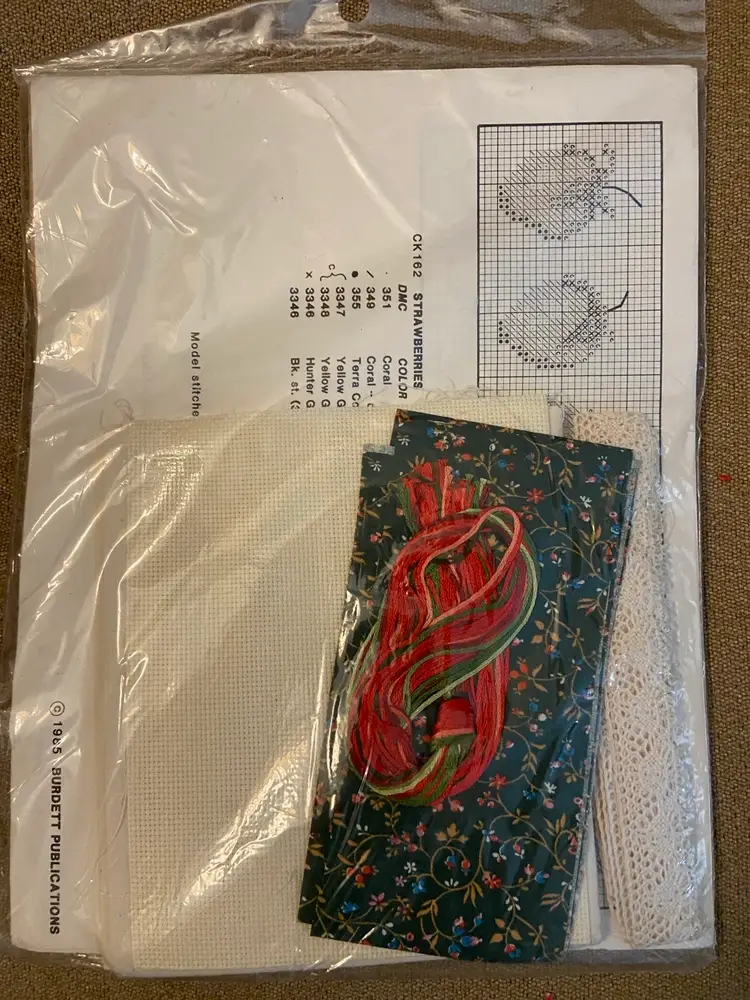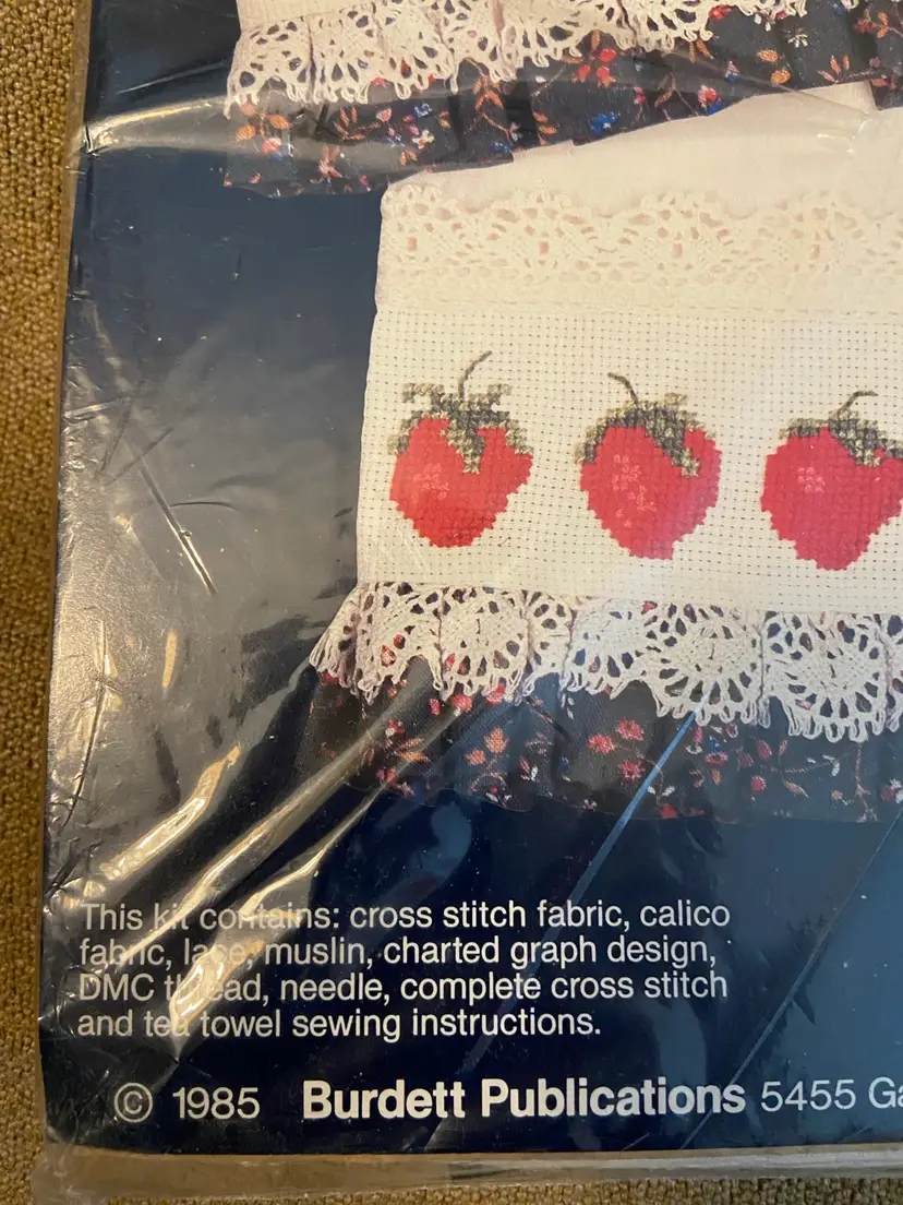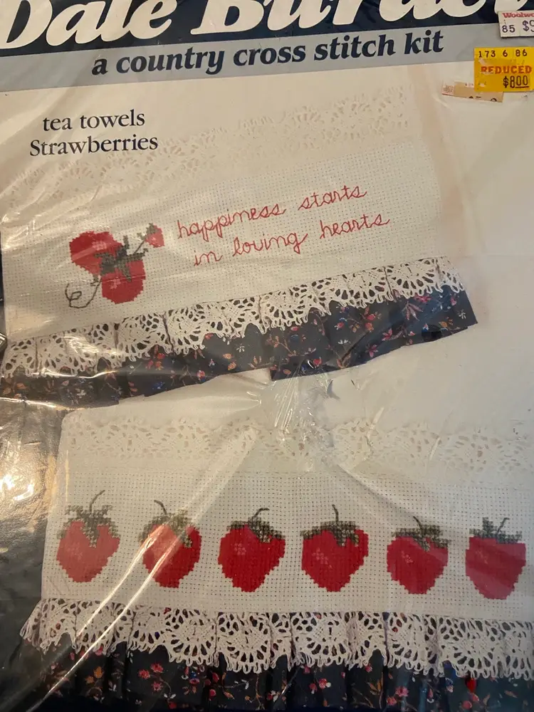 Complete unopened cross stitch kit. The subject is strawberries, and once the kit is completed you will have a tea towel that has cross stitch, strawberries plus “happiness starts in loving hearts” . The kit contains all of the items you need to complete. Plus completed cross stitch and tea towel sewing instructions.