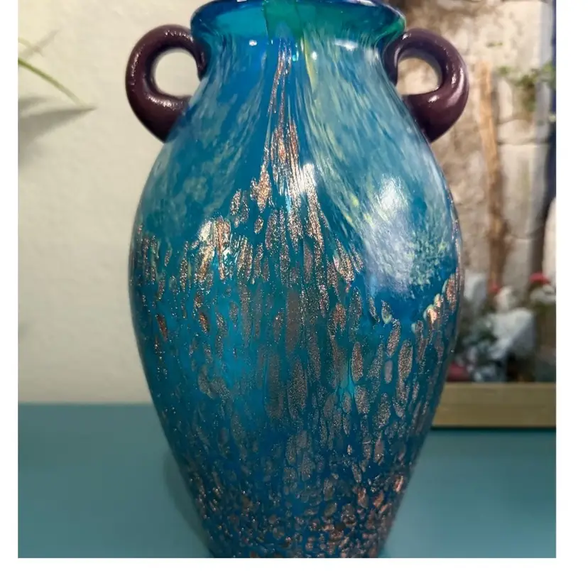 The style is part of the Milano Favrile Hand-blown art glass, with color ingrained in the glass itself using a variety of metals. Amphora shape with two applied handles and copper glitter speckles. Mottled aqua blue body, gold/cream accents, copper flecks, and purple handles. Excellent condition. No chips or cracks.