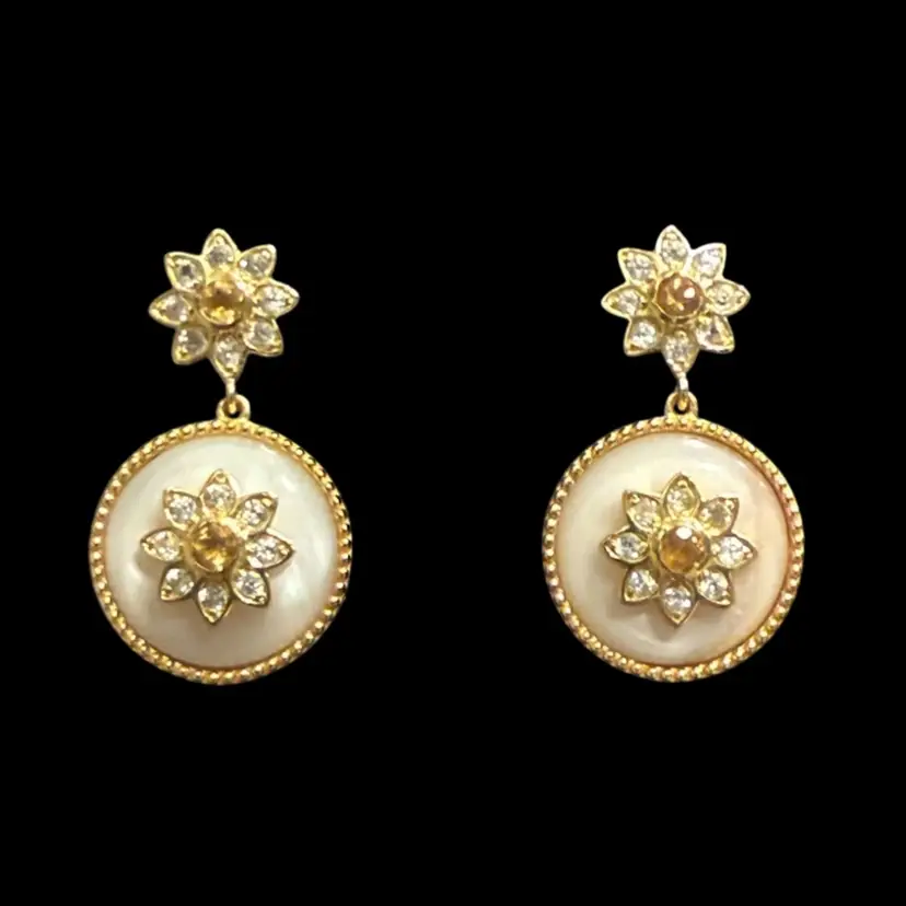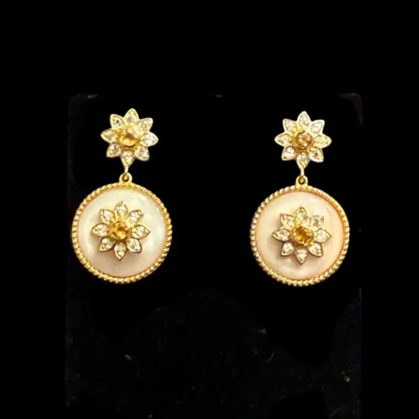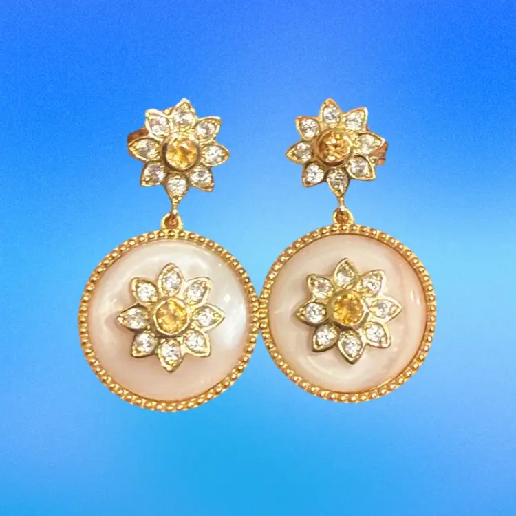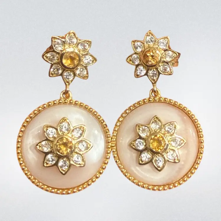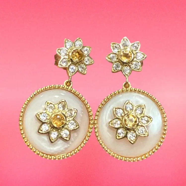 These Dallas Prince designer sterling silver gold vermeil mother of pearl yellow topaz earrings feature a beautiful flower shape, and are perfect for any occasion. The white mother of pearl inlay and yellow topaz flower center stones add a touch of elegance to the sterling silver earrings, making them a stunning accessory for any outfit. With a bohemian and floral theme, these dangle/drop earrings are sure to make a statement with their unique design and high-quality craftsmanship.