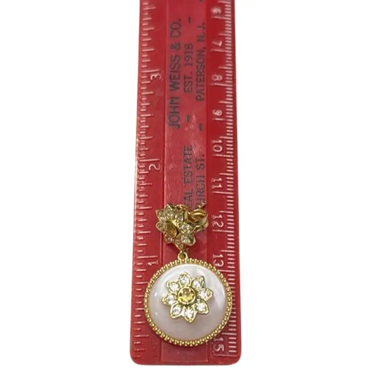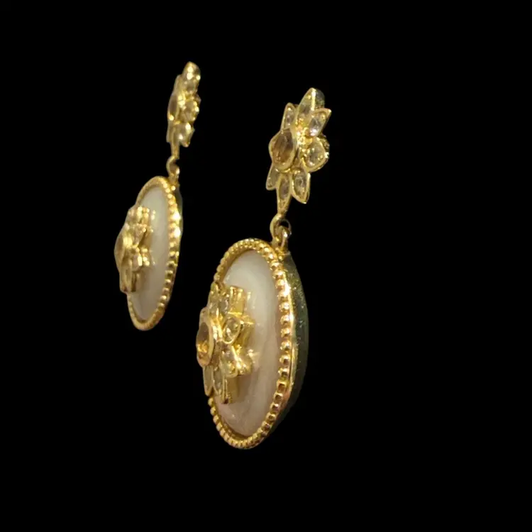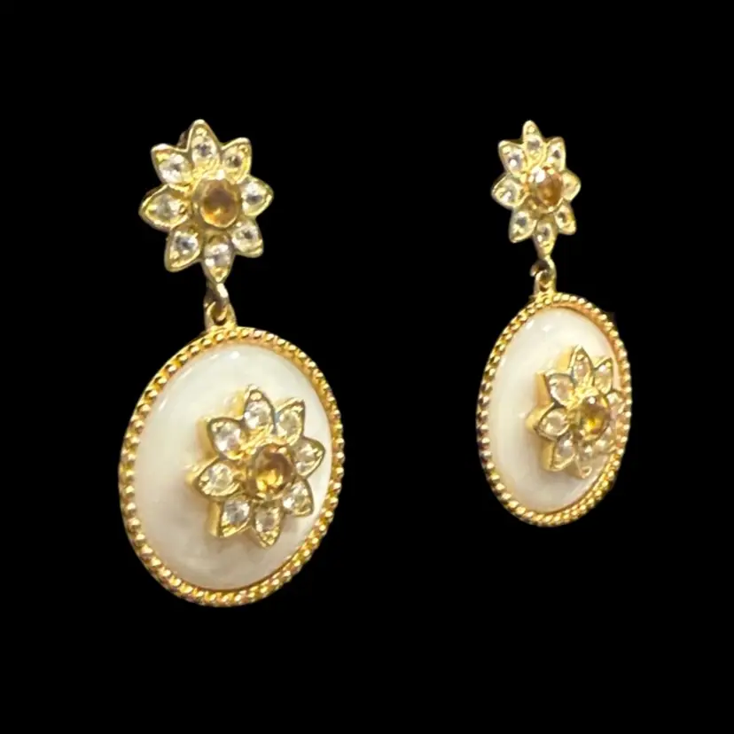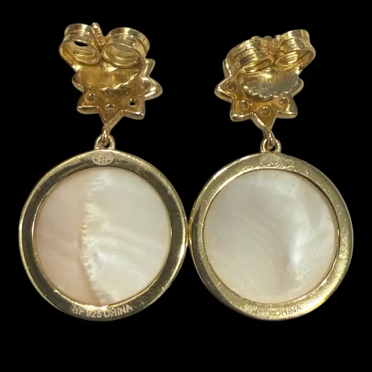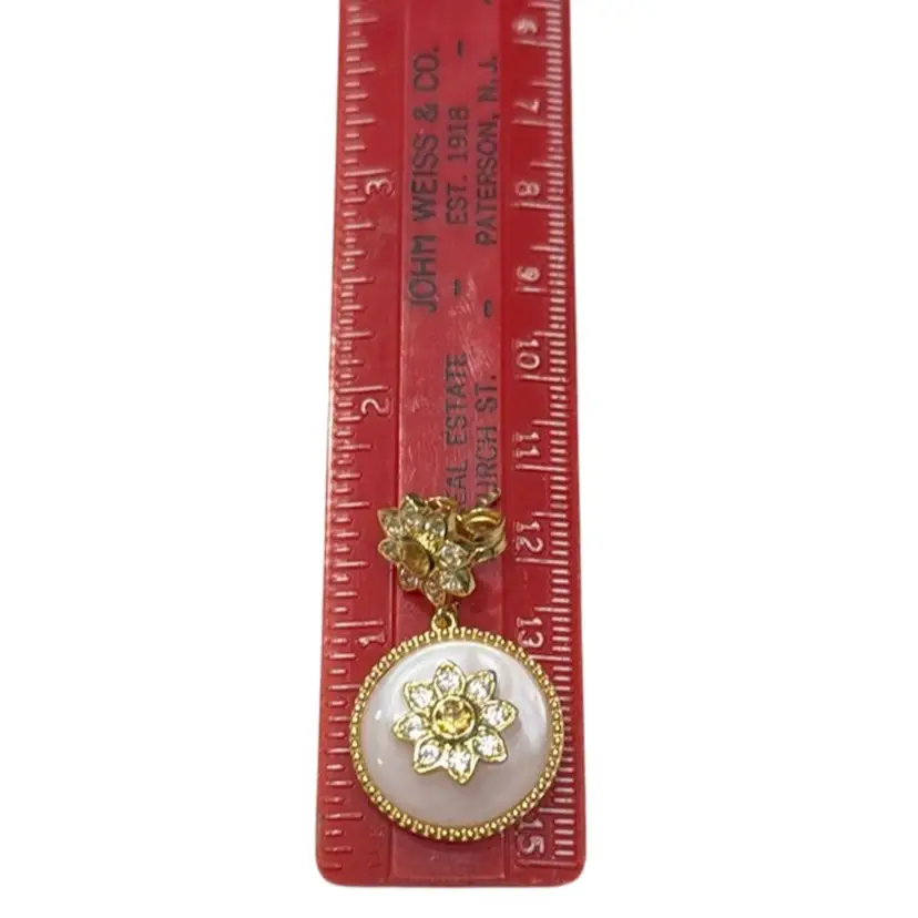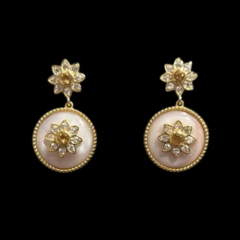 These Dallas Prince designer sterling silver gold vermeil mother of pearl yellow topaz earrings feature a beautiful flower shape, and are perfect for any occasion. The white mother of pearl inlay and yellow topaz flower center stones add a touch of elegance to the sterling silver earrings, making them a stunning accessory for any outfit. With a bohemian and floral theme, these dangle/drop earrings are sure to make a statement with their unique design and high-quality craftsmanship.