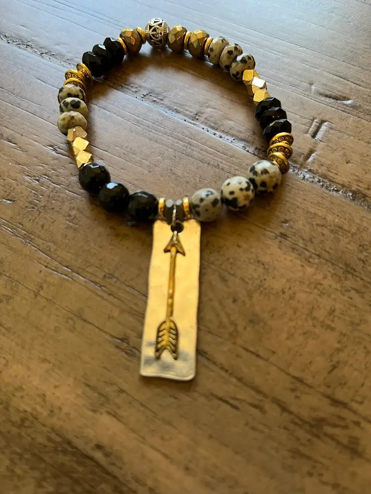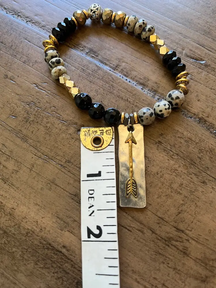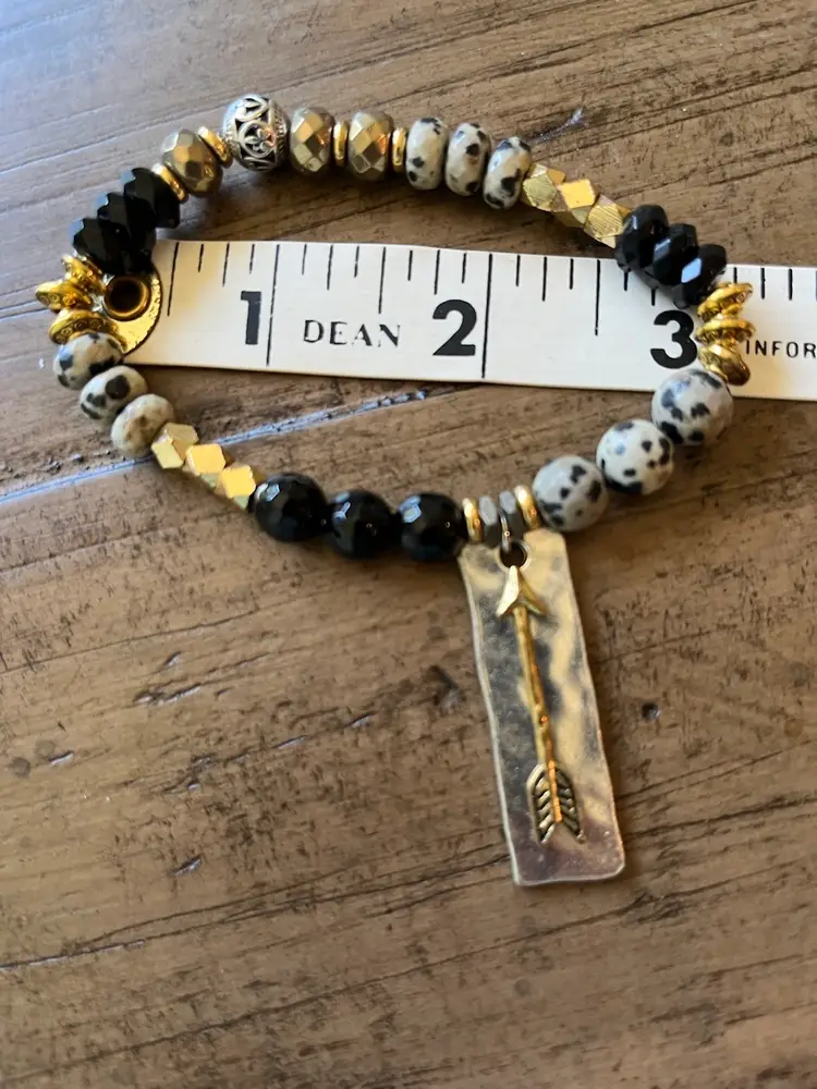 Dalmatian Jasper, black glass, gold tone and silverplated spacers with arrow charm. I will combine shipping.