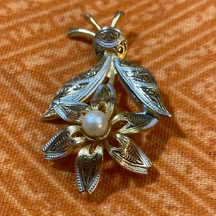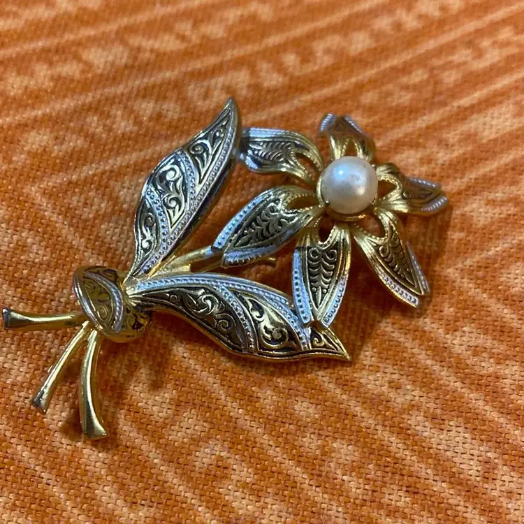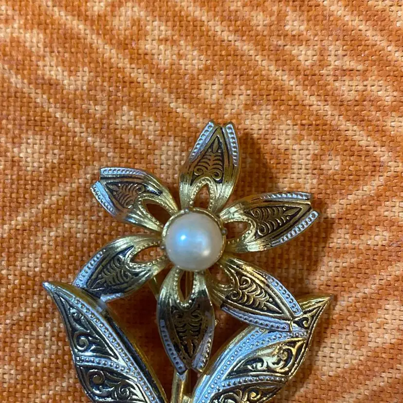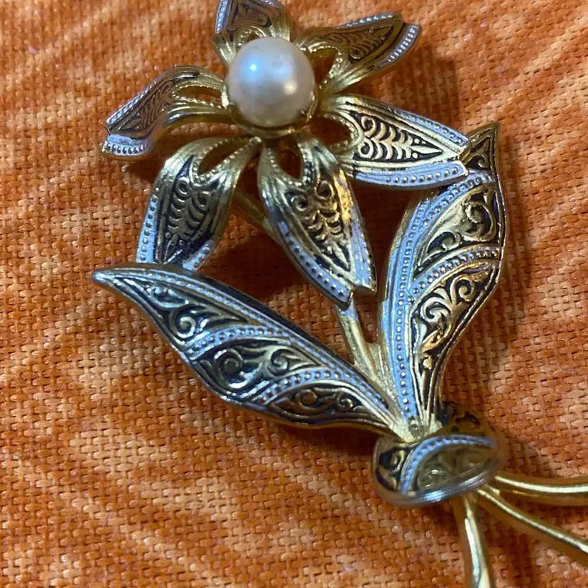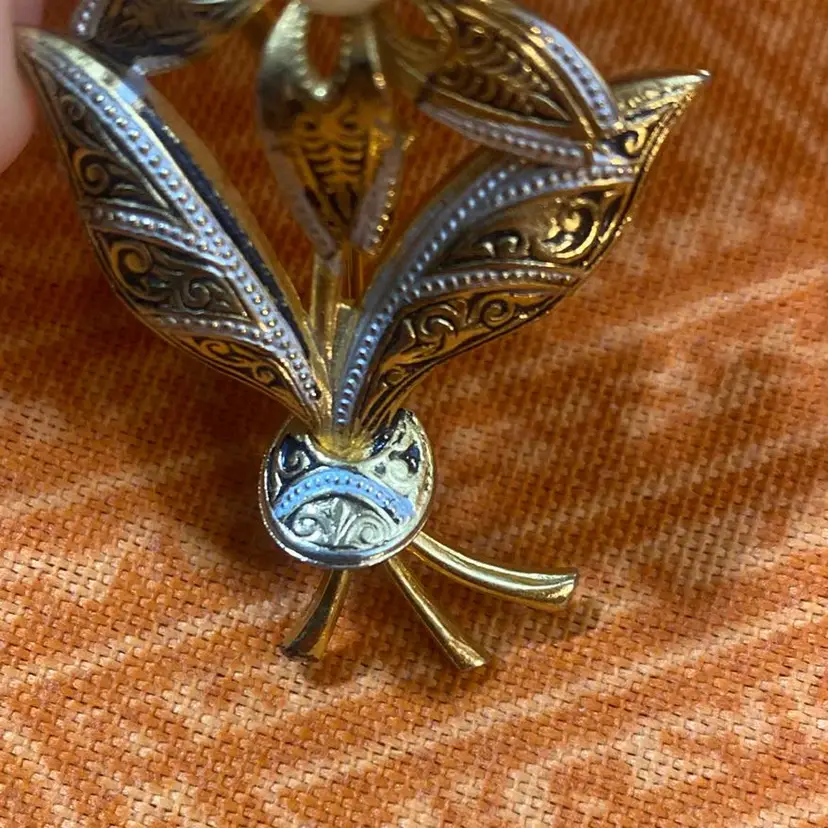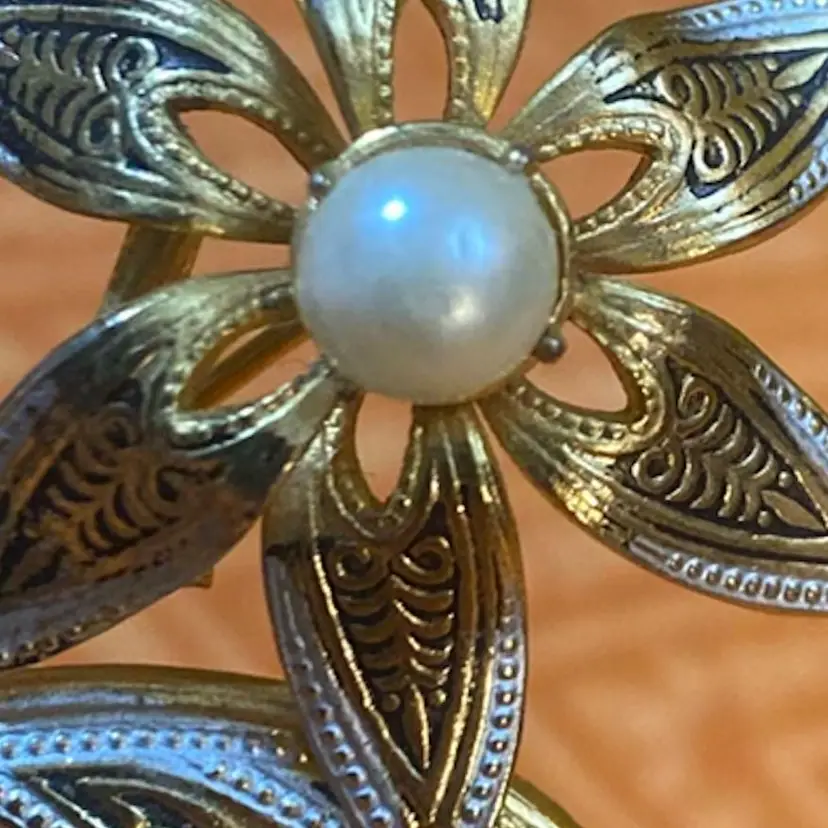Colors- black silver and gold tone Size- 2” Condition- some black and silver paint wear. A little metal patina at ends. Faux Pearl has a slight indent at center. Please see photos as it’s part of my description.