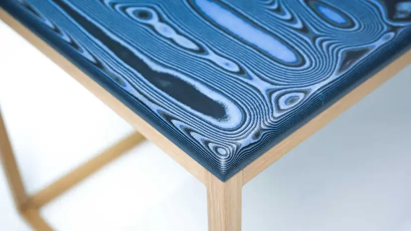 The worlds first “Damascus Denim” table. This is a Blacktail original creation, over 1000 sq ft (100 square meters) of denim fabric infused with epoxy, and layered in such a way that a damascus pattern has been exposed on the top. The patterns you see are not painted or printed on, you are seeing the actual layers of denim. And despite what is looks like, the top is as smooth as glass and many times stronger than wood. While maintaining a warm, wood like feel.