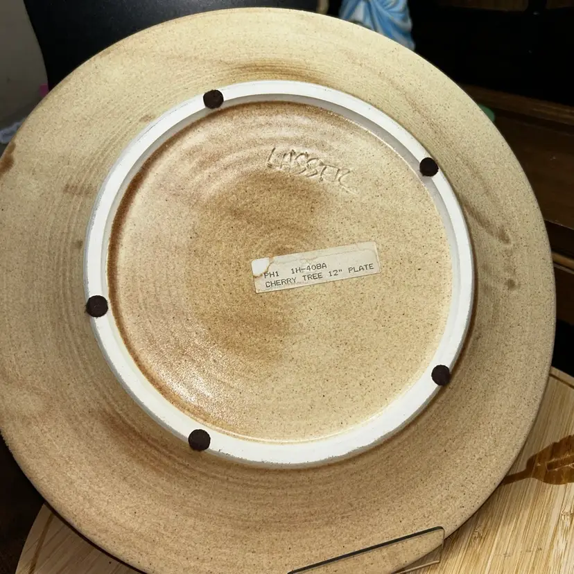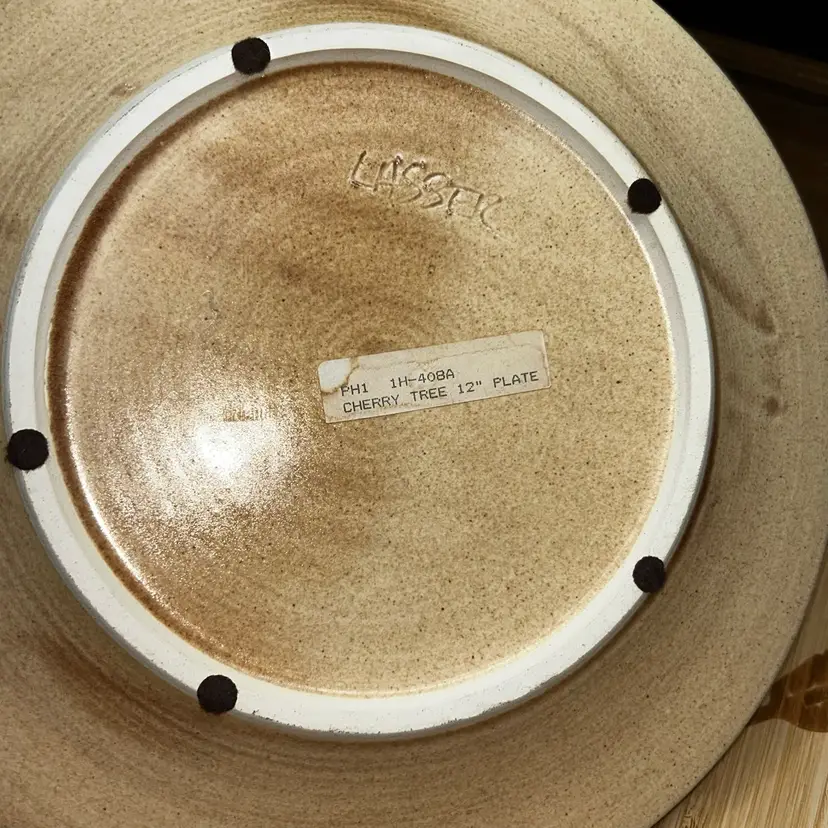 Twelve inches in diameter. Excellent condition. Label on back says “Cherry tree” 12” plate, PH1-1H-408A. Signed “Lasser”.