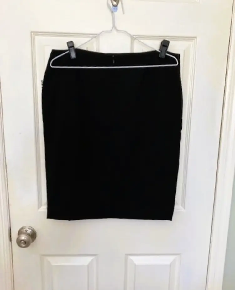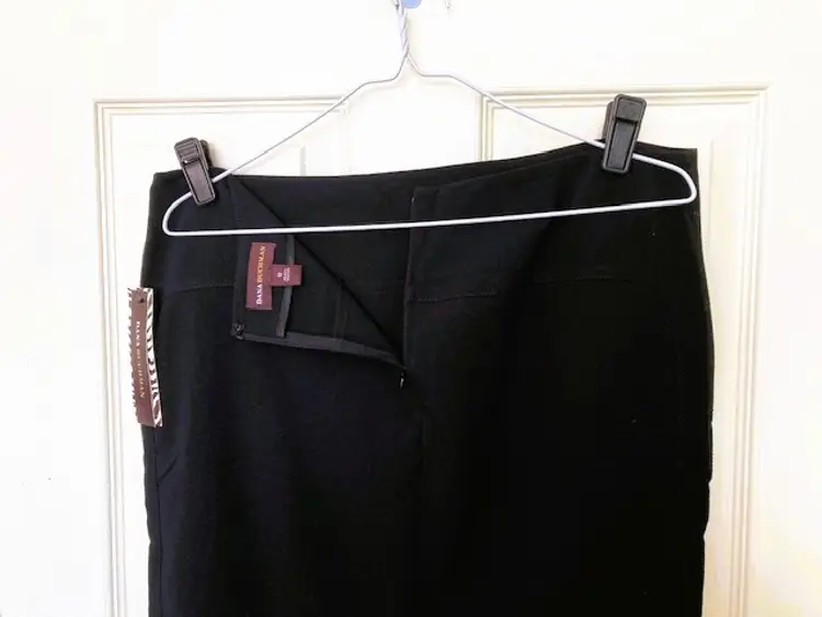 Dana Buchman NWT Women's Black Skirt Size 12. Style: 001 Black Tie. Waist measures 17" across, hip area 21 1/2" across, length 22 1/2". Rear zipper close with hook and eye, and kick pleat. Unlined. 62% polyester, 34% rayon, 4% spandex. Machine wash inside out, cold, gentle cycle. Can be dry cleaned. From a smoke free/pet free home.