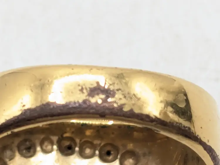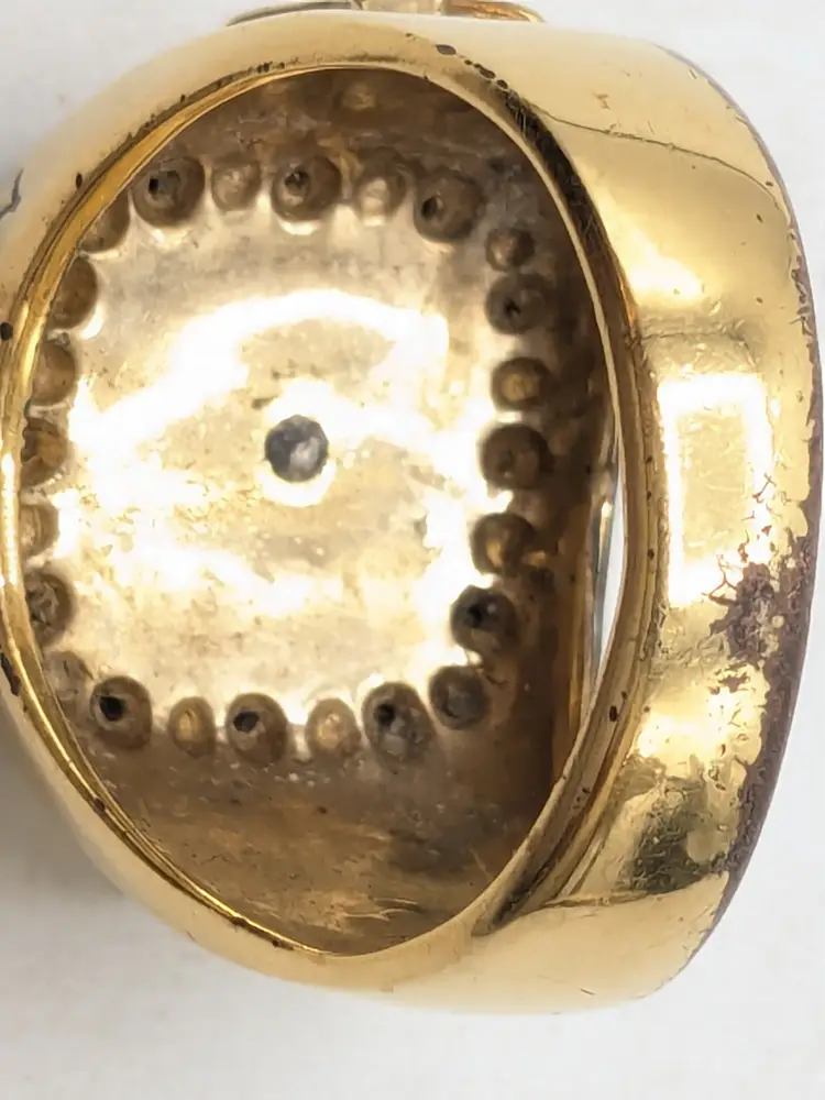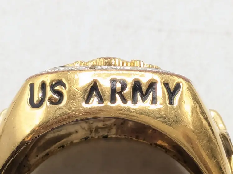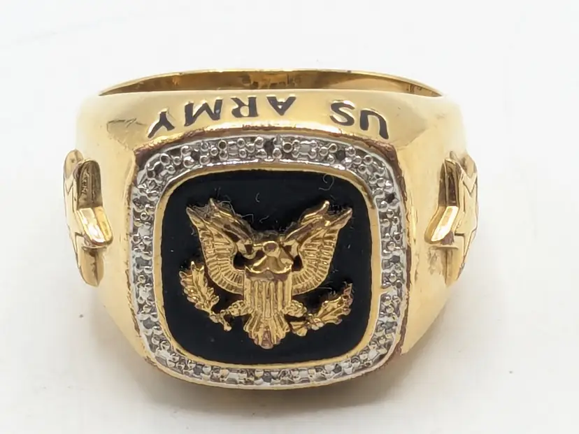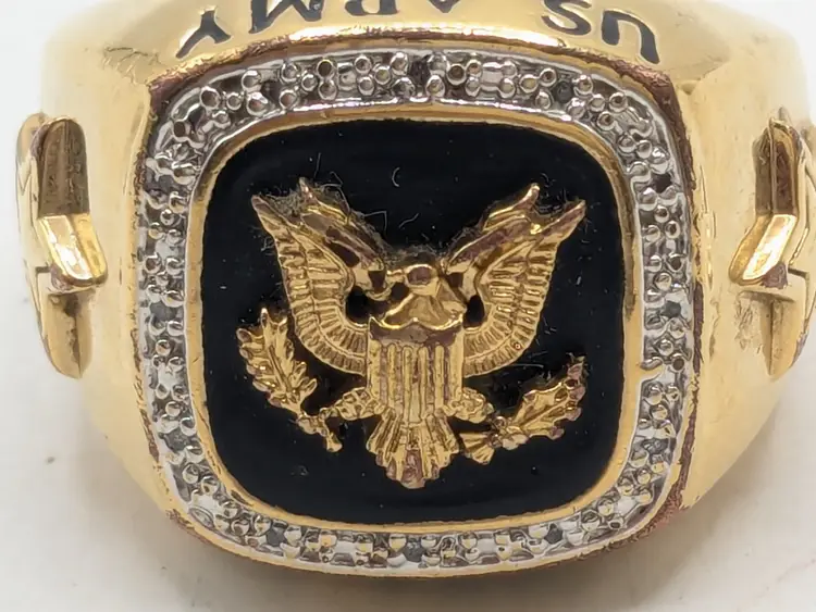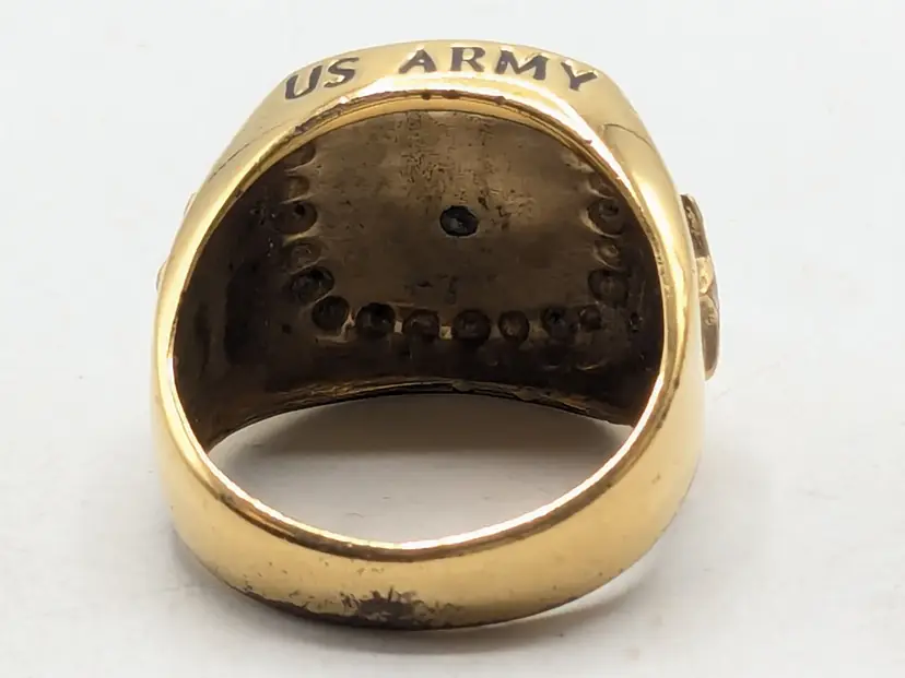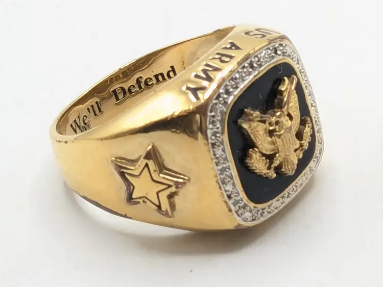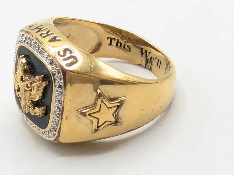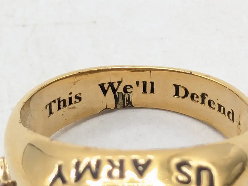 Go Army! Good condition with some wear to the plating on the inside and out on back of band. This is depicted in the last three photos. Features a bold eagle emblem on a black background surrounded by diamonds. Gold ion plated. Inscribed inside ring is "This We'll Defend". Size 12. wen