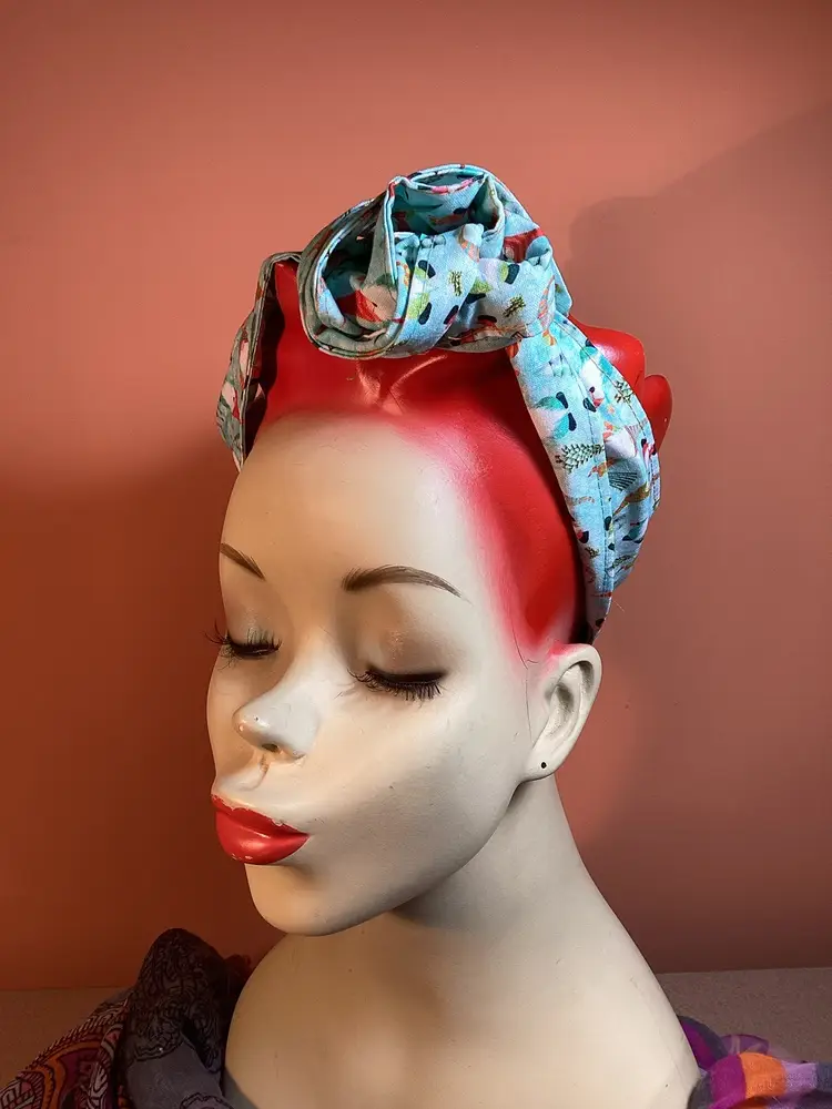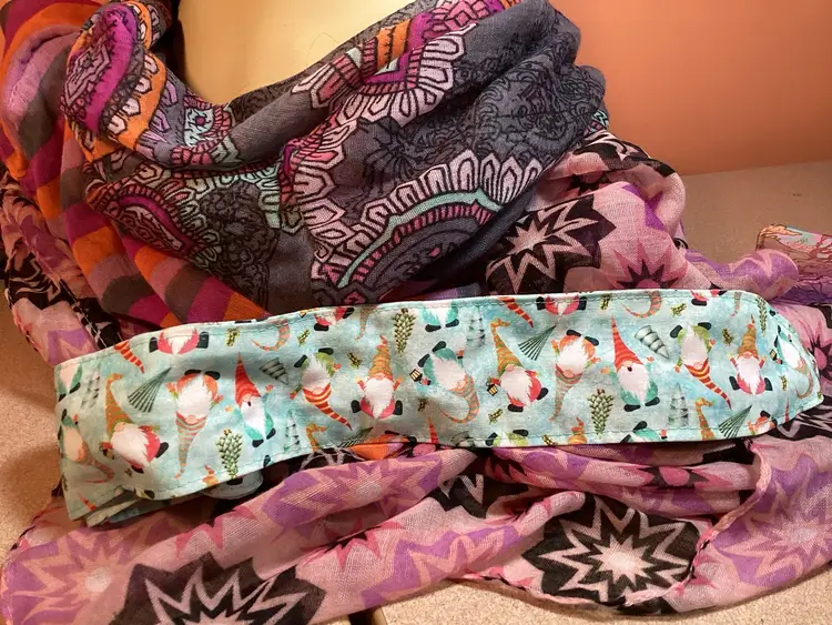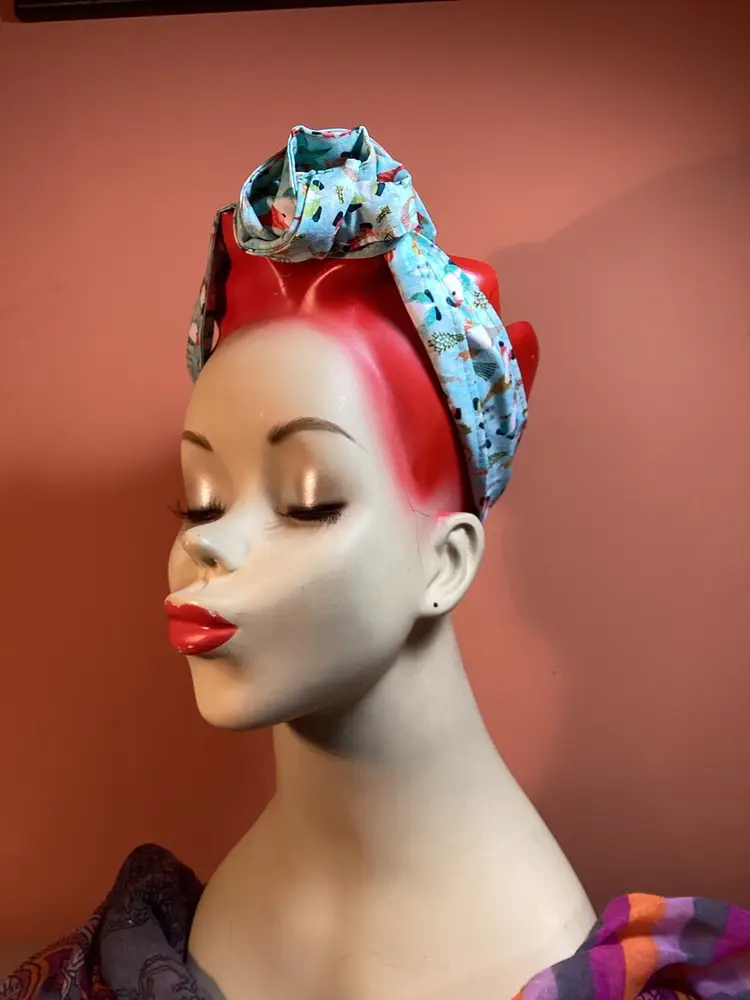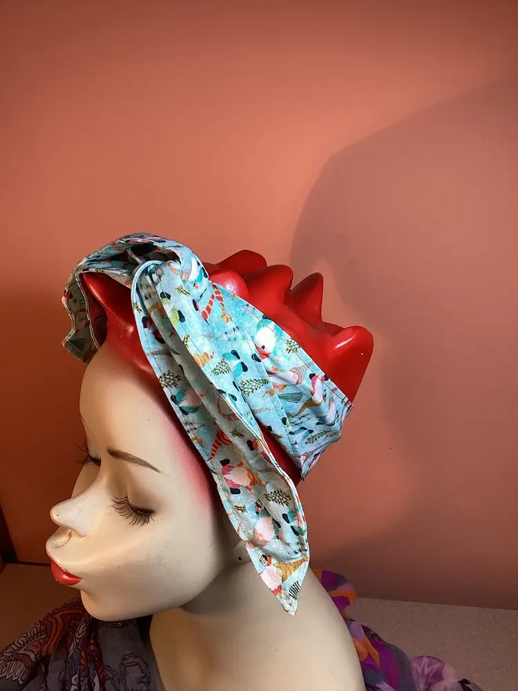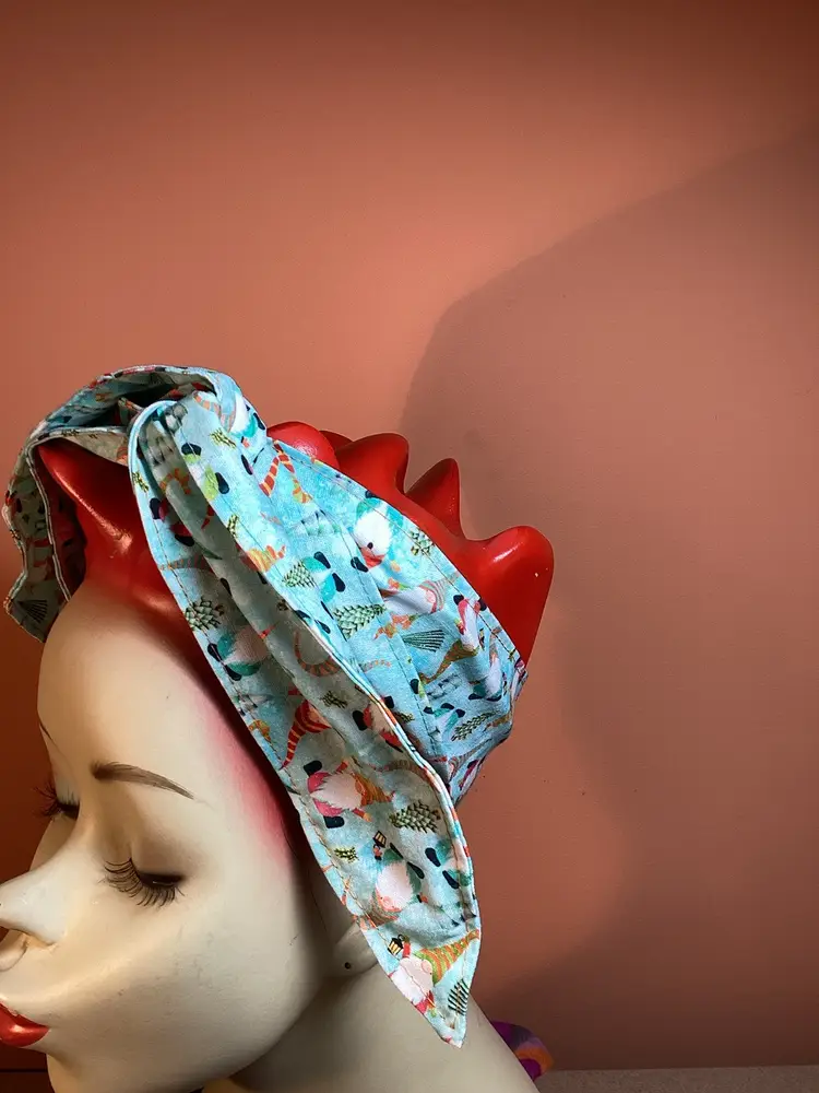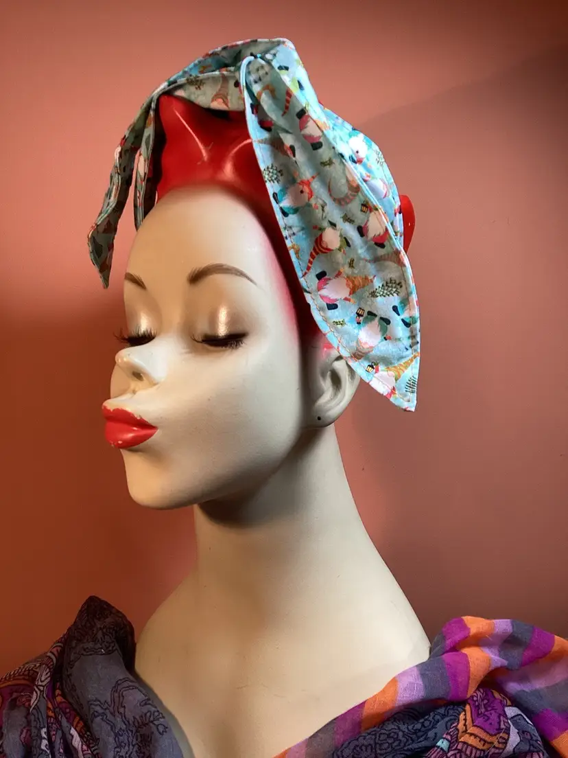 Add a touch of vintage charm to any outfit with this unique and trendy hair wrap featuring adorable dancing gnomes in a Christmas theme. Versatile and retro, this hair wrap is the perfect accessory to elevate your style. You can do a simple wrap and leave the ends hanging, or wrap the ends around each other to create a rose. Experiment with different ways to wrap around your head, the wire will help it stay in place no matter your hair length. Each wrap is hand made and the placement of the design may vary. Approximately 40” long. #handmade #recycle #sustainable #upcycle #boho #slowfashion #vintage #hairaccessory #christmas #holiday #retro #gnomes