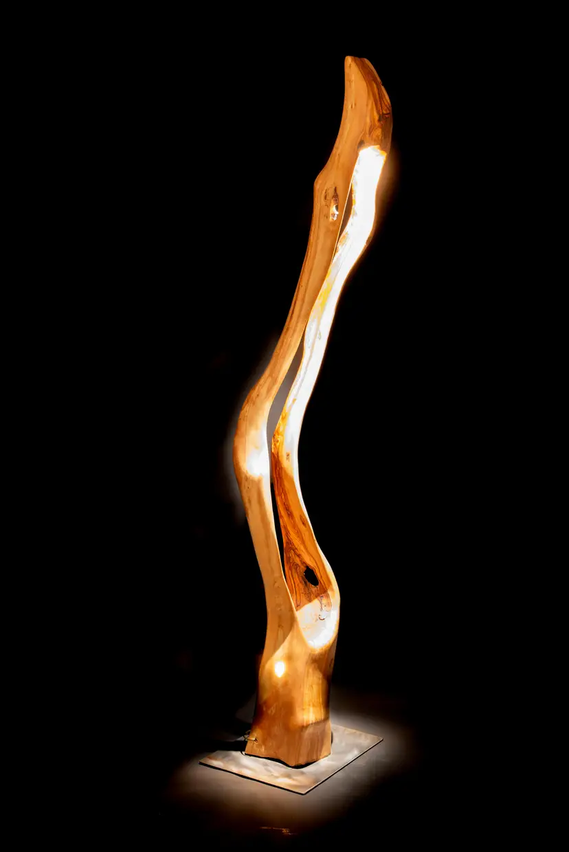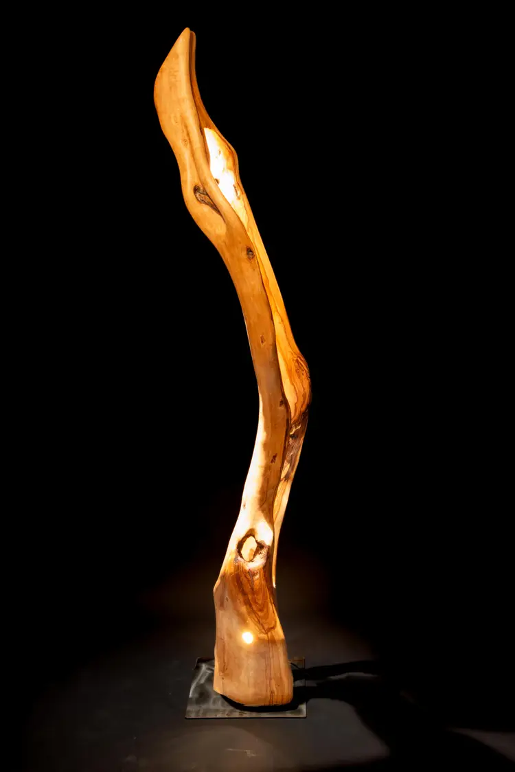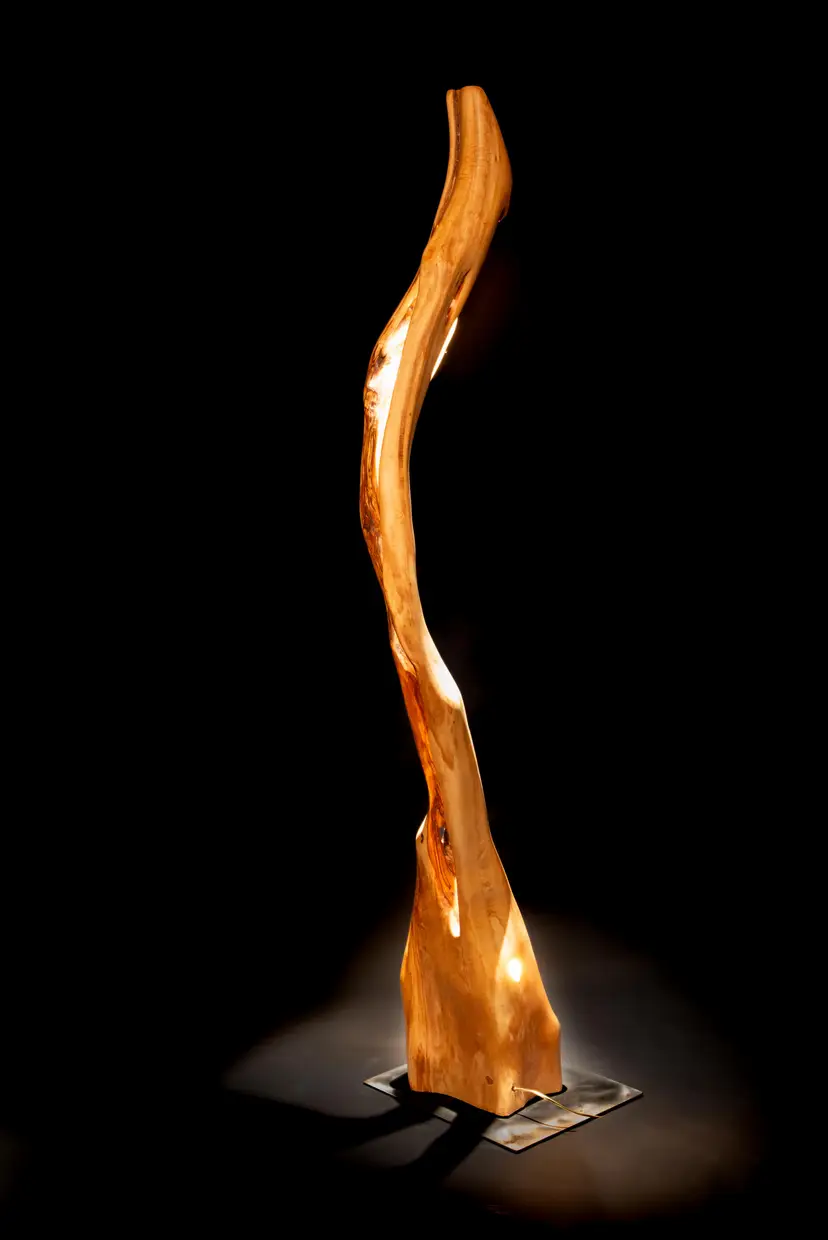 Each piece begins as a single log or cross-section—often reclaimed locally—and is transformed through a slow, hands-on process of carving, burning, and refinement. Light is then integrated into the form, revealing hidden structures, depth, and movement within the wood itself.