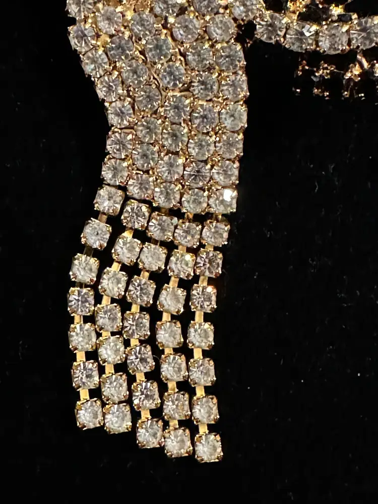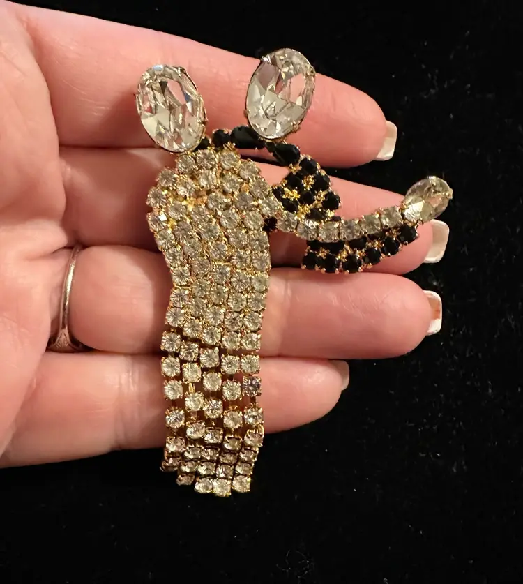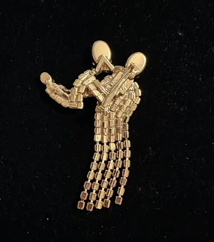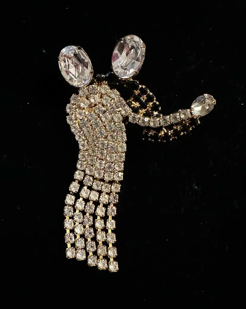 Fun vintage brooch! Rhinestone Dancing couple with articulated fringe. It is 3” x 2”. Possibly made by Butler & Wilson. It is in excellent condition.