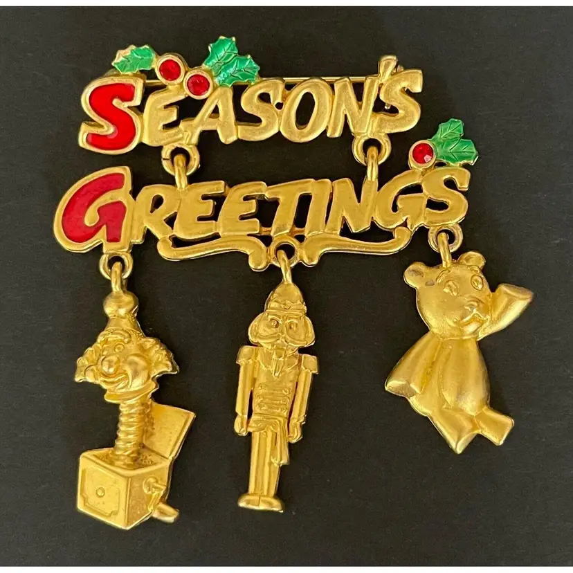 This is a VINTAGE DANECRAFT SEASON’S GREETINGS GOLD TONE CHRISTMAS BROOCH. It is articulated, has three dangle charms, and is signed.
