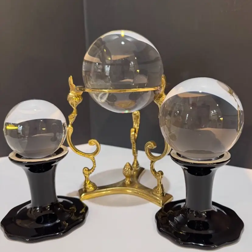 Set of 3 solid clear glass balls. Balls measure about 7.5”, 10” and 12”. No chips or cracks. Displays not included. Brass is in BIN