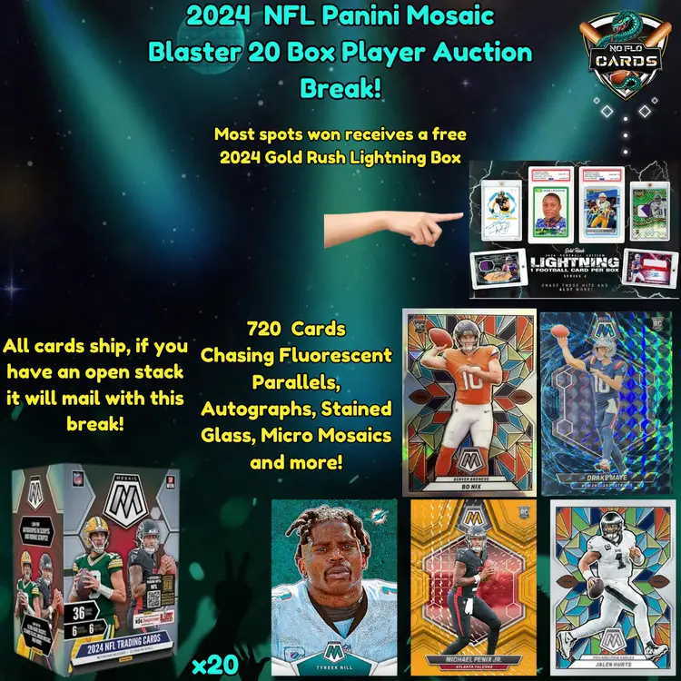 You are bidding on all the cards of the player listed in the title in this 20 blaster box rip of 2024 Panini Mosaic Football Cards! Auctions end Saturday 1/18/25 and rip will happen immediately after last auctions end! Opening will be viewable & simulcast on the CardKulture District as well as simulcast to YouTube, Twitter, Twitch and Instagram. US Shipping is $5 for your first auction spot won and FREE on any additional spot won after that! Any non-base hit pulled of a subject who is NOT listed in the auction will be assigned by draw between all participants. Any dual or multi-subject #'d or auto cards featuring multiple subjects will be assigned live between the spots depicted on the card. Most Auction spots won will receive a free sealed 2024 Gold Rush Lightning Box!