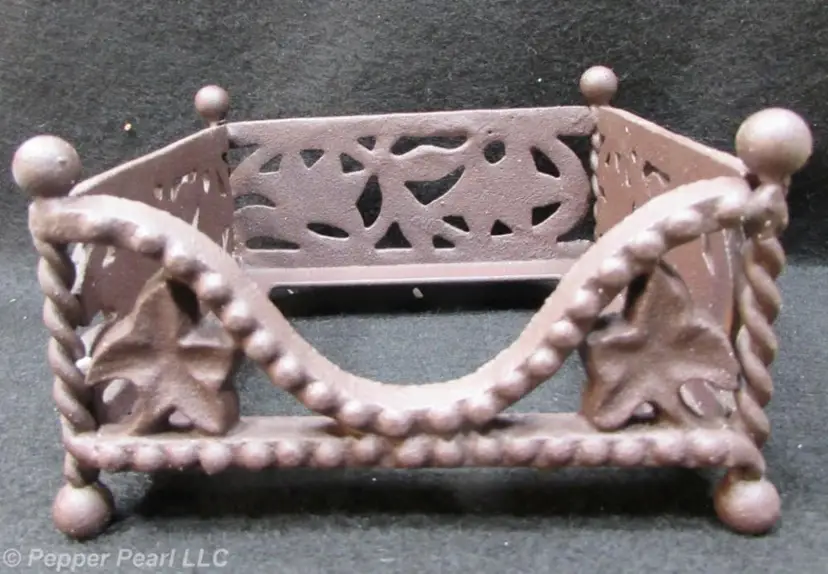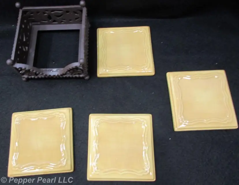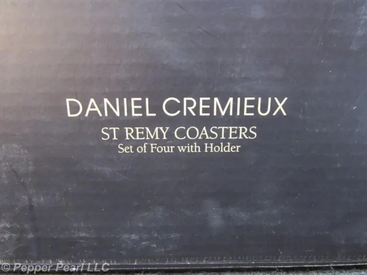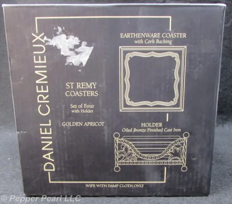 Daniel Cremieux St Remy Coasters, Set of 4 with Holder, Golden Apricot Stoneware coasters with cork backing Cast iron holder with oiled bronze finish With original box. Excellent condition. Box has wear. Sold by Dillards. Made in China.