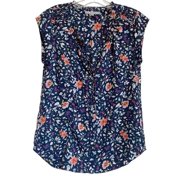 Daniel Rainn Women’s Top Cap Sleeves Blue Multi Color Pattern Pleats V-neck pleated accents at shoulders Fringe ruffles at neckline Blue multicolor print Pretty colorway with blue, purple, yellow, pink/orange, gray -short sleeve hi-low hem design (back is longer than front) flowy bohochic style SZ S Excellent Pre-owned Condition - no flaws Please see measurements and photos to ensure proper fit. Measurements taken flat: Armpit to armpit: 19" Shoulder to hem length: 25" - 26" 100% Polyester Machine wash cold Tumble dry low