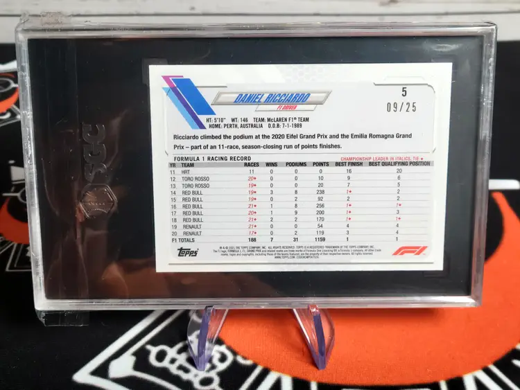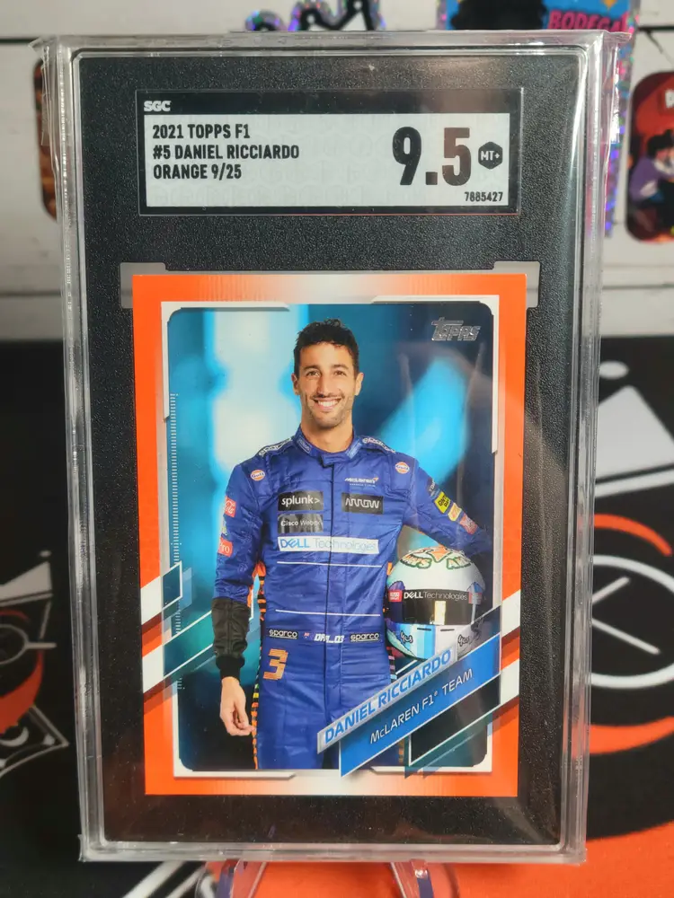 2021 Topps Formula 1 Daniel Ricciardo True Orange parallel, card #5, graded SGC 9.5 Gem Mint, serial numbered out of just 25. This is from the non-Chrome flagship Topps F1 release, not the Chrome version, making it significantly rarer in graded condition. A premium low-population parallel of one of F1’s most popular drivers.