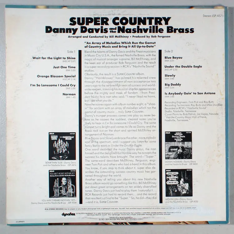 Super Country, by Danny Davis, peaked at no. 25 on the Billboard Country Albums Chart. Davis was a country music band leader, trumpet player, vocalist and producer, best known as the founder and leader of the Nashville Brass.