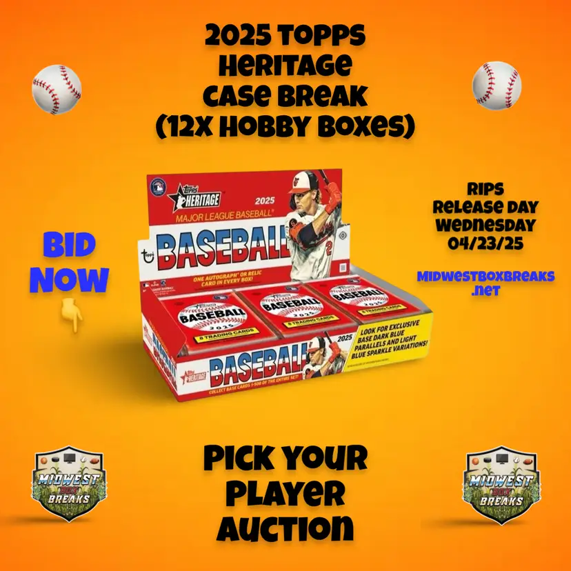 You are bidding on all the cards of the player listed in the title in this Hobby Case (12x Boxes) of 2025 Topps Heritage Baseball Cards. Case will be opened LIVE after auctions end on release day Wednesday 04/23/2025. Opening will be viewable & simulcast on Midwest Box Breaks District as well as YouTube and Twitter. US Shipping is $5.00 for your first auction spot won; each spot after that is FREE SHIPPING! Any spot won where no cards of the player are found in the box will receive a bonus card or pack from Midwest Box Breaks. Notes on the Heritage Checklist - there is a specific spot for the Notable Americans insert set (& any Notable Americans Cut Autos). This spot receives all such cards even if a subject has another card in the set. Any other hit pulled (Cut Autos, Sketches, Hidden Gems etc) of a player who is NOT listed in the auction will be assigned by draw between all participants. Any dual or multi-player #'d or auto cards featuring multiple players will be assigned live between the spots depicted on the card.