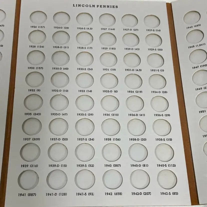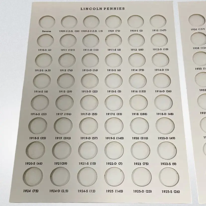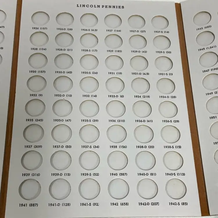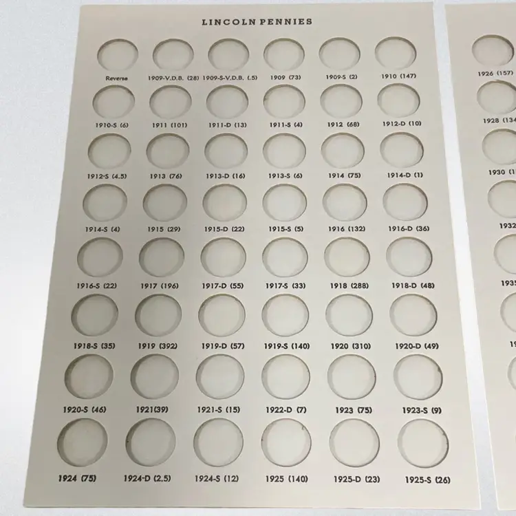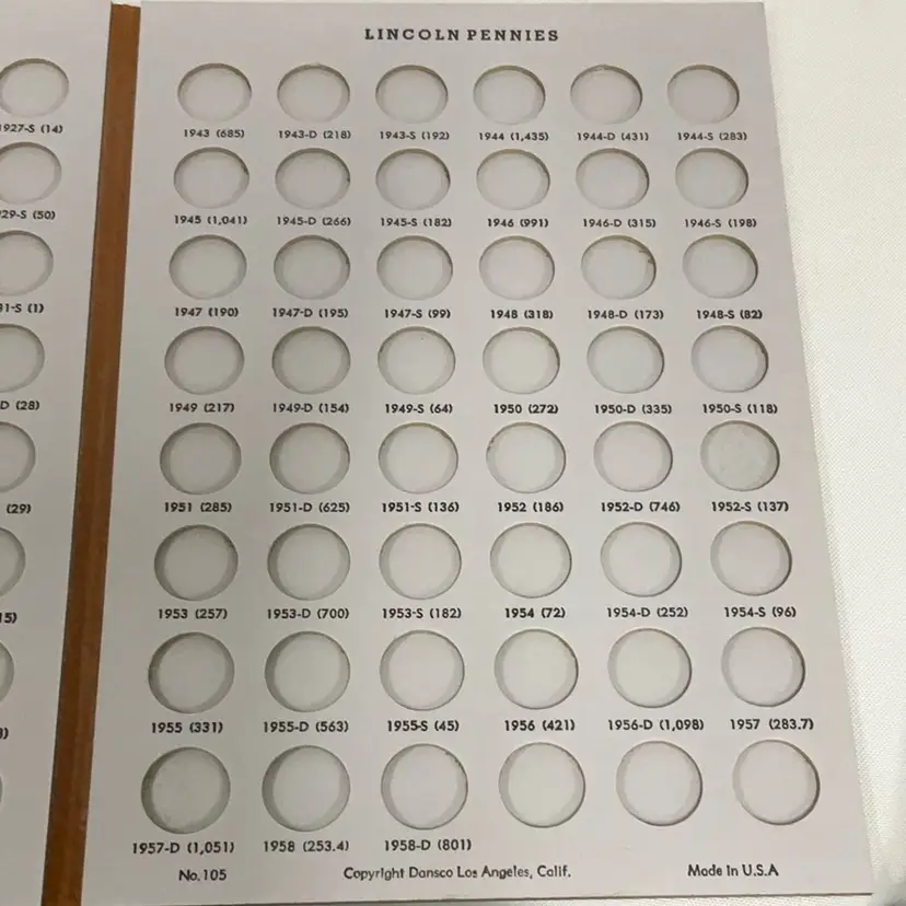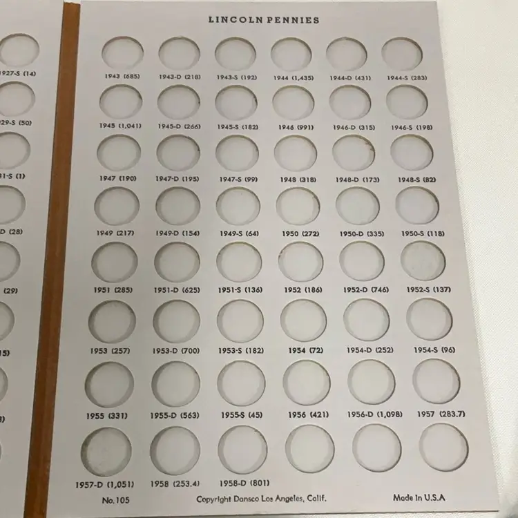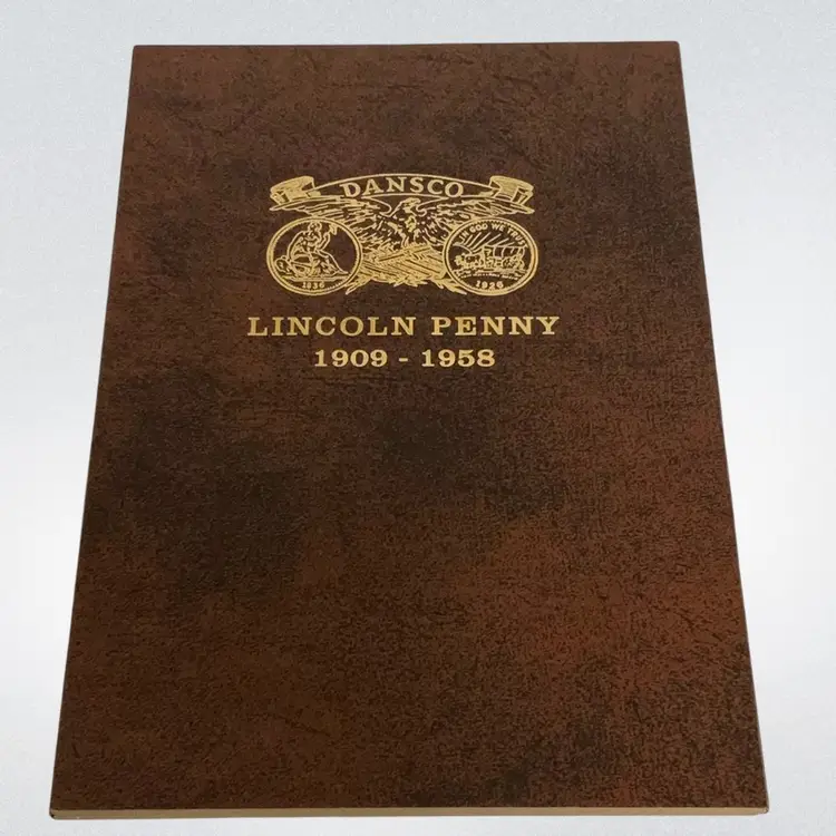 This three-panel folder holds Lincoln Cents from 1909 VDB to 1958-D, with 3 extra spots. These Dansco "all-in-one" folders fold into a compact book shelf size measuring 6 1/2 inches by 9 1/4 inches. These folders are of a lie-flat construction making it easy to insert coins into the ports. They open out to allow inspection or display of your coins from the beginning to the end without having to turn pages. They are bound in brown simulated leather, beautifully gold stamped to furnish a truly luxurious setting for your coin collection. Ports are the exact size of the coin, holding the coin securely by friction. Ports are inscribed with the year, mint and number of millions of coins minted. A8