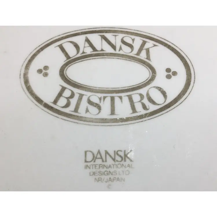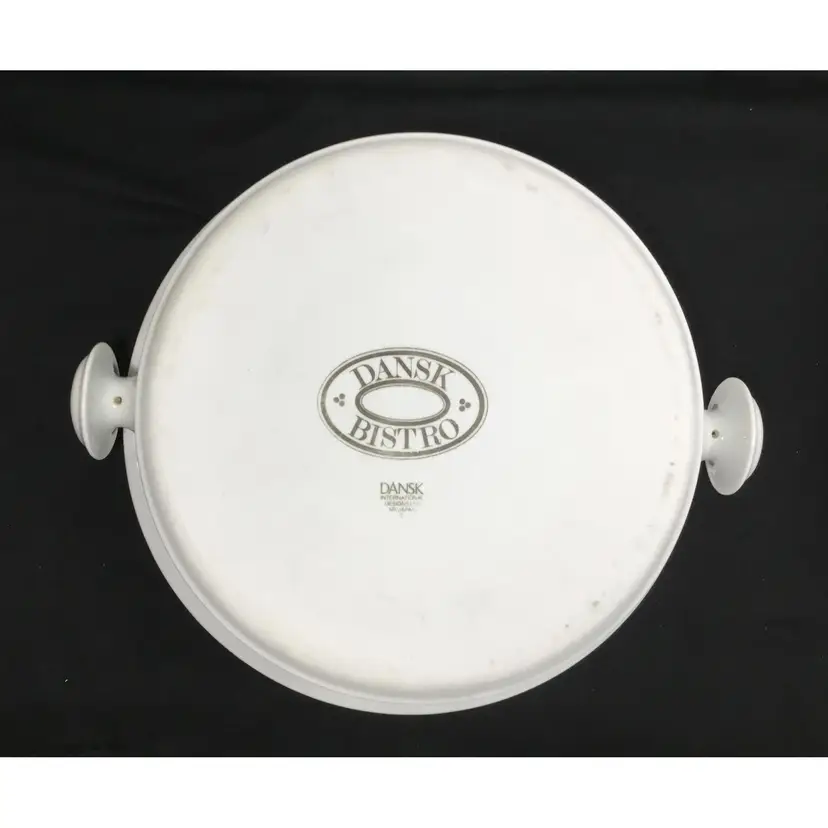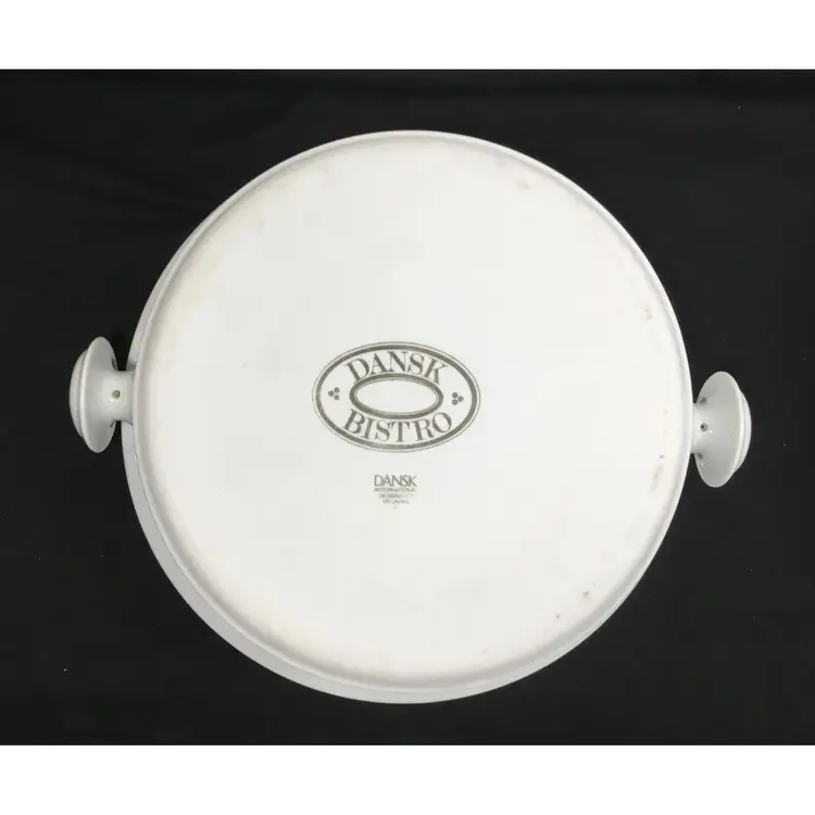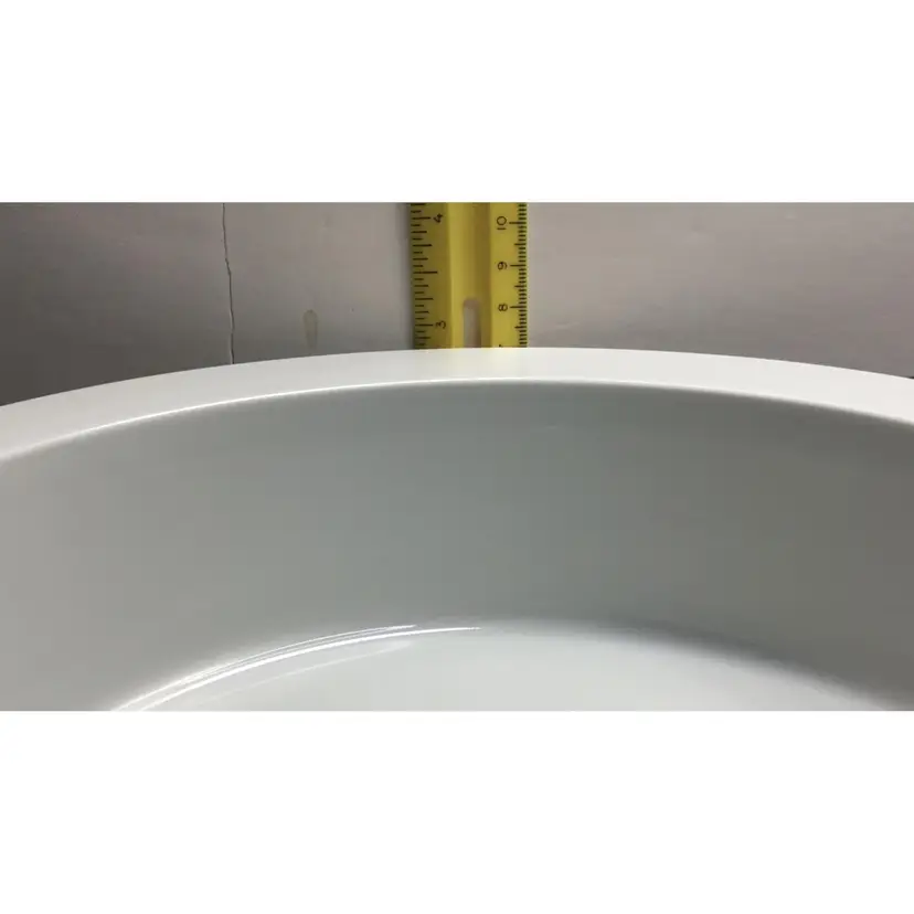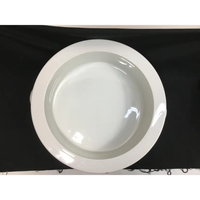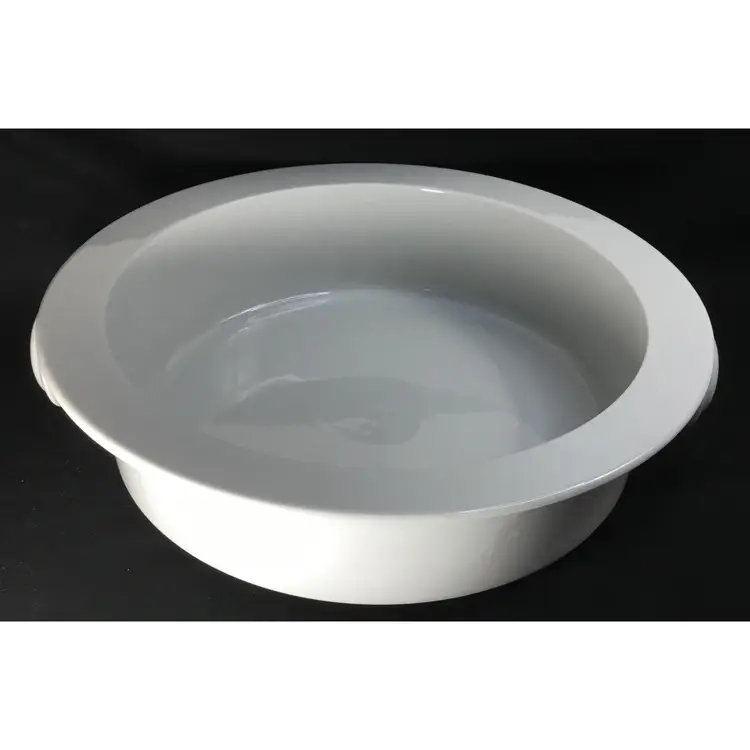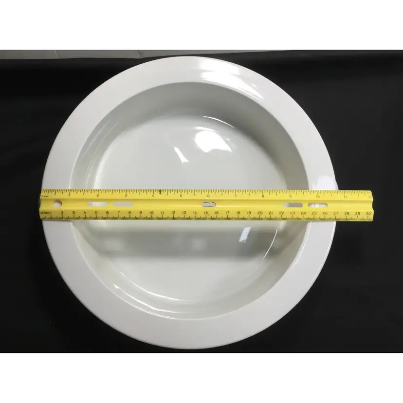 8.75 inches wide opening with 1 inch wide rim all around. 2.75 inches deep. Round, white ceramic. Peg-like round handles on opposite sides. Light wear on non-glazed bottom. Very good condition.
