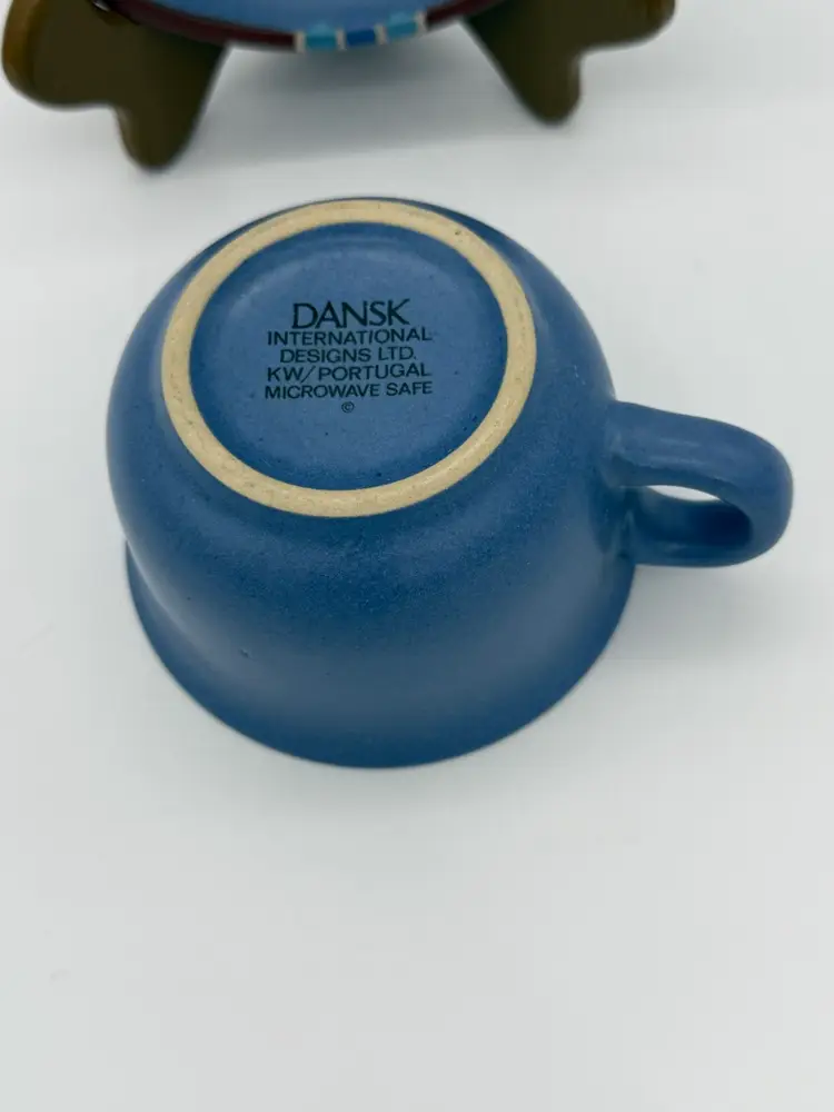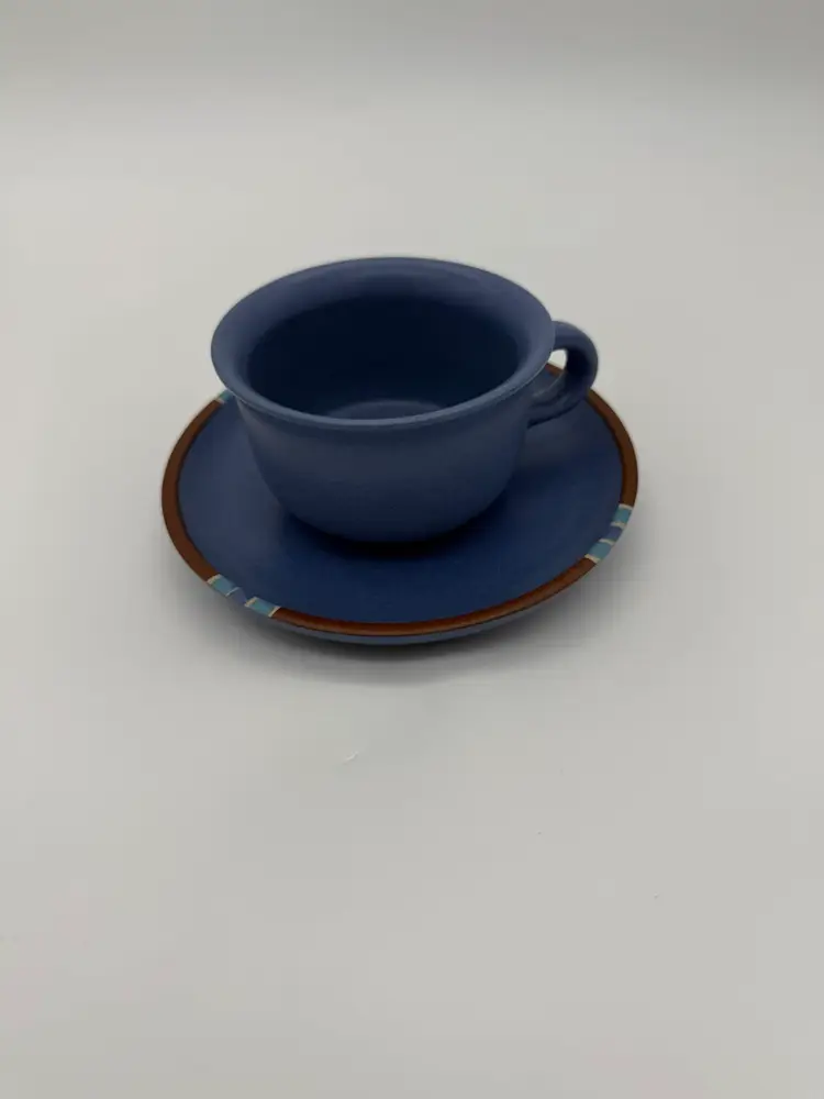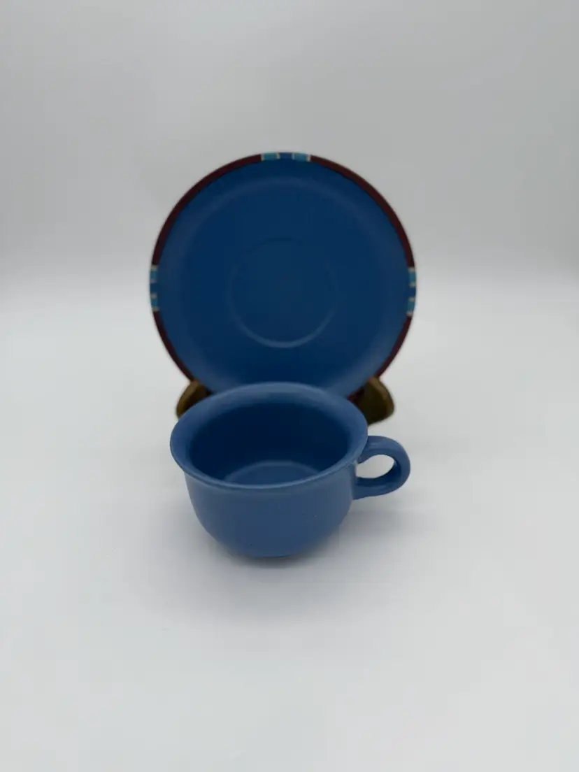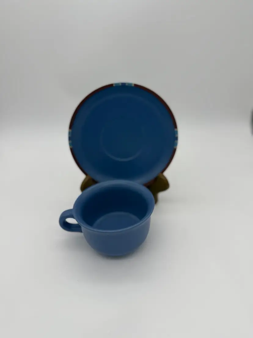 The DANSK International Designs LTD. Mesa Blue Coffee Cup & Saucer Set is a stylish and contemporary two-piece set made of stoneware. With a glossy finish and a capacity of 8 oz, this set features a round shape and decorative South Western design in blue, white, sky blue, and brown colors. The stackable and microwave-safe cups and saucers are a discontinued and retired production from 1990-1999, showcasing an art pottery production style. The set includes a coffee cup and saucer with dimensions of 2.5” and 1” in height, and 4-1/4” and 6.5” in diameter, respectively.